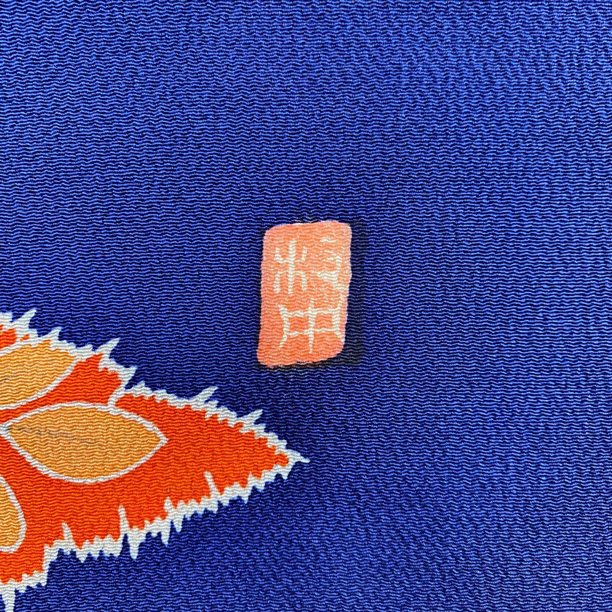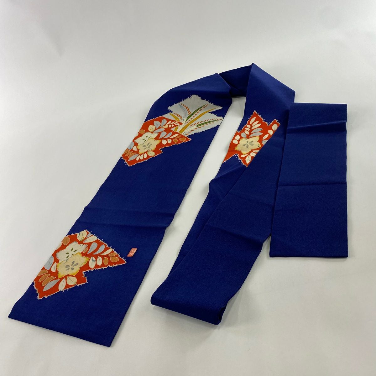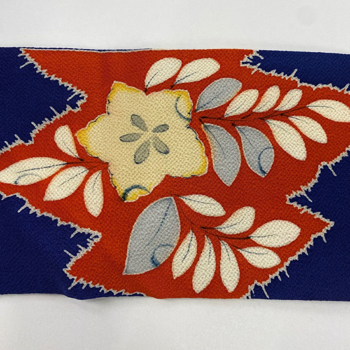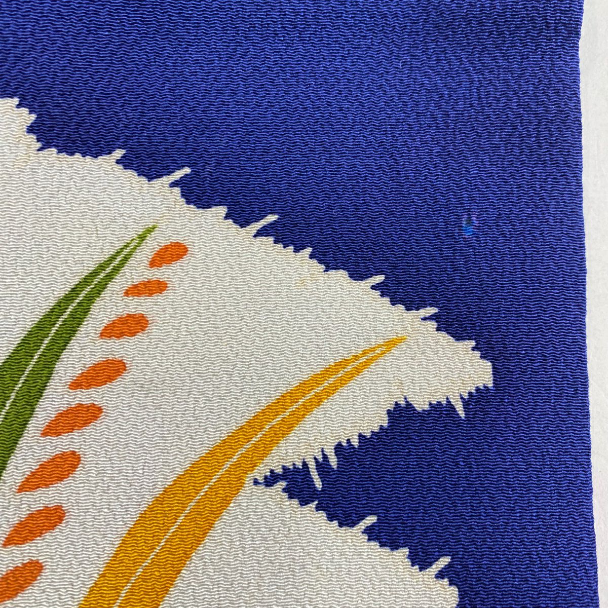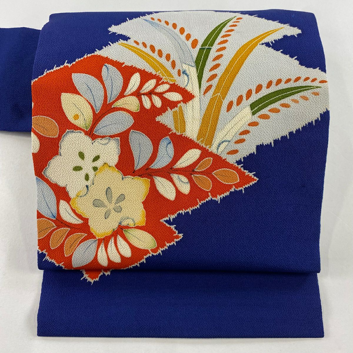 【在庫一掃】 名古屋帯 秀品 落款あり 松皮菱 草花 縮緬 青紫 正絹