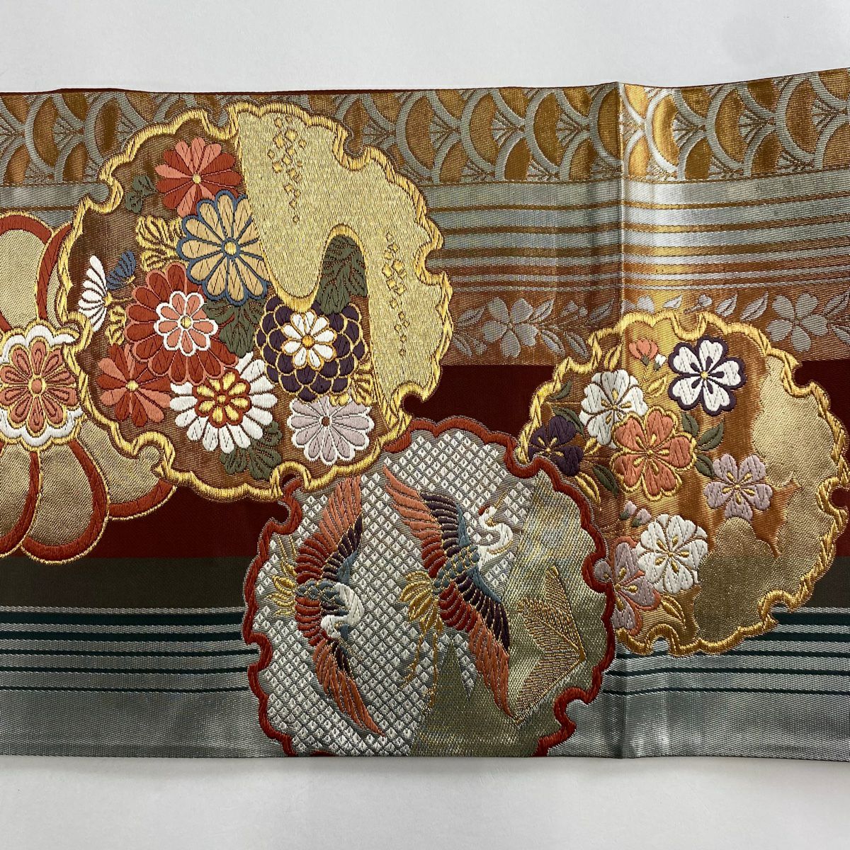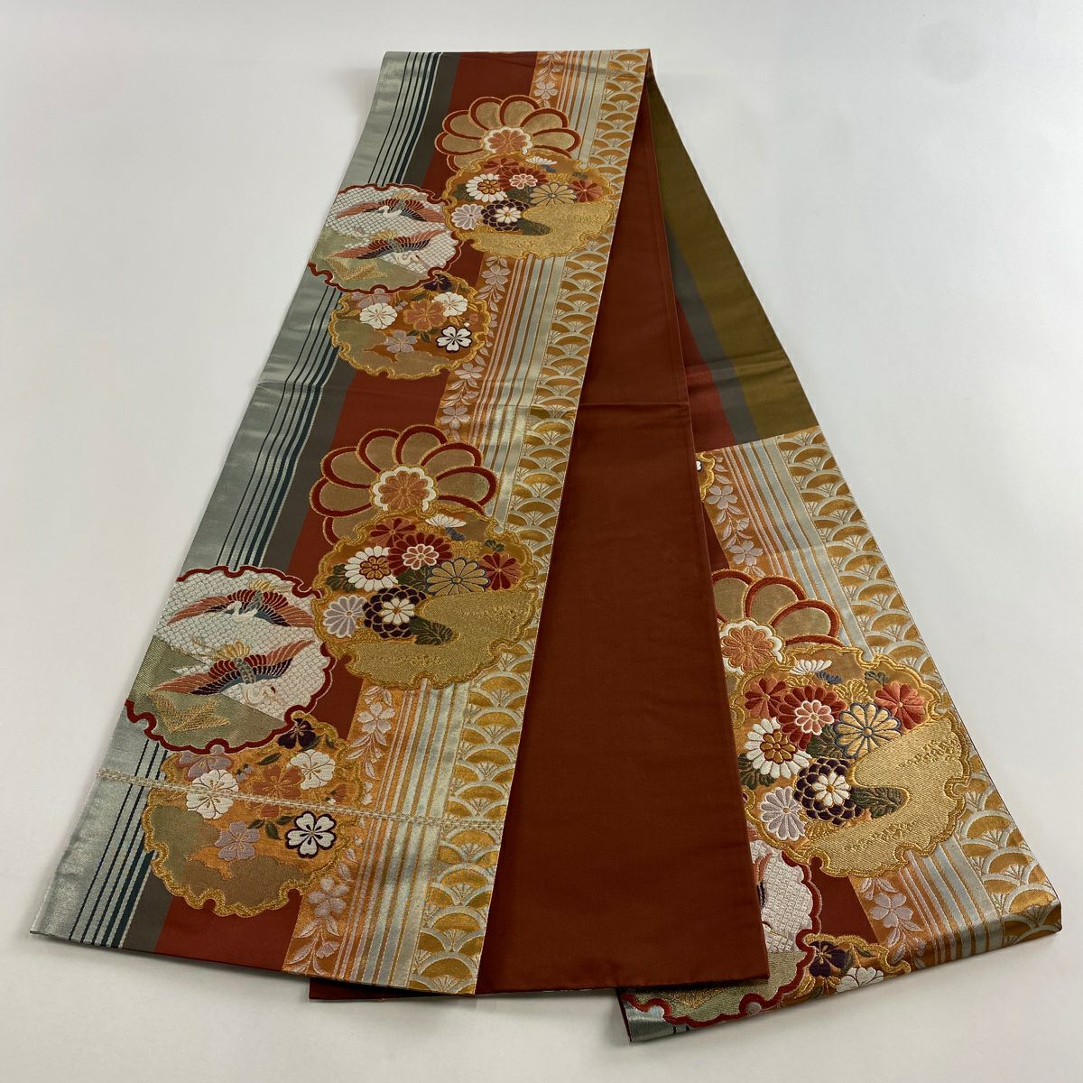 【在庫一掃】 【美品】 袋帯 秀品 雪輪 鶴 金糸 箔 赤茶 六通 正絹