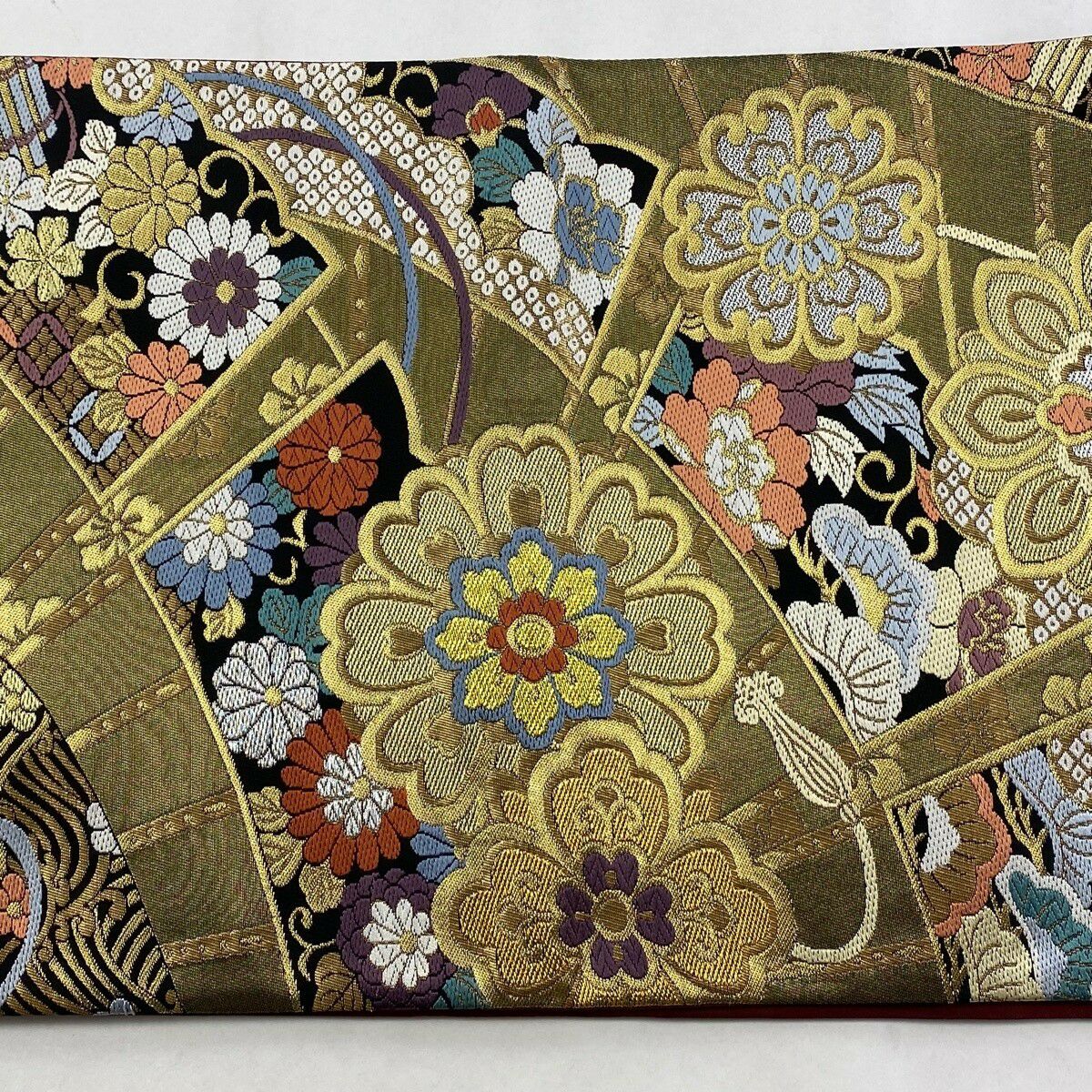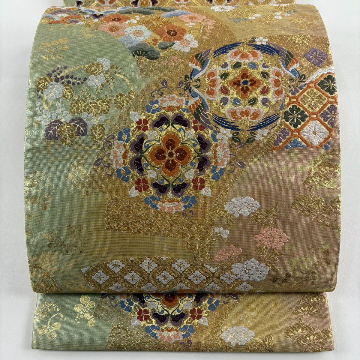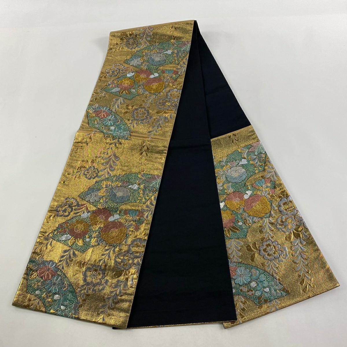 【在庫一掃】 【美品】 袋帯 秀品 扇面 草花 金糸 箔 金色 六通 正絹