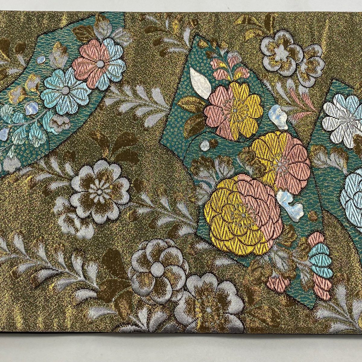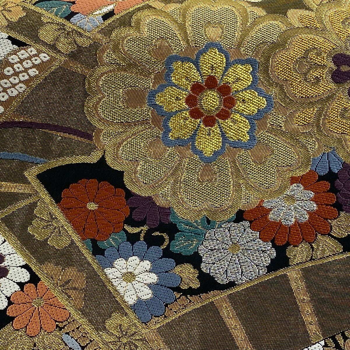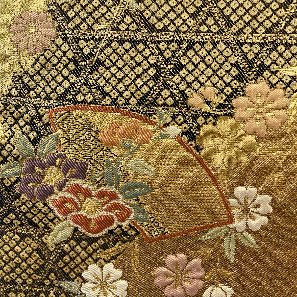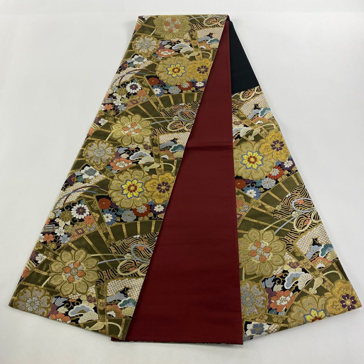 【在庫一掃】 【美品】 袋帯 秀品 扇面 草花 金糸 箔 金色 六通 正絹