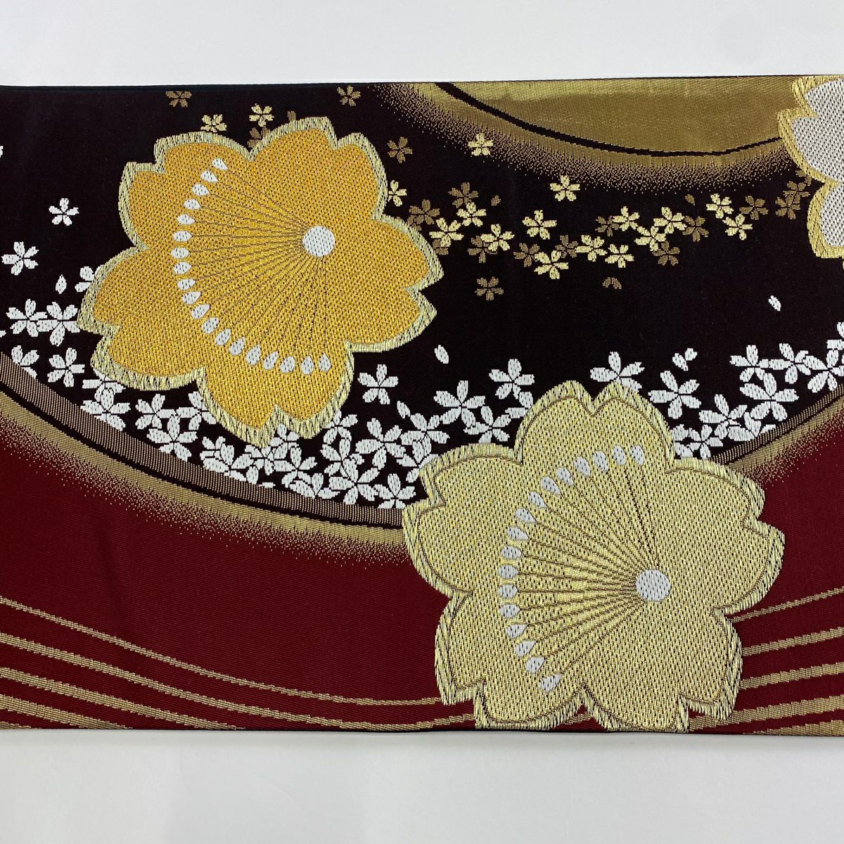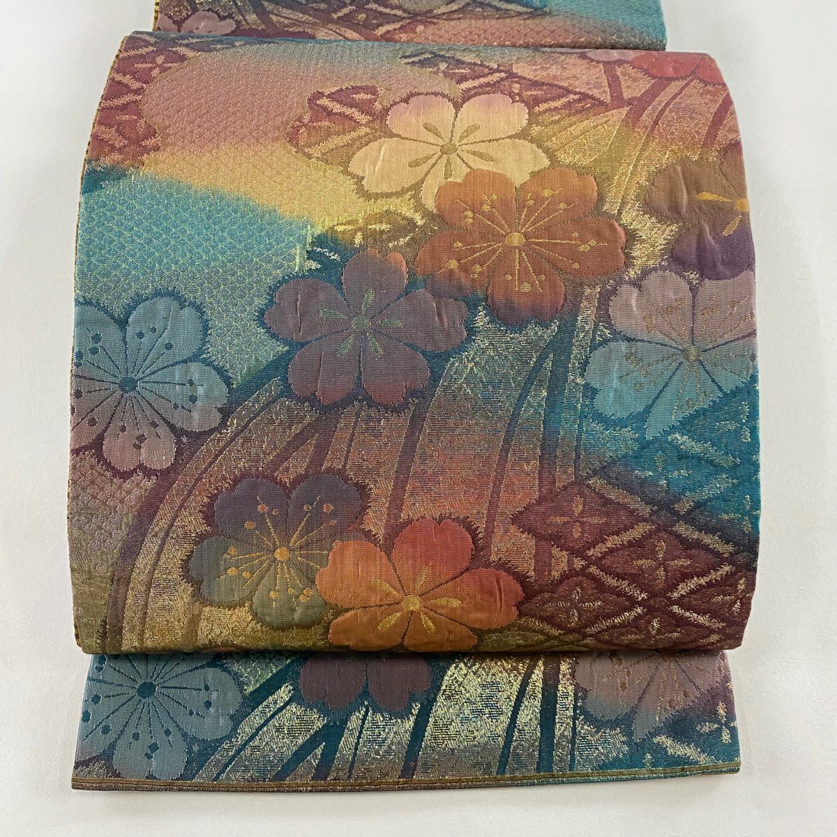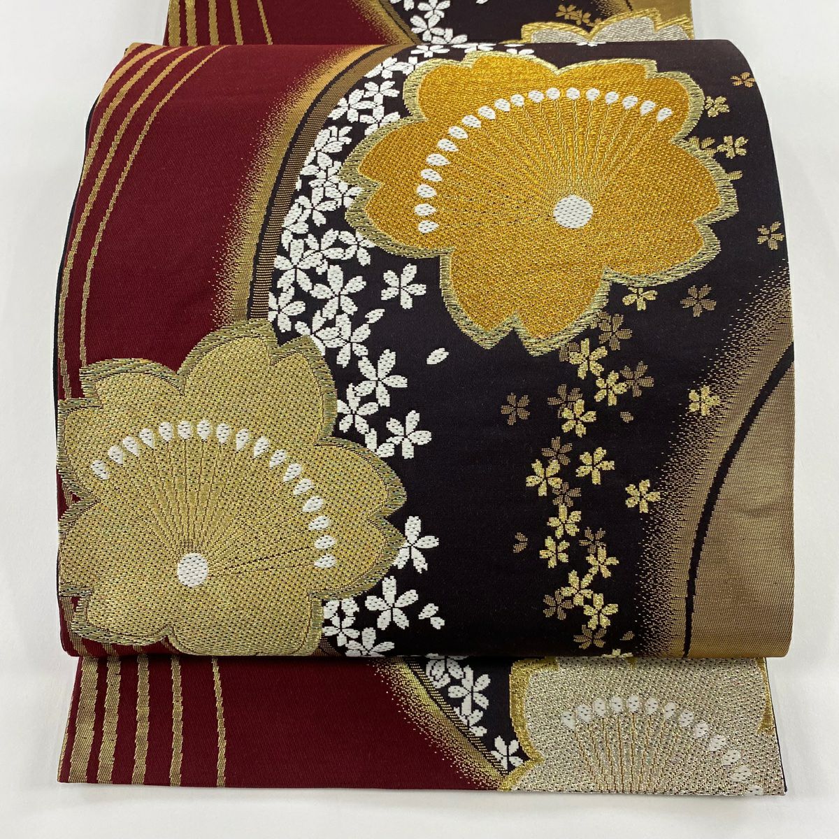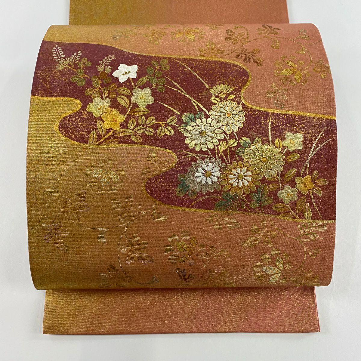 【在庫一掃】 【美品】 袋帯 秀品 桜 波 箔 ぼかし 赤茶 六通 正絹