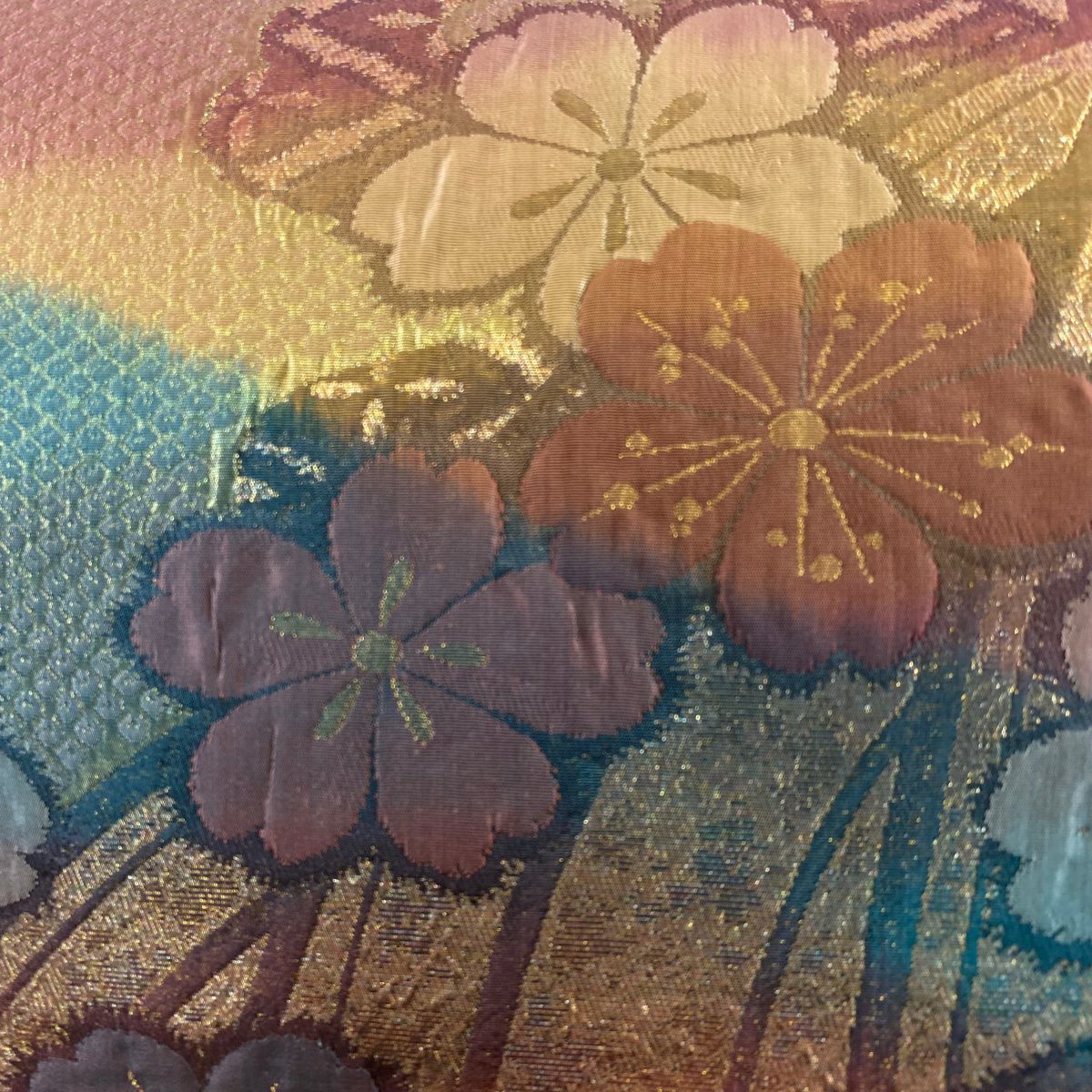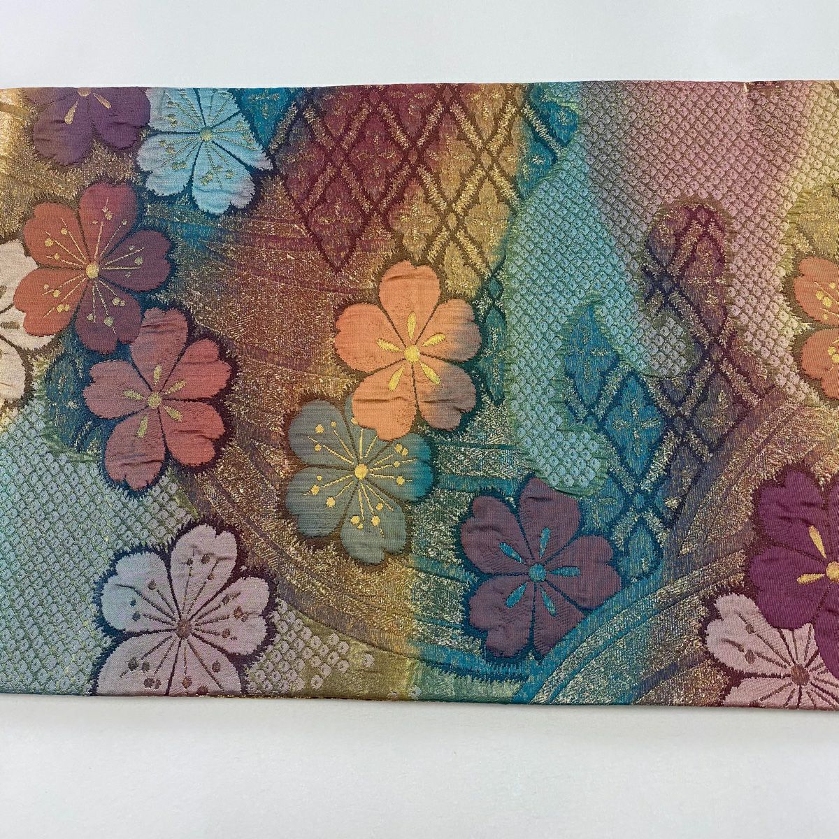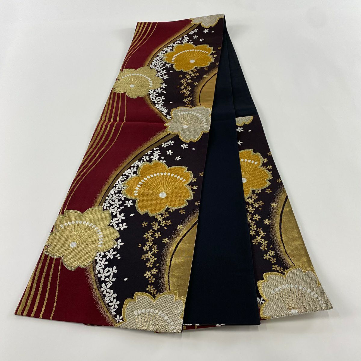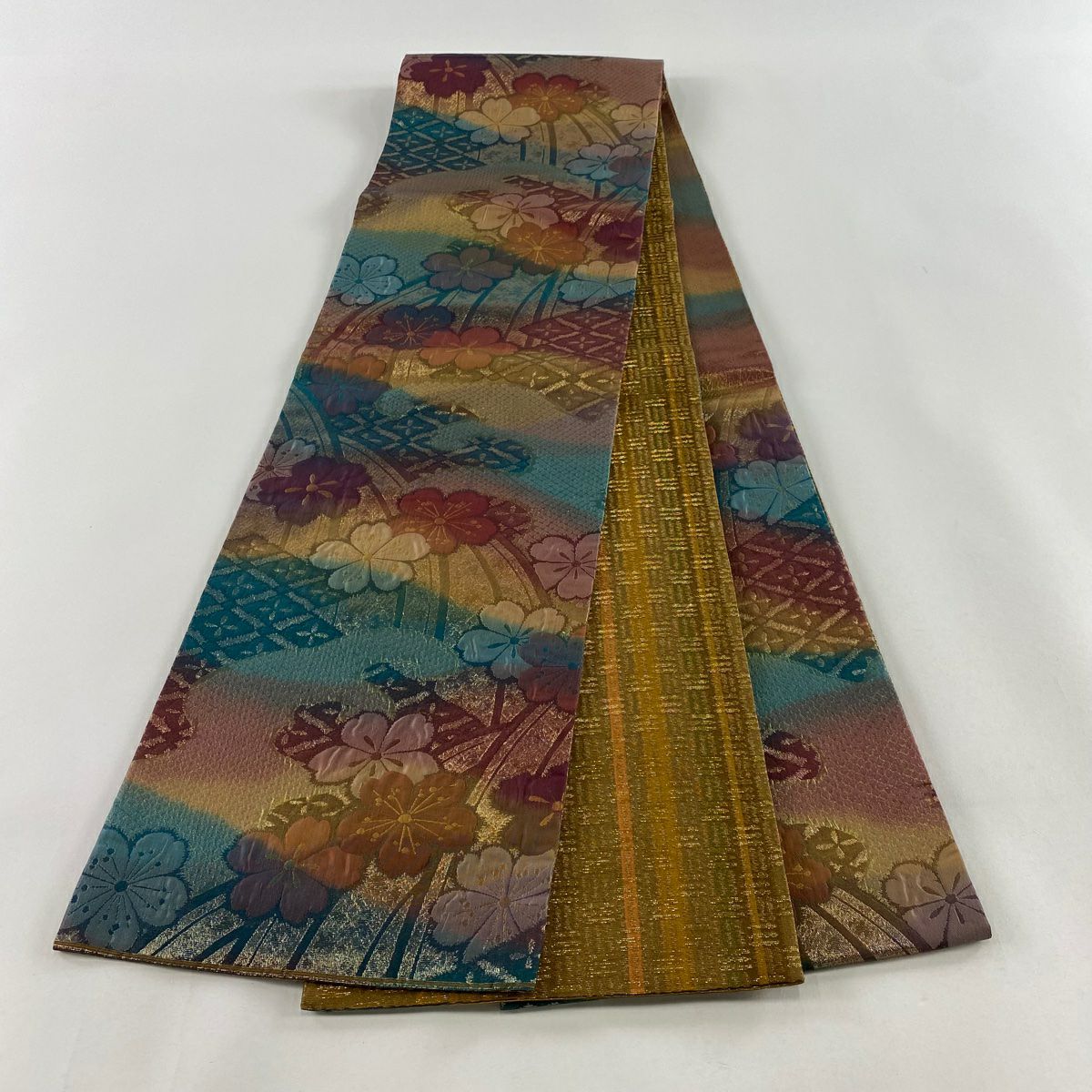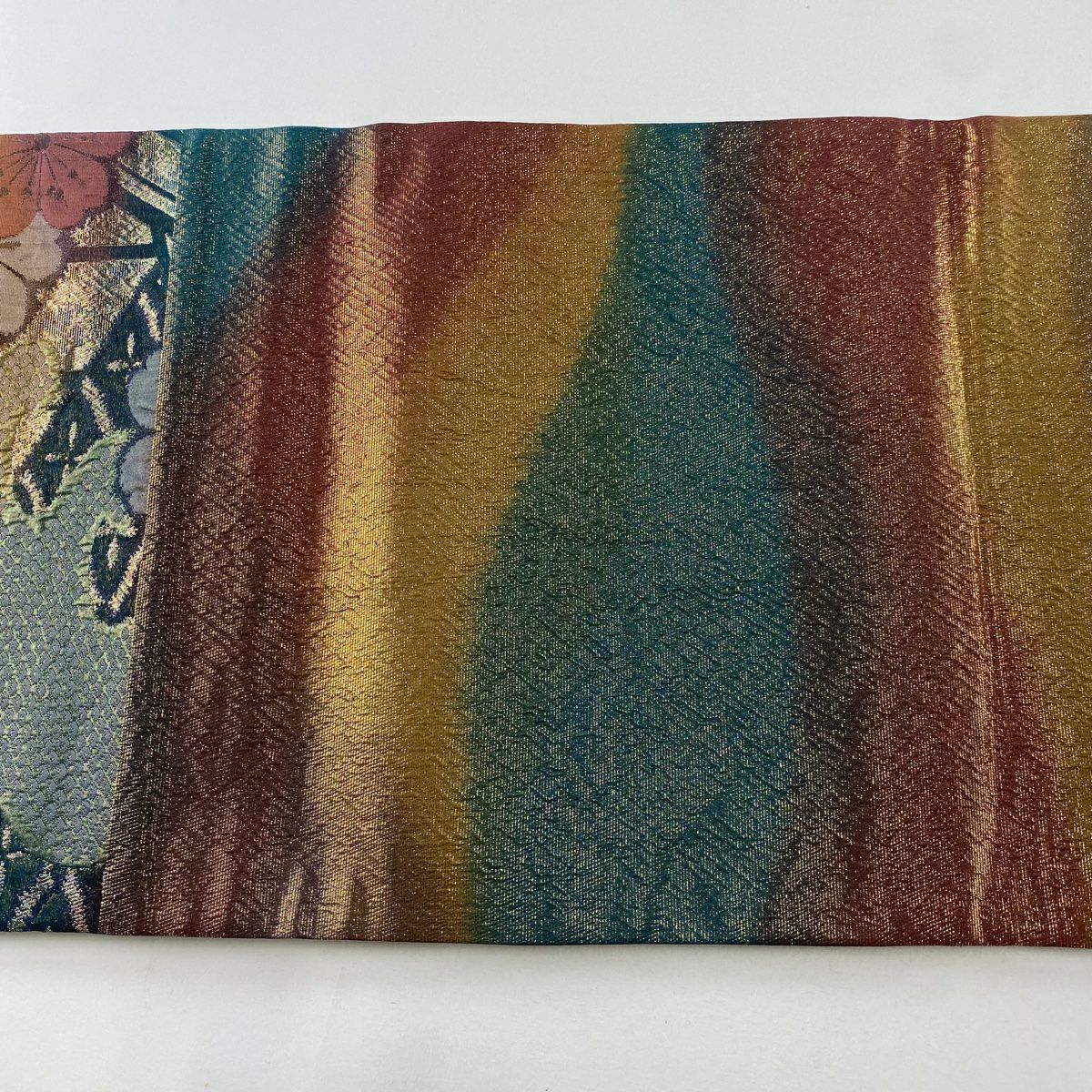 【在庫一掃】 【美品】 袋帯 秀品 桜 波 箔 ぼかし 赤茶 六通 正絹
