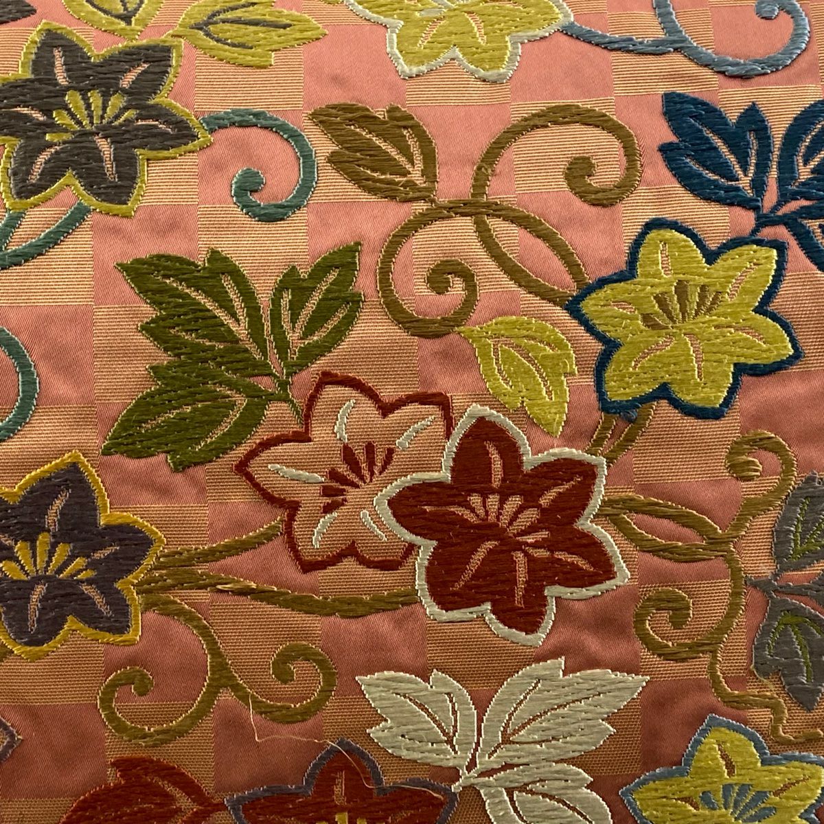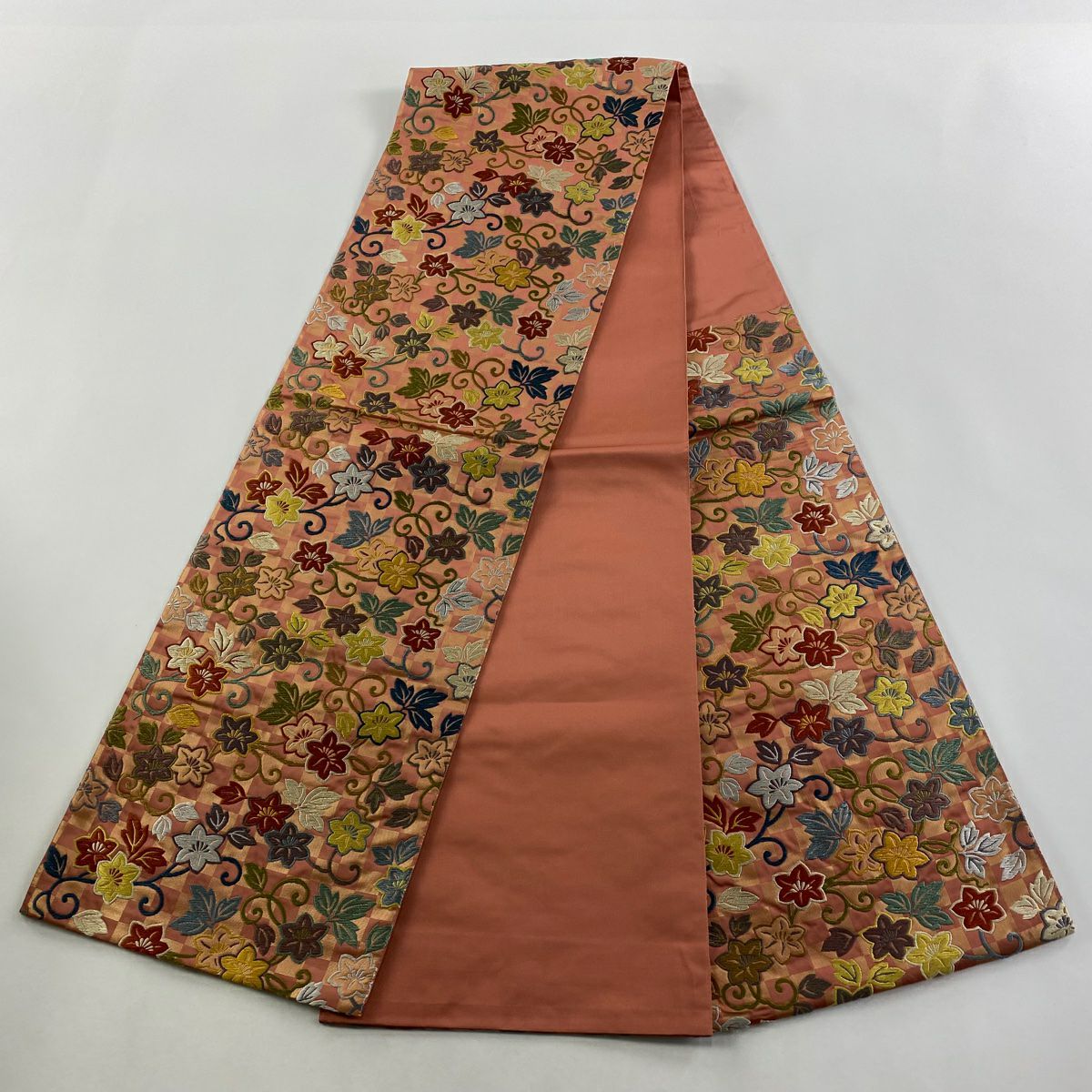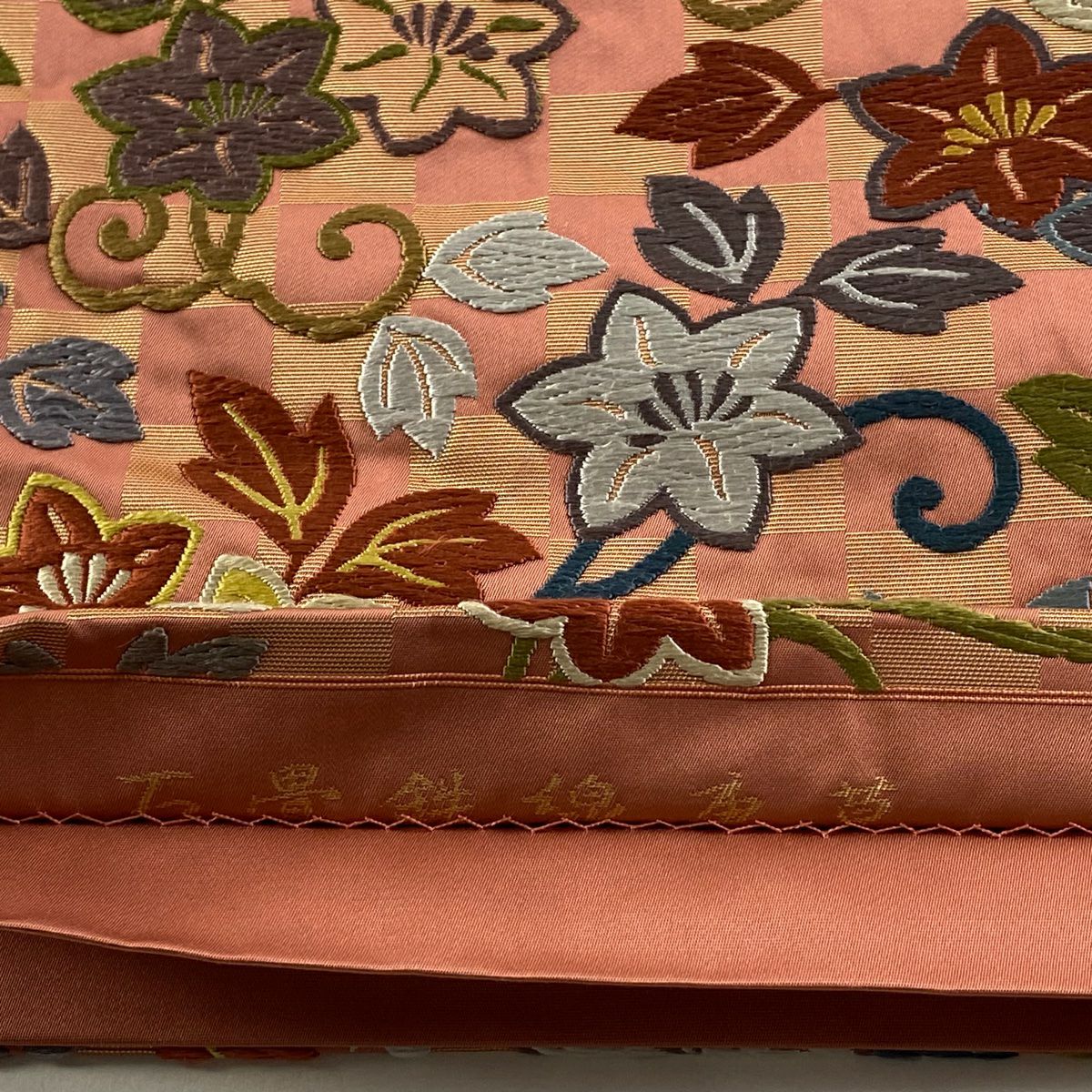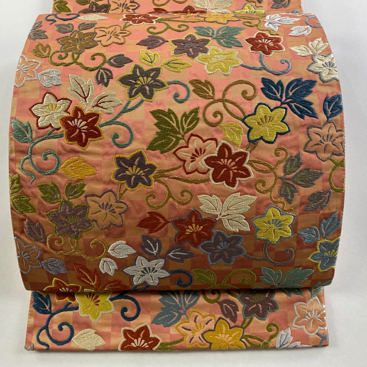 【在庫一掃】 袋帯 秀品 花唐草 市松 刺繍 箔 ピンク 六通 正絹