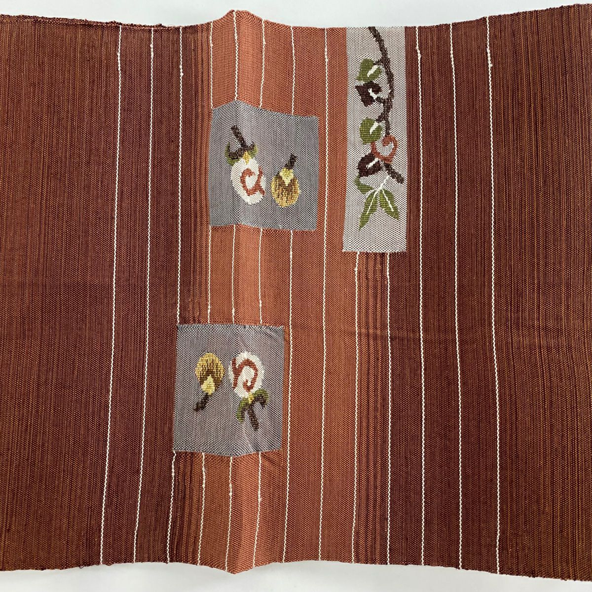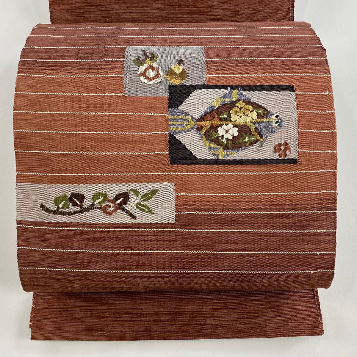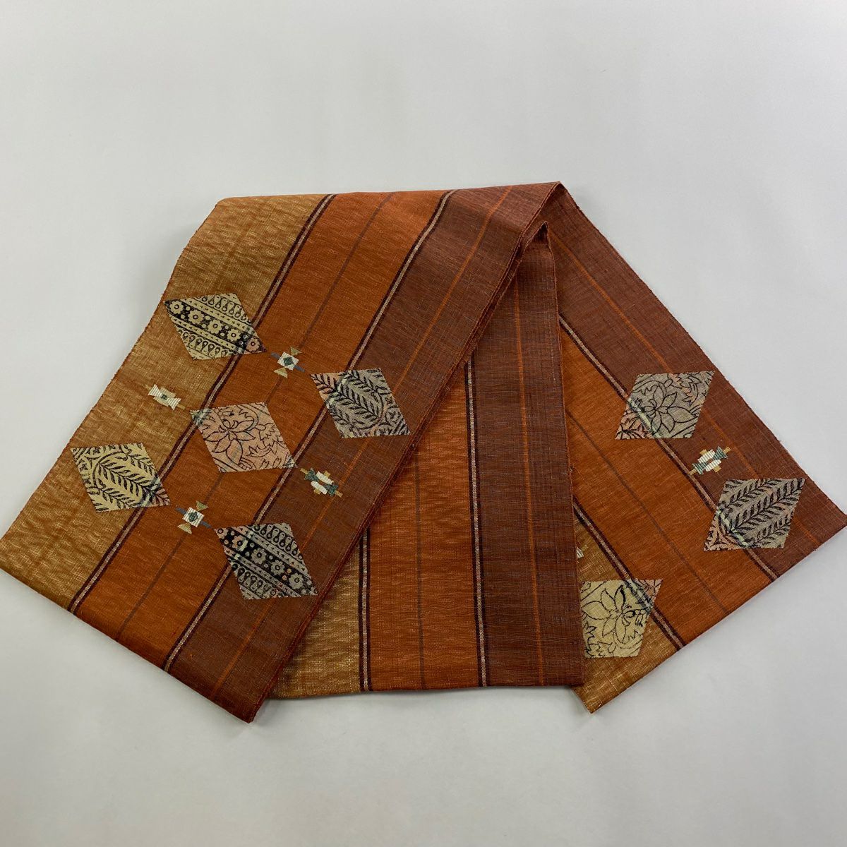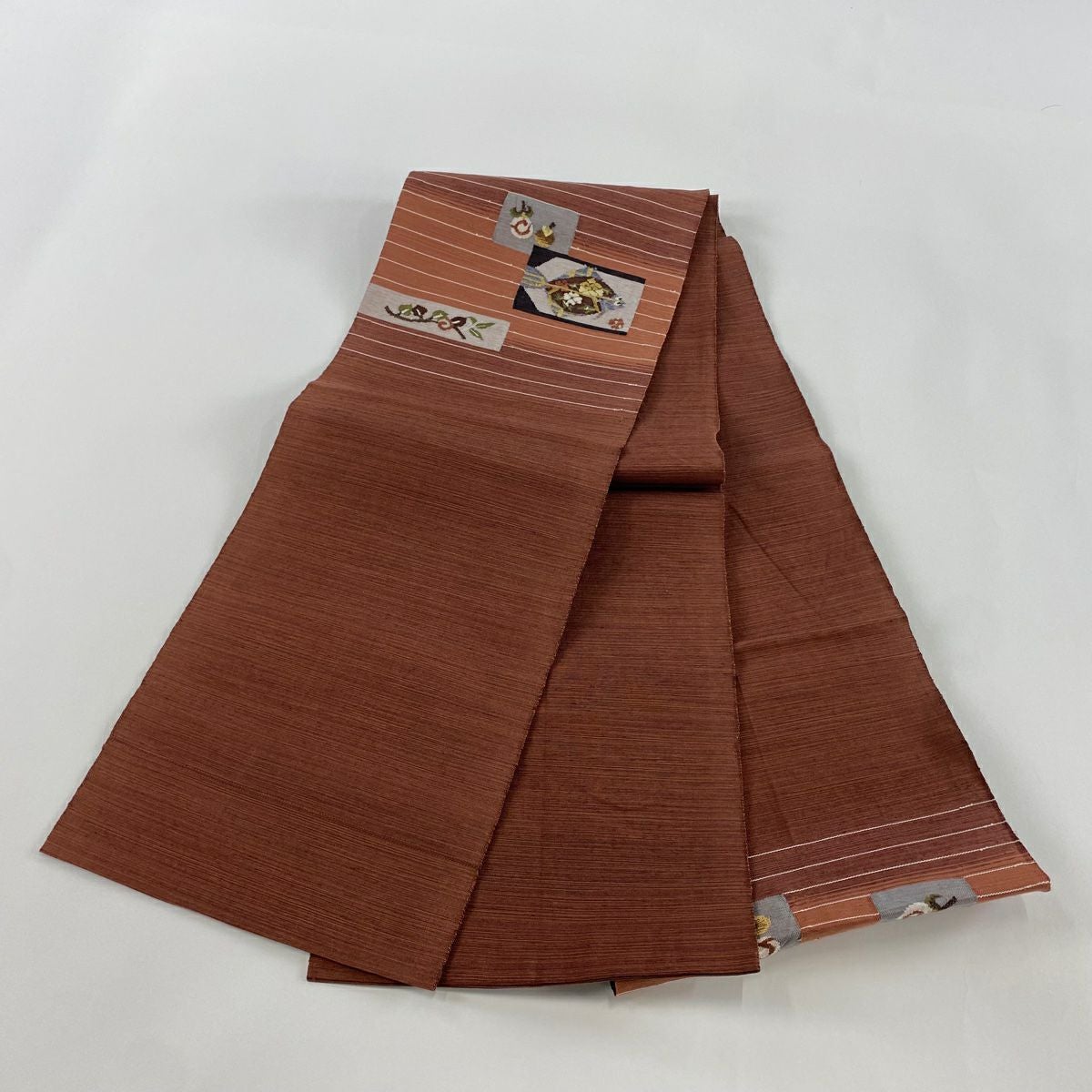 【在庫一掃】 【美品】 名古屋帯 秀品 紬地 草花 縞 刺繍 茶色 正絹