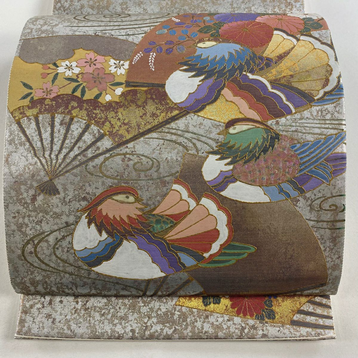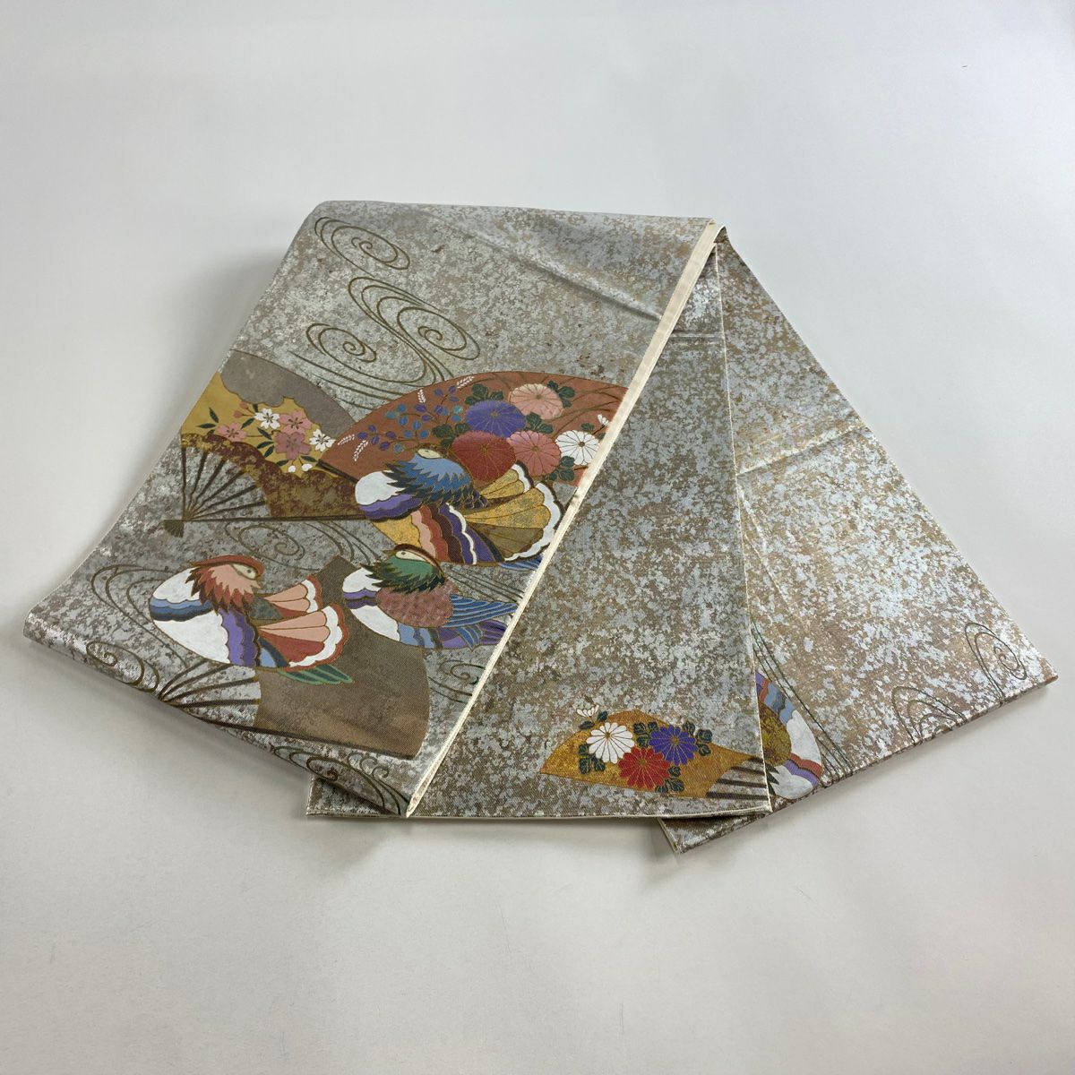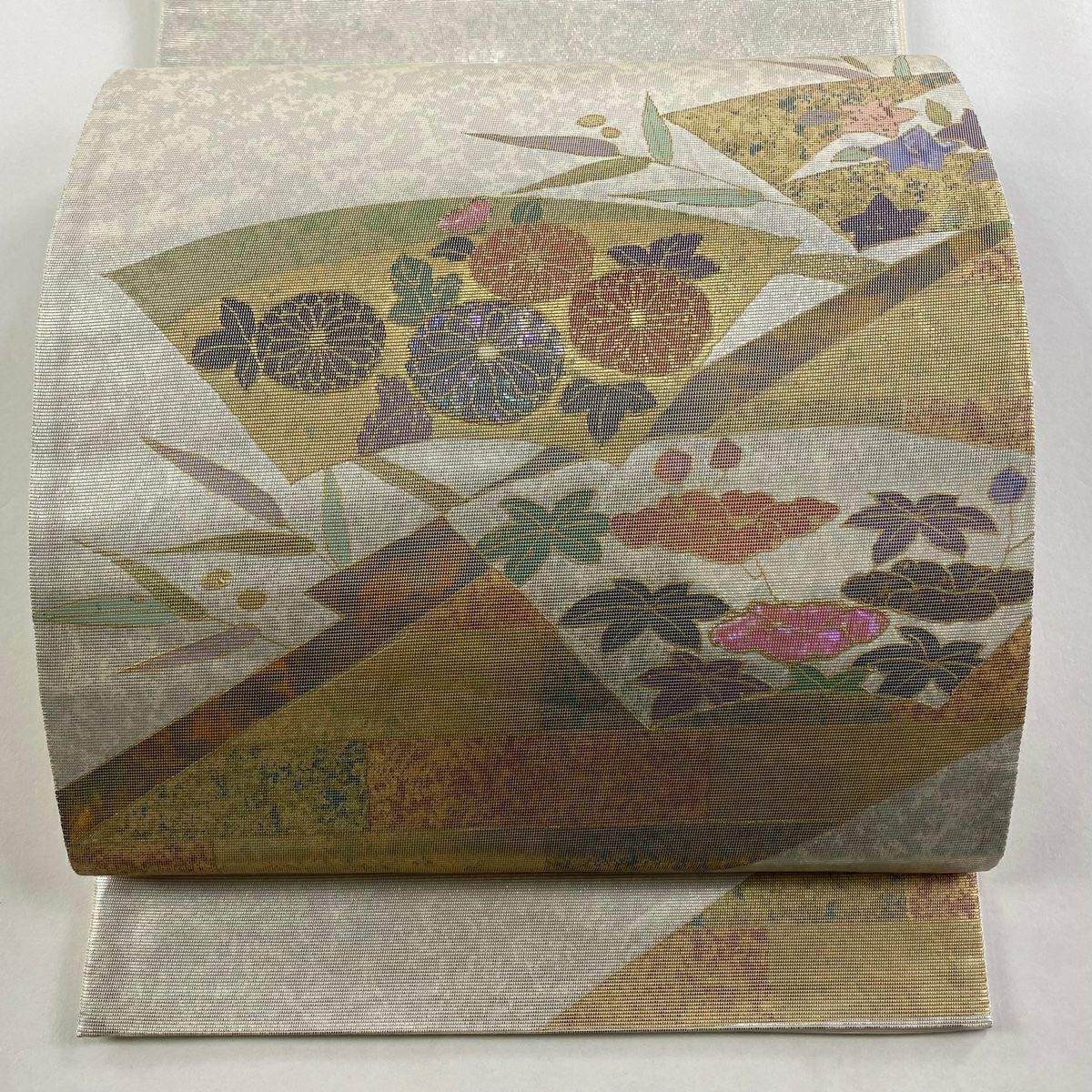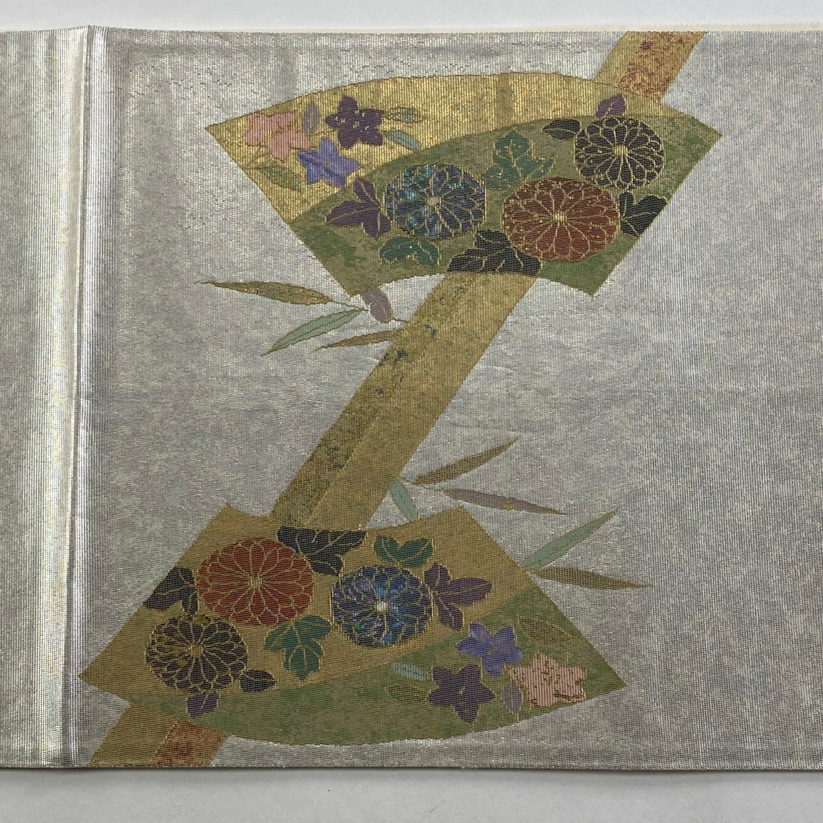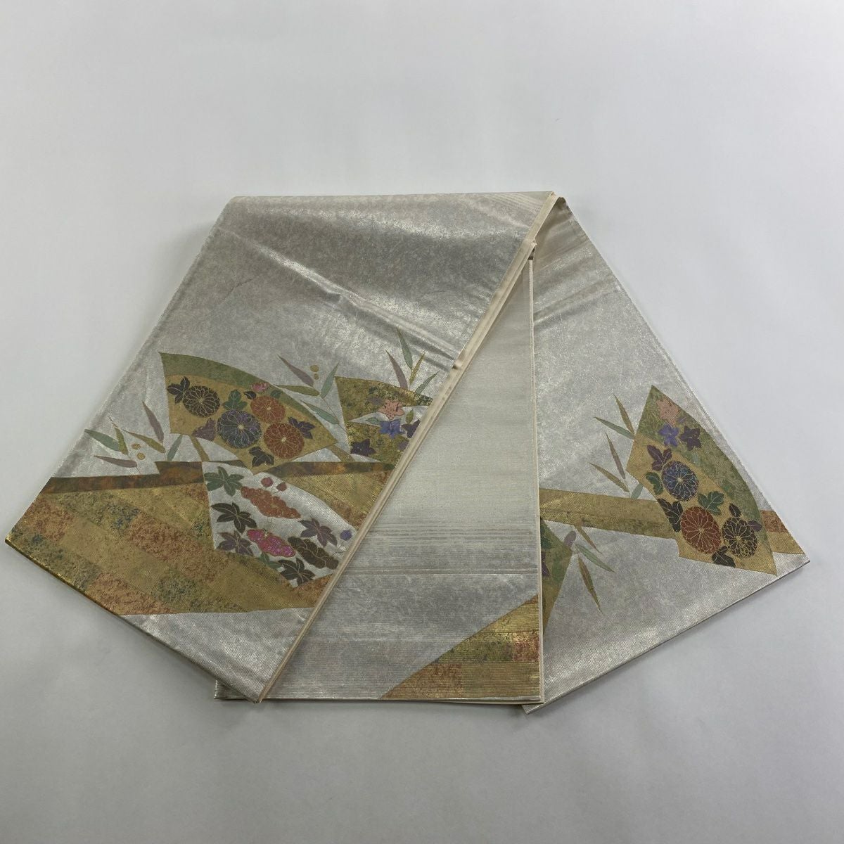 【在庫一掃】 袋帯 秀品 扇面 草花 螺鈿箔 箔 銀色 お太鼓柄 正絹