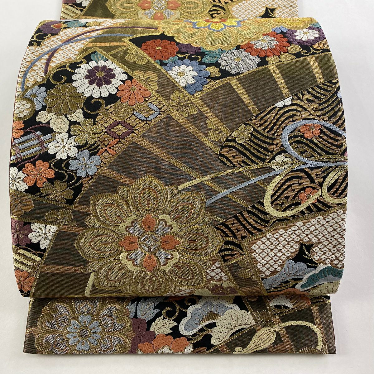 【在庫一掃】 【美品】 袋帯 秀品 団扇 松竹梅 箔 焦茶色 六通 正絹