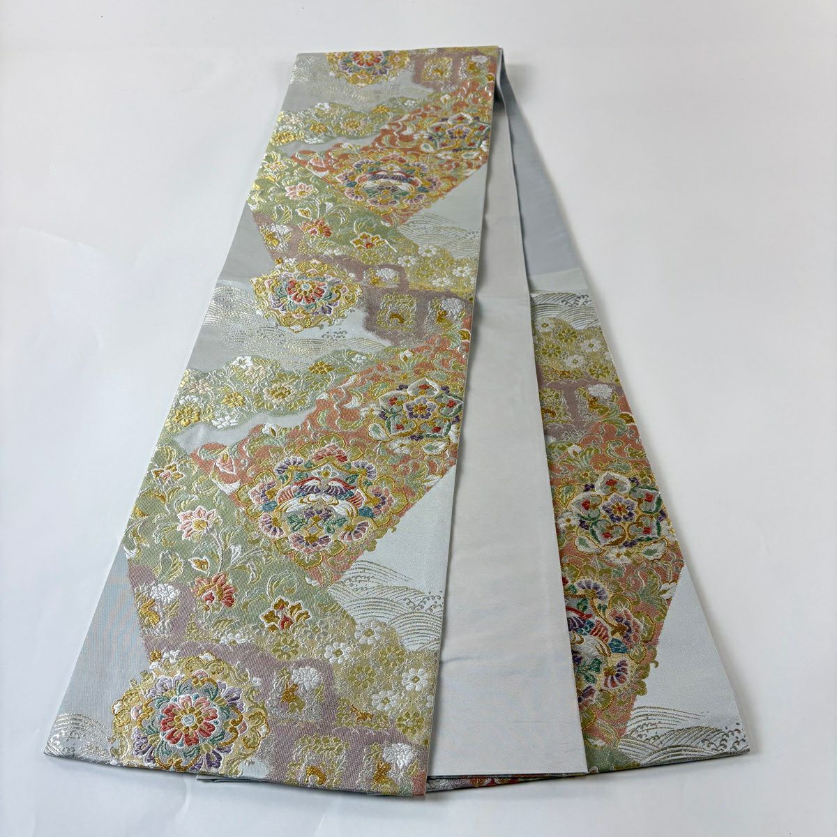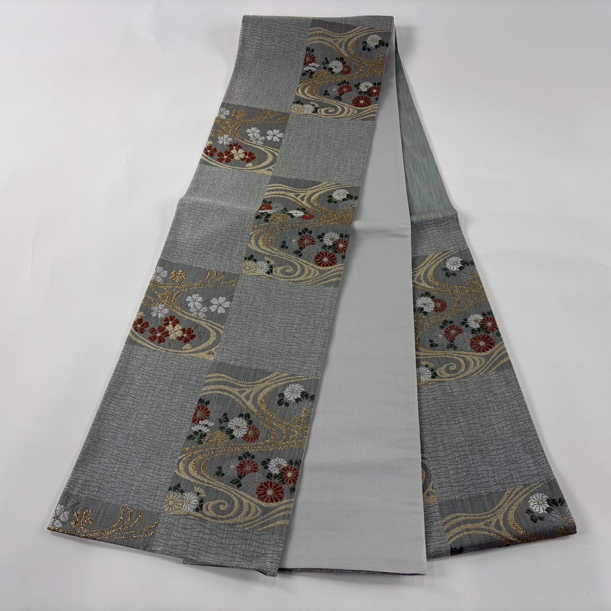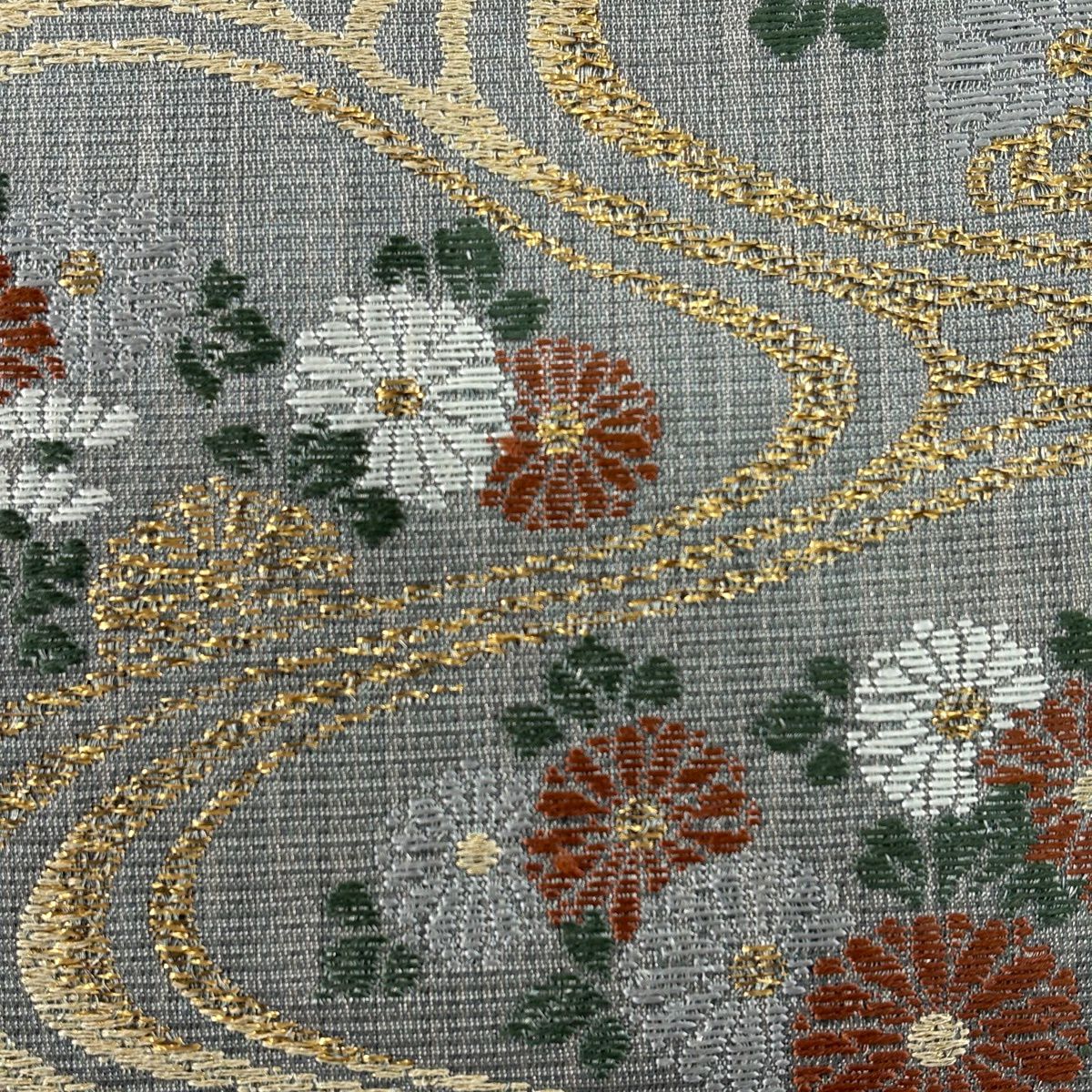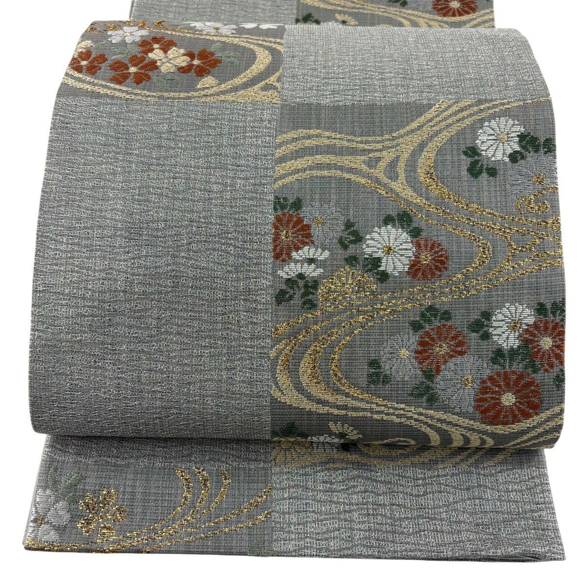 袋帯 秀品 証紙あり 草花 流水 銀糸 箔 灰色 六通 正絹
