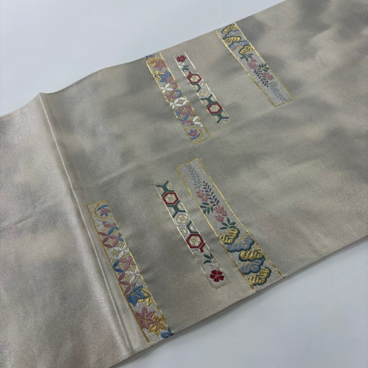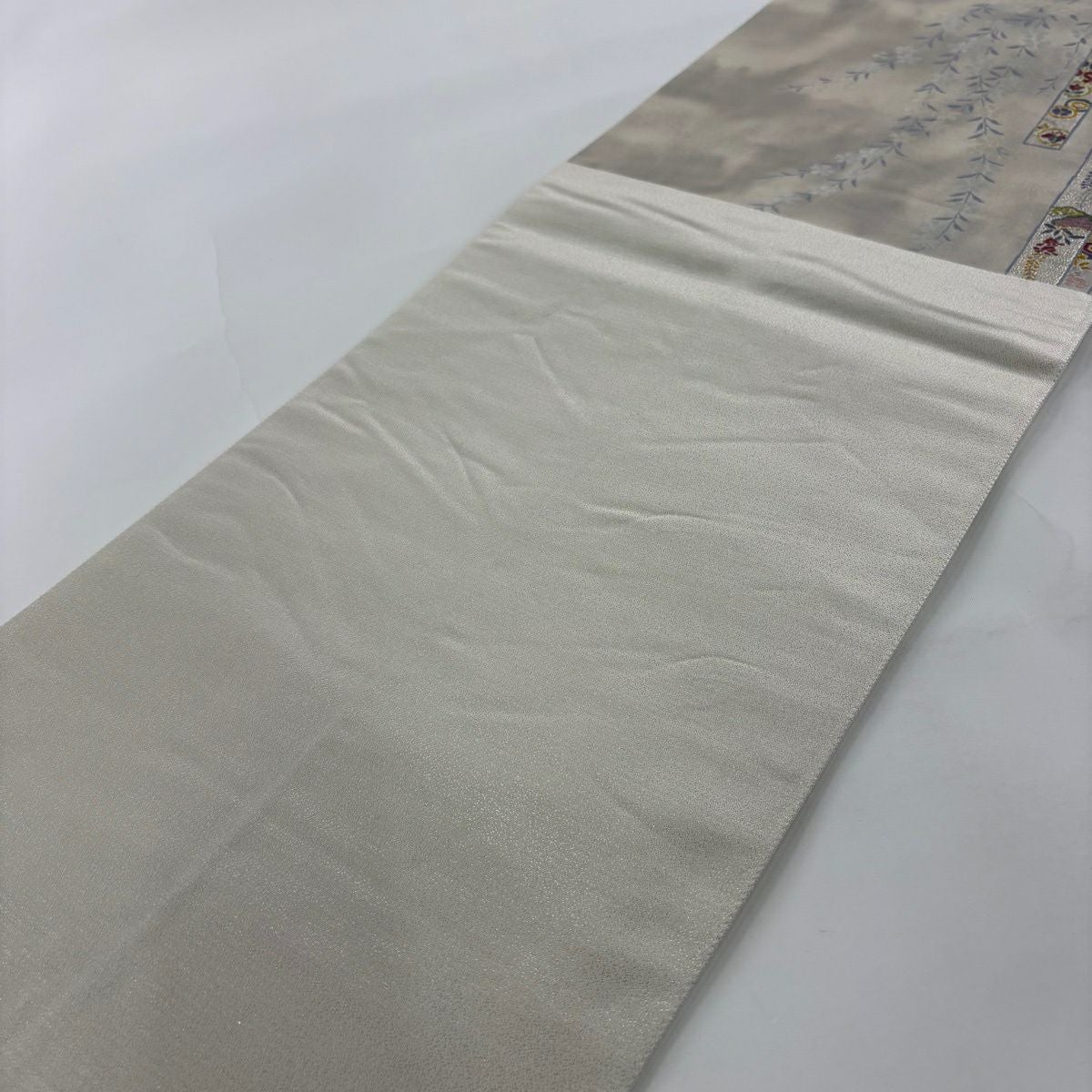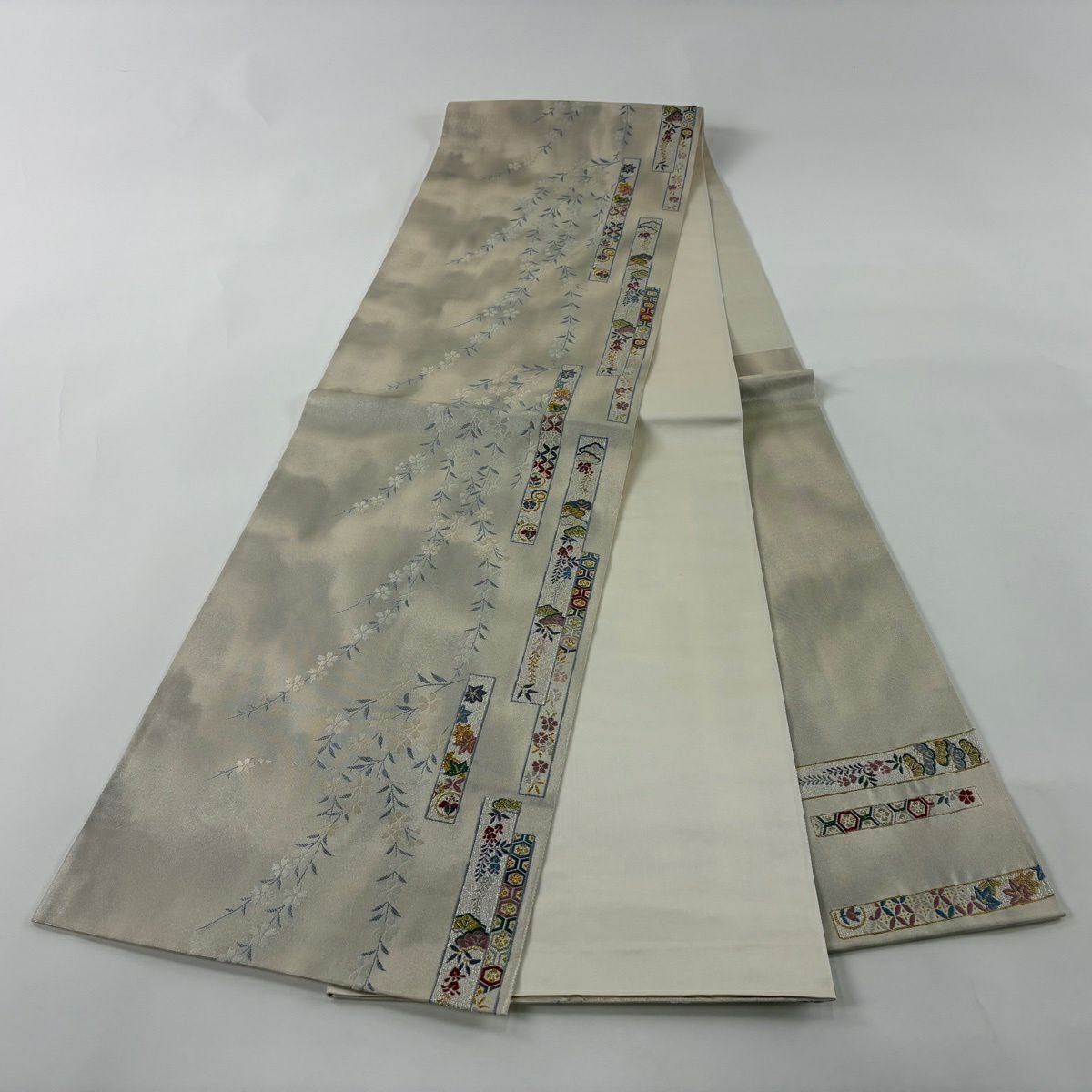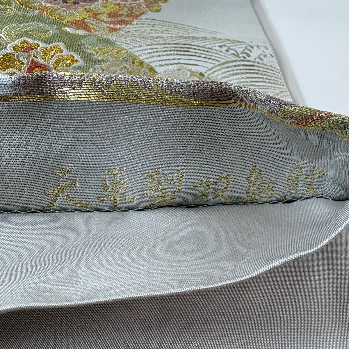 袋帯 秀品 証紙あり 草花 流水 銀糸 箔 灰色 六通 正絹