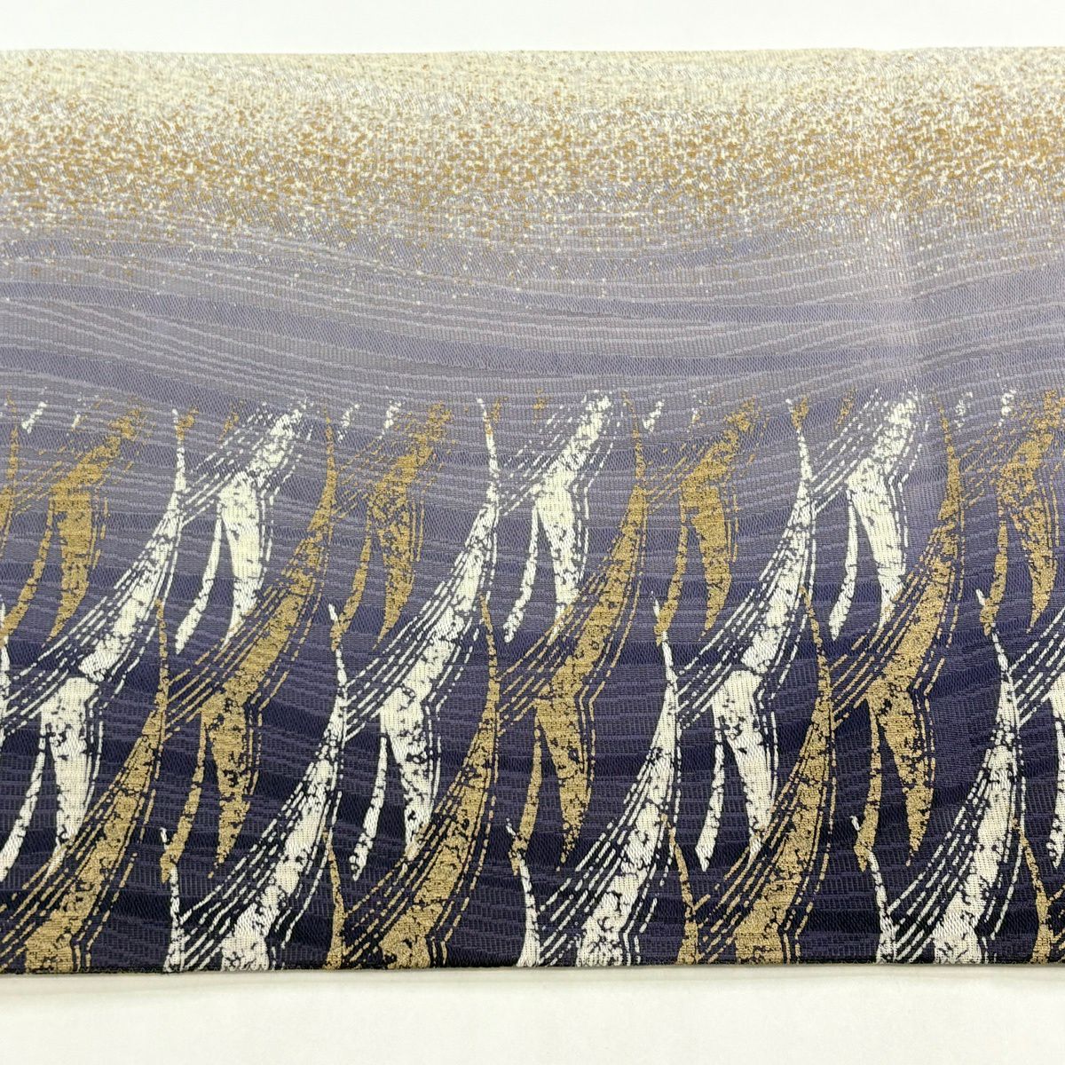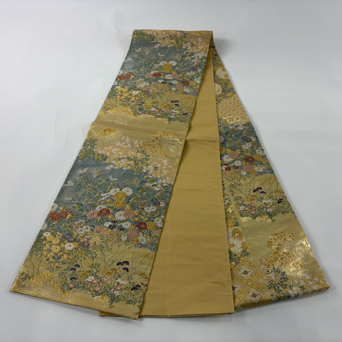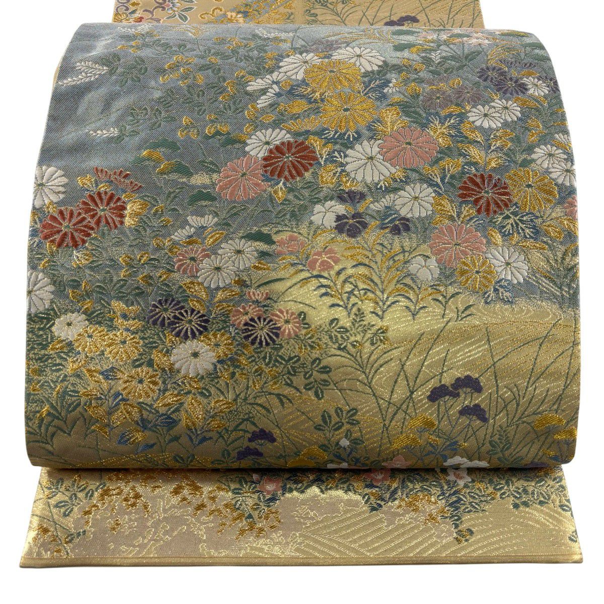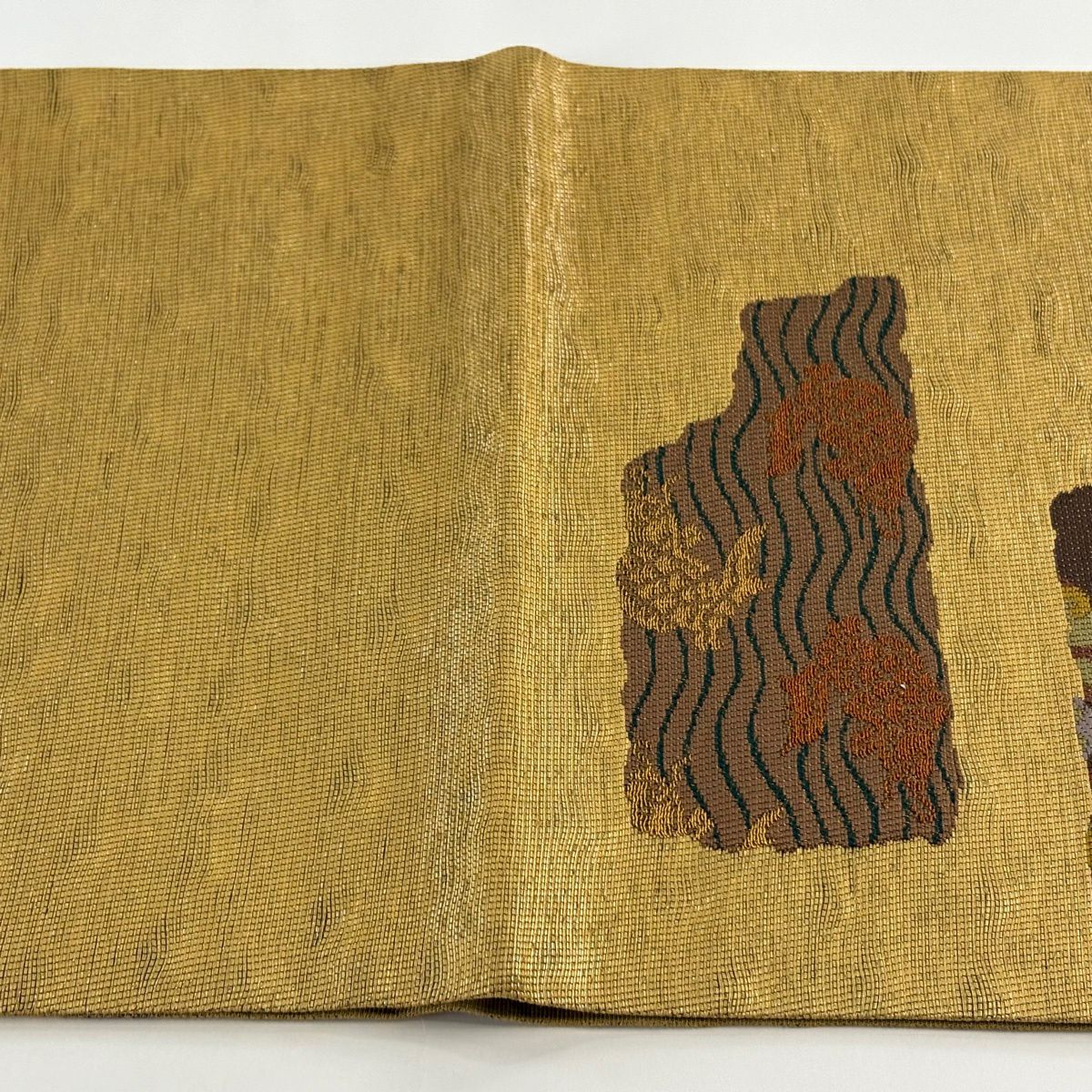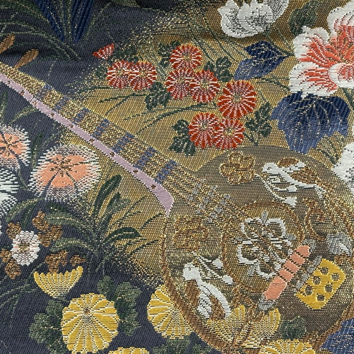 【美品】 袋帯 秀品 秋草 波 金糸 箔 金色 お太鼓柄 正絹