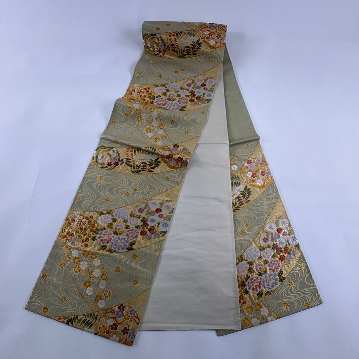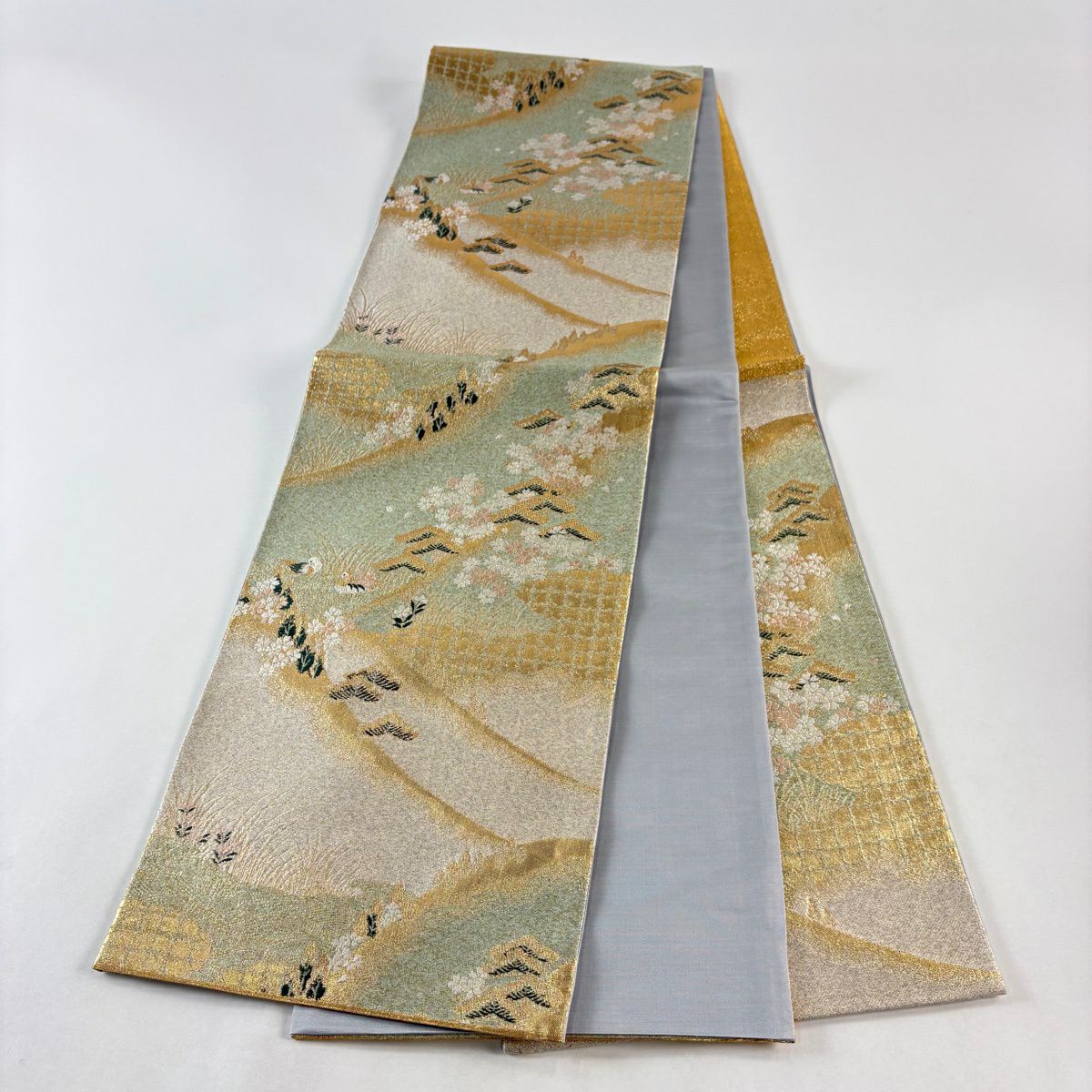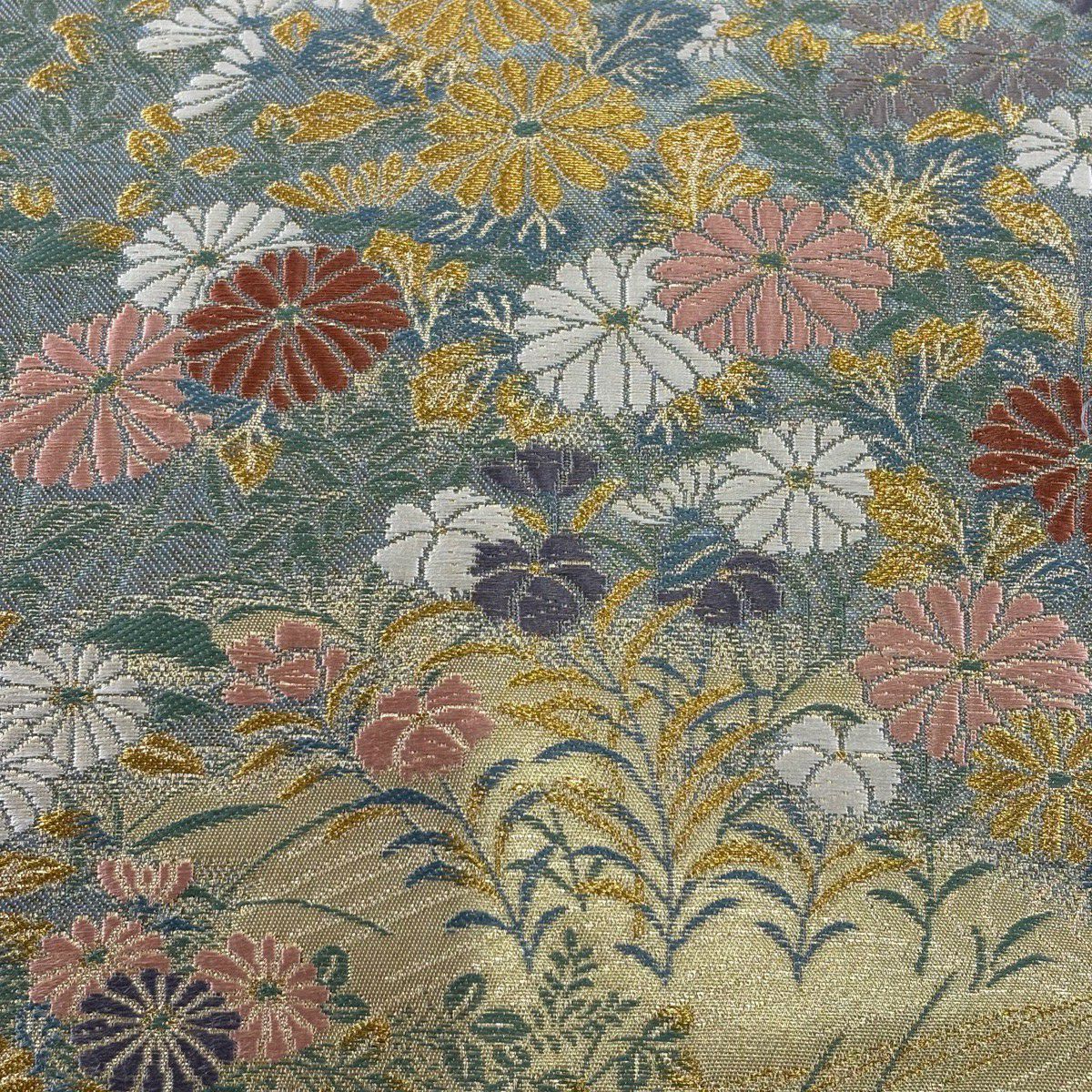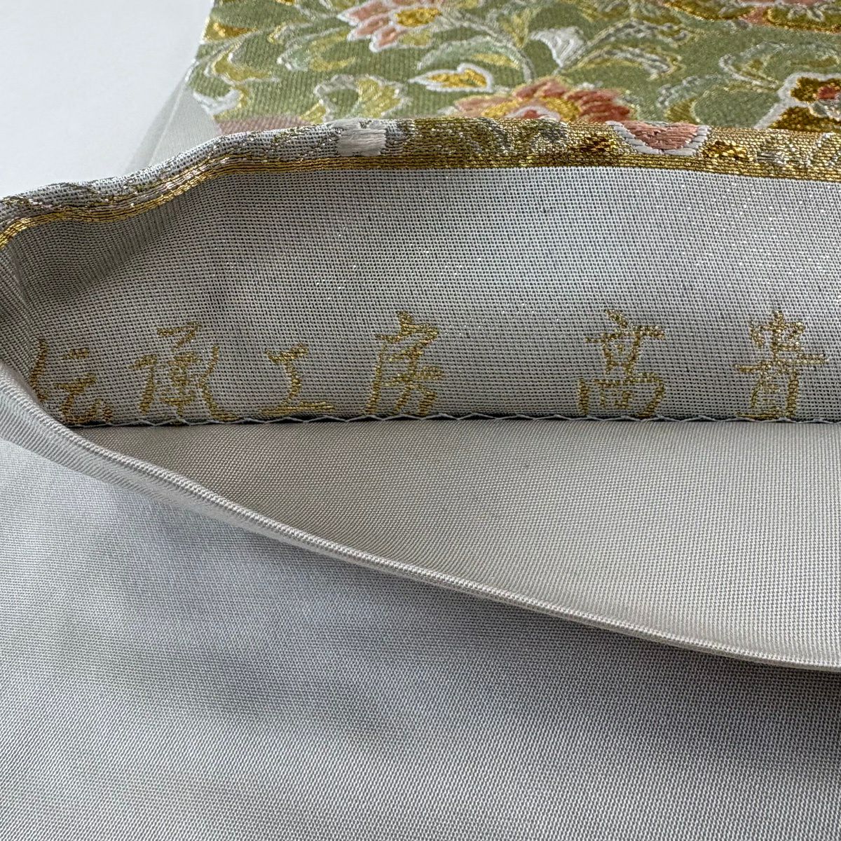 袋帯 秀品 彩花清流 草花 流水 箔 金糸 灰緑 六通 正絹