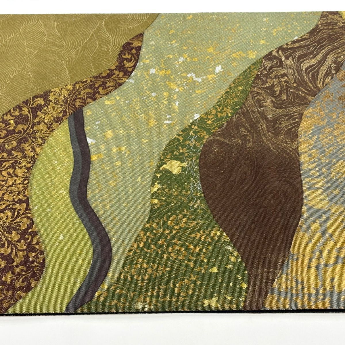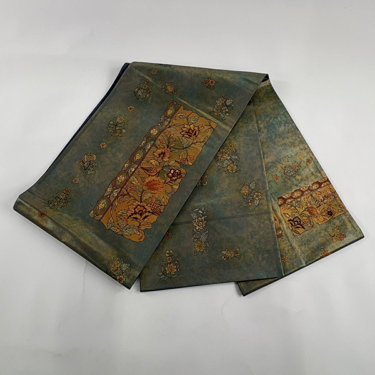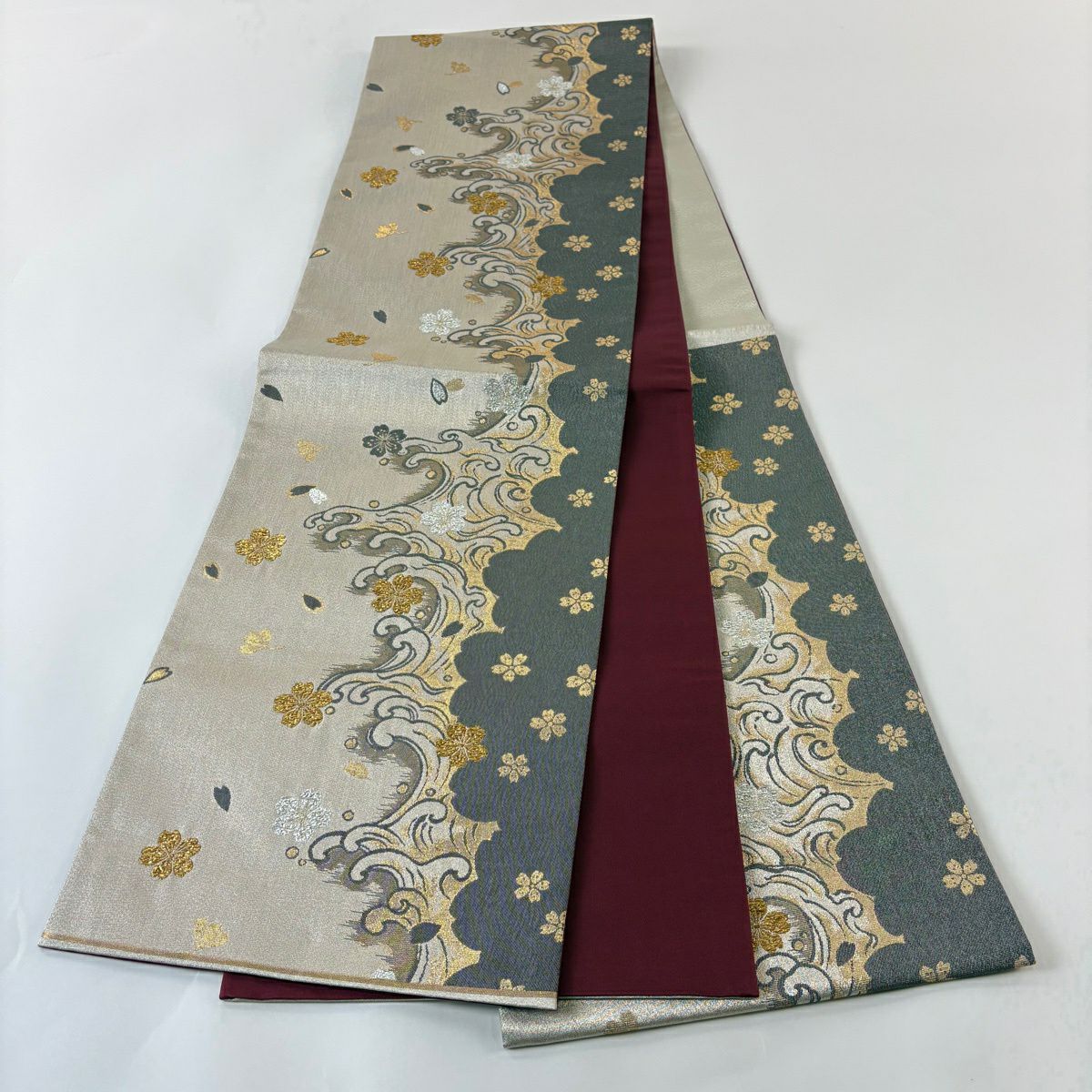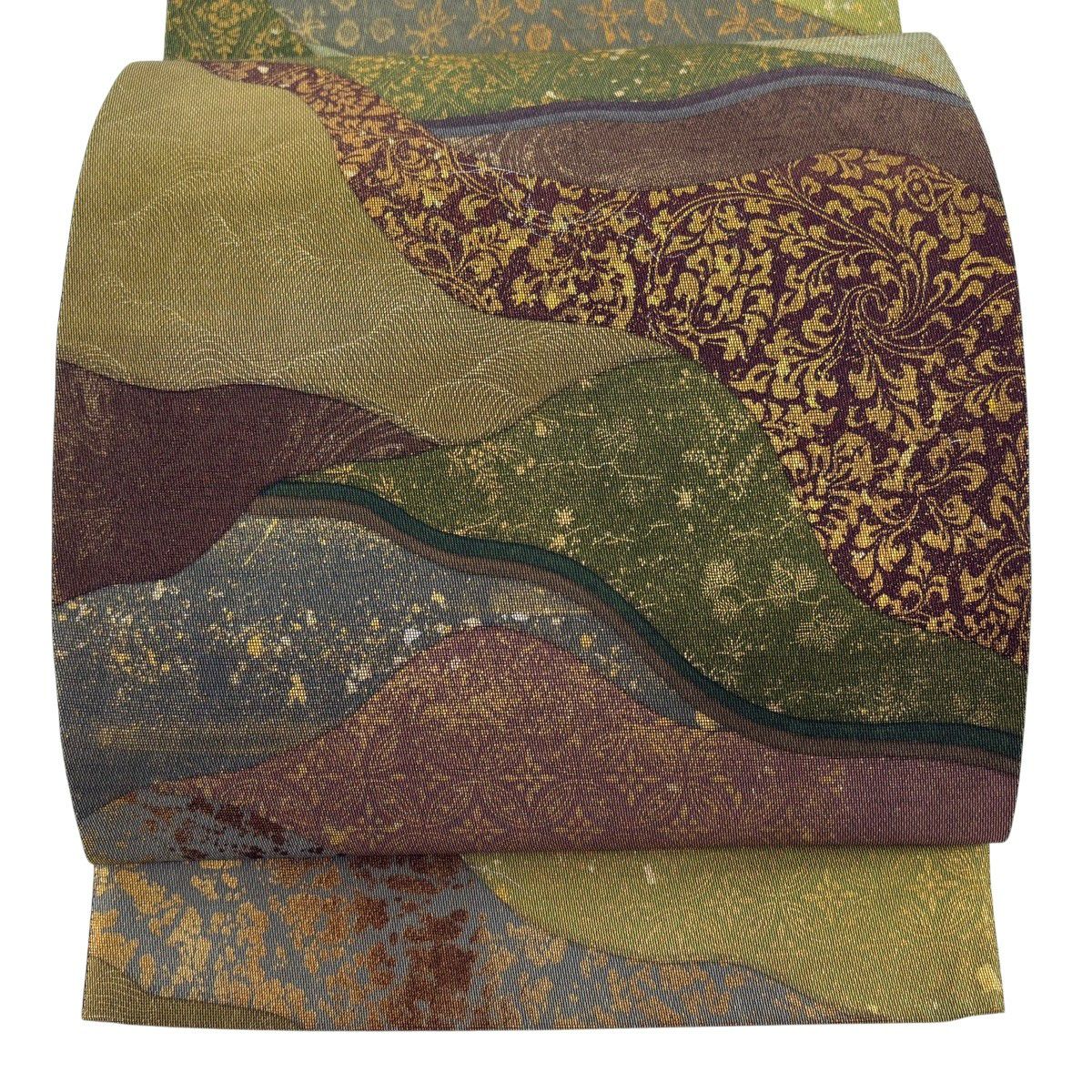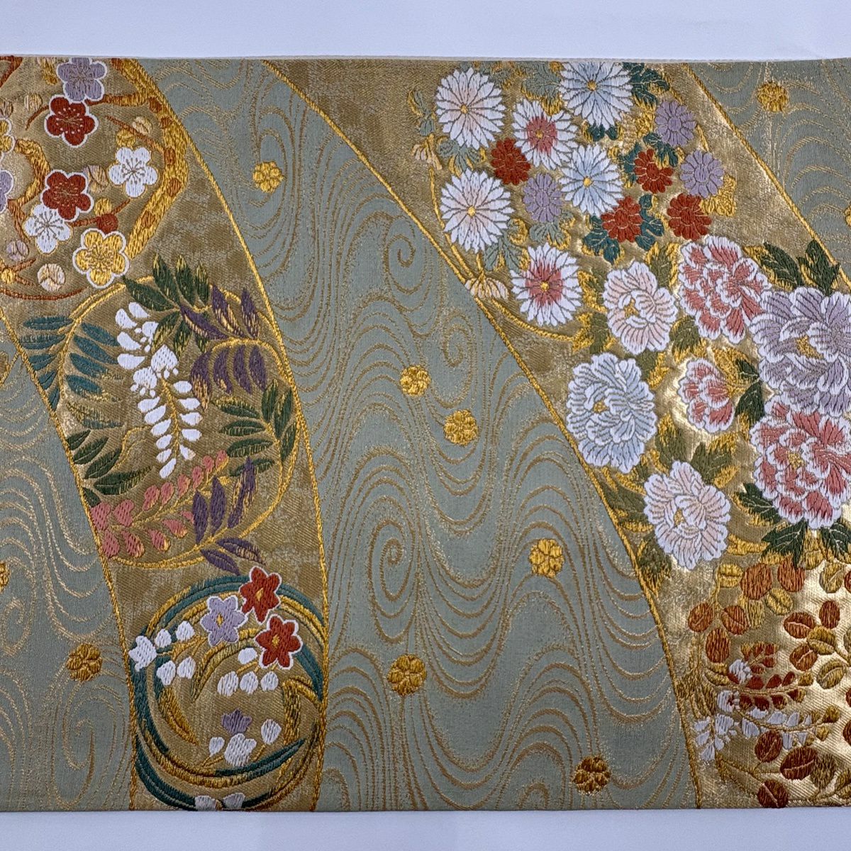 袋帯 秀品 彩花清流 草花 流水 箔 金糸 灰緑 六通 正絹