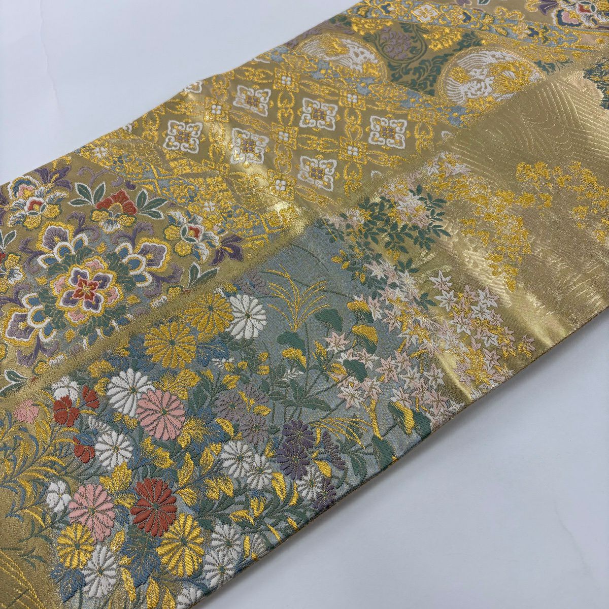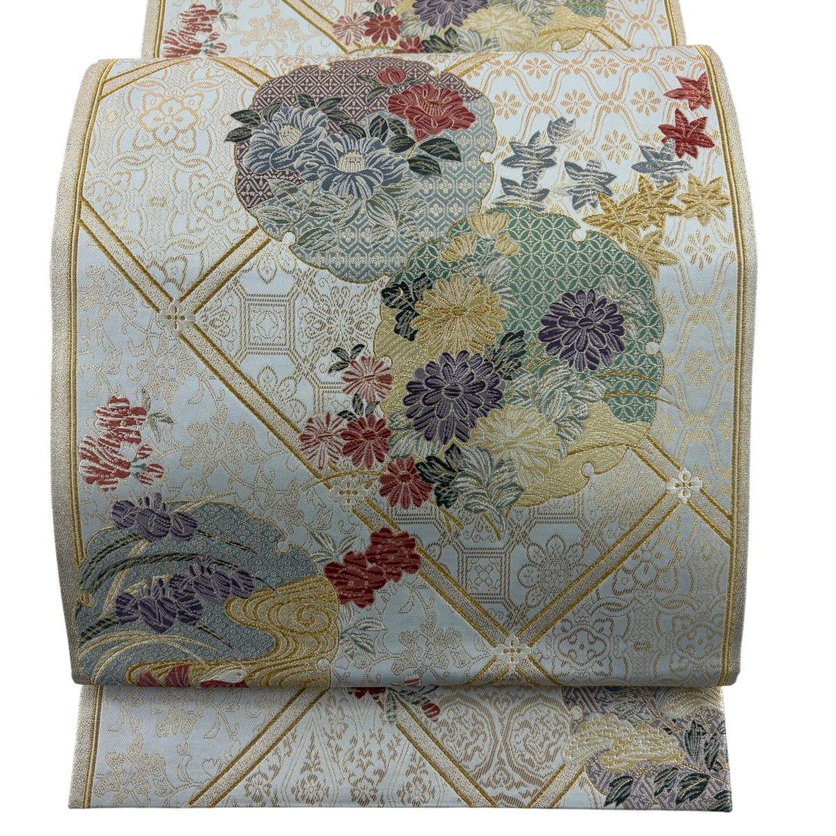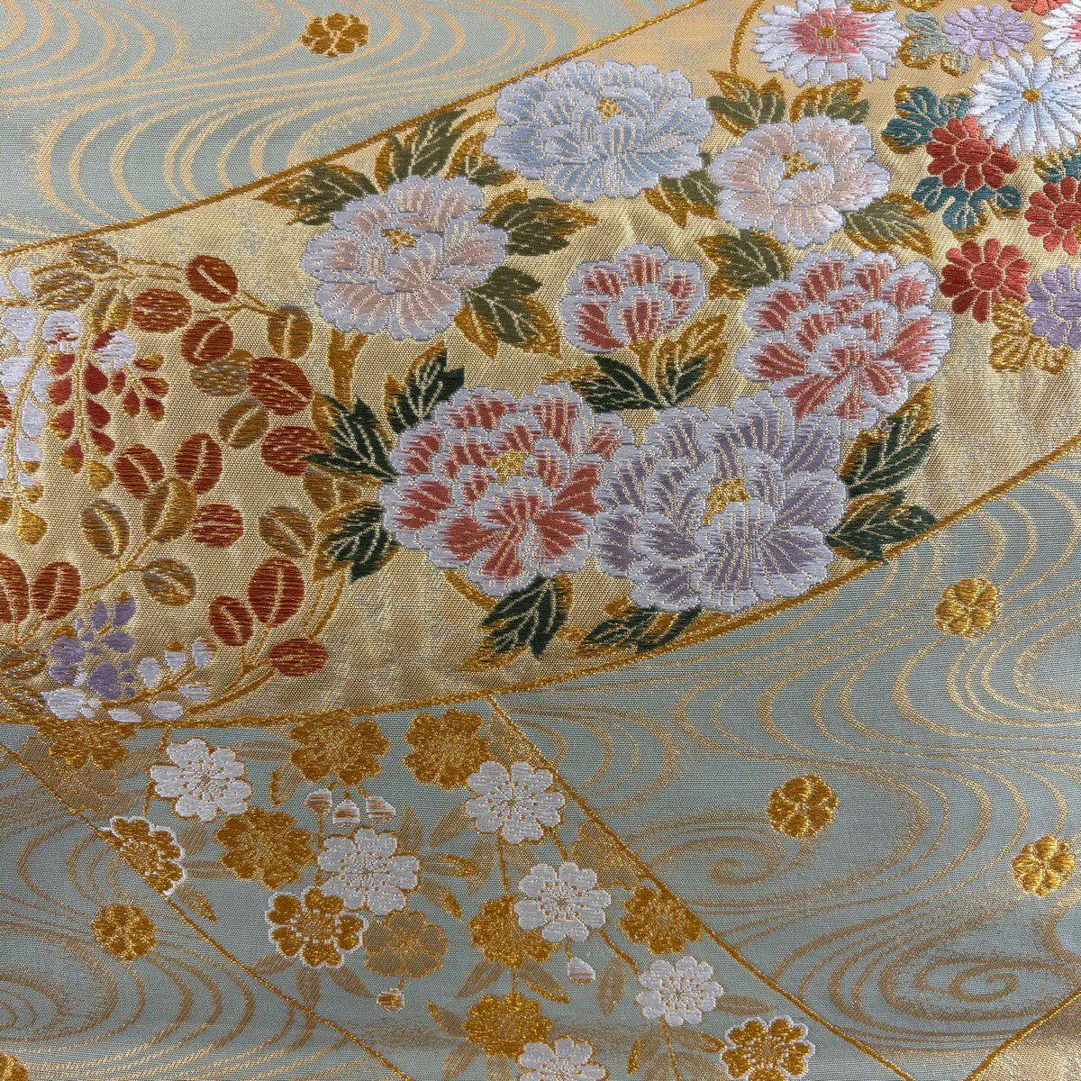 【美品】 袋帯 秀品 雪輪 草花 金糸 箔 水色 六通 正絹