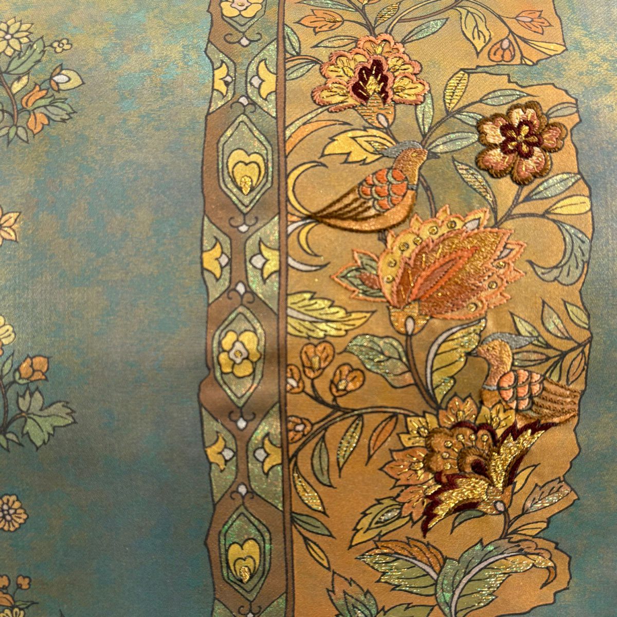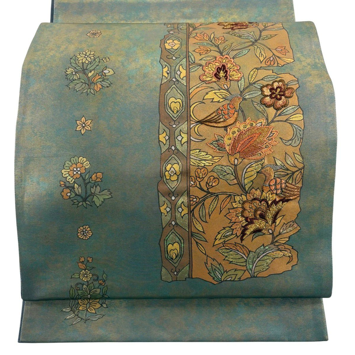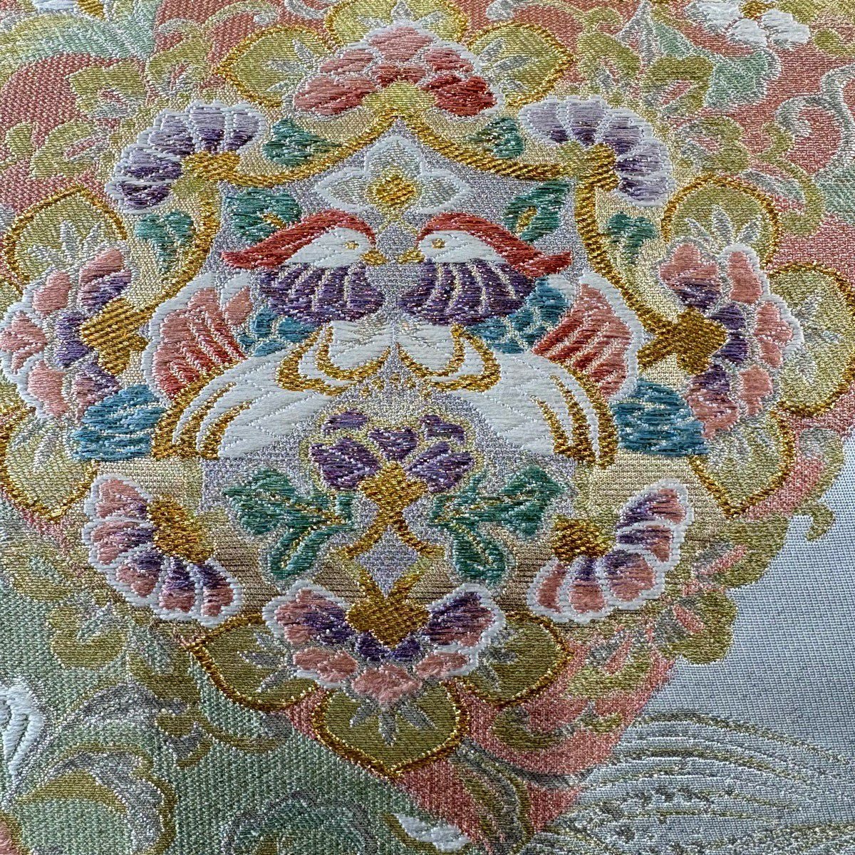 【美品】 袋帯 秀品 花唐草 鳥 刺繍 箔 灰緑 六通 正絹