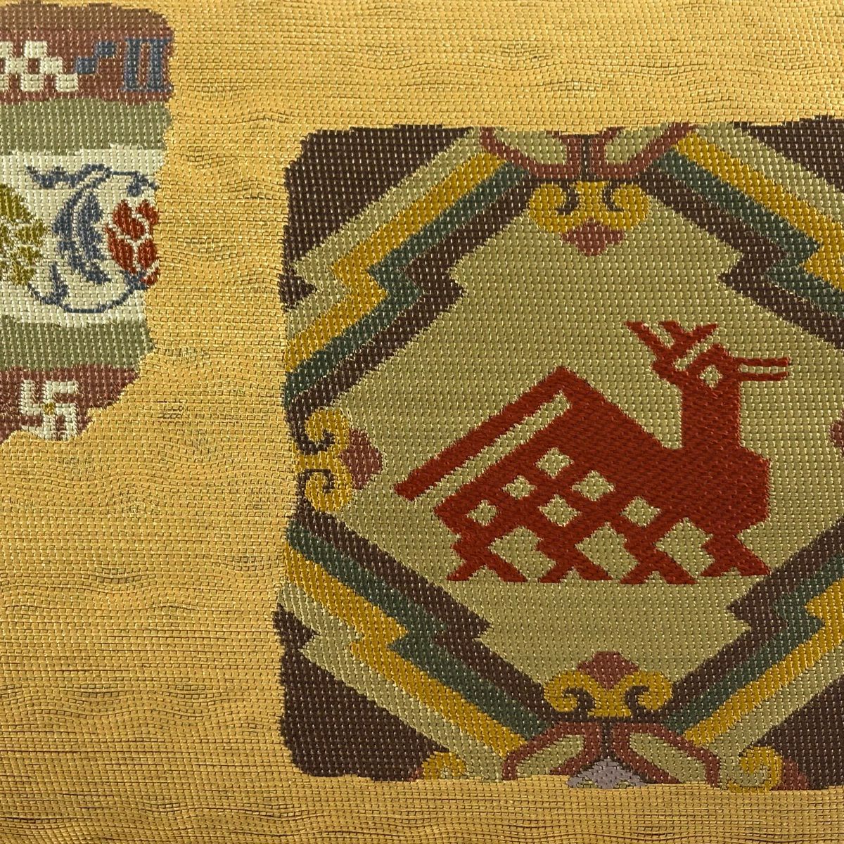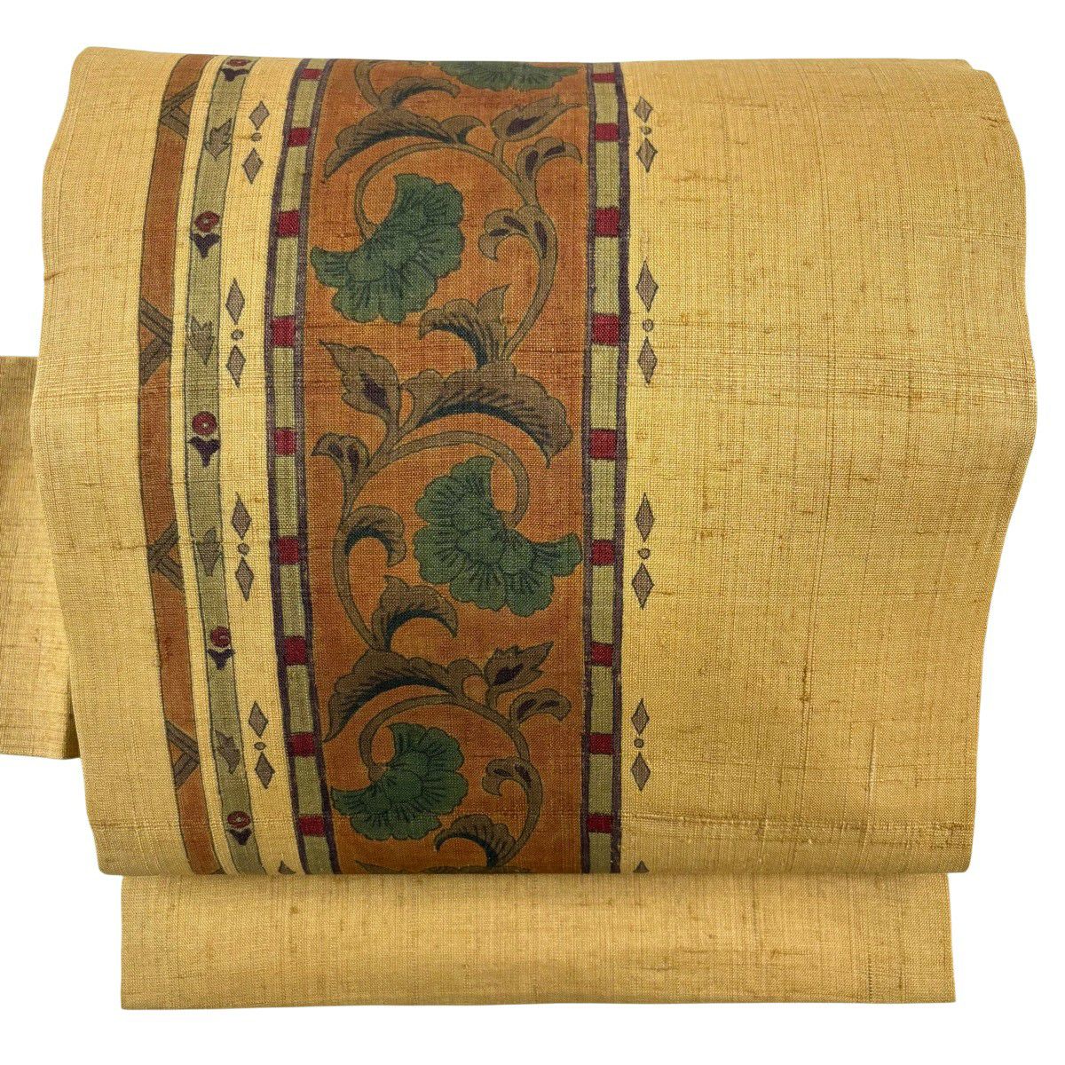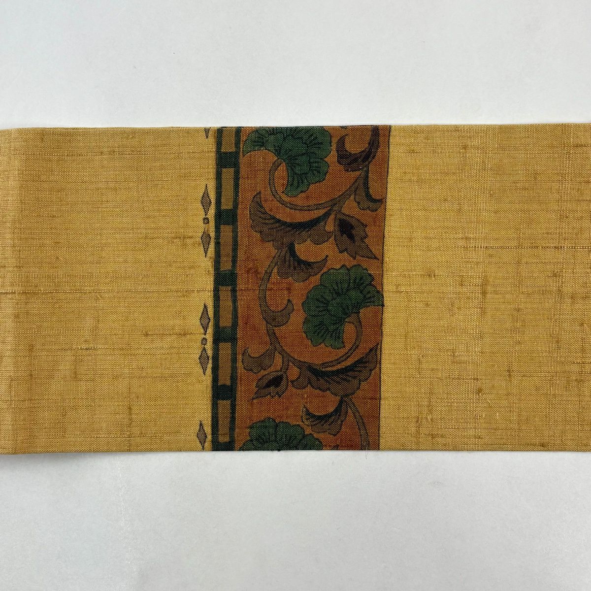 【美品】 名古屋帯 秀品 紬地 花唐草 幾何学 黄土色 正絹