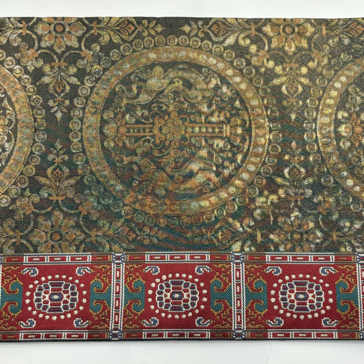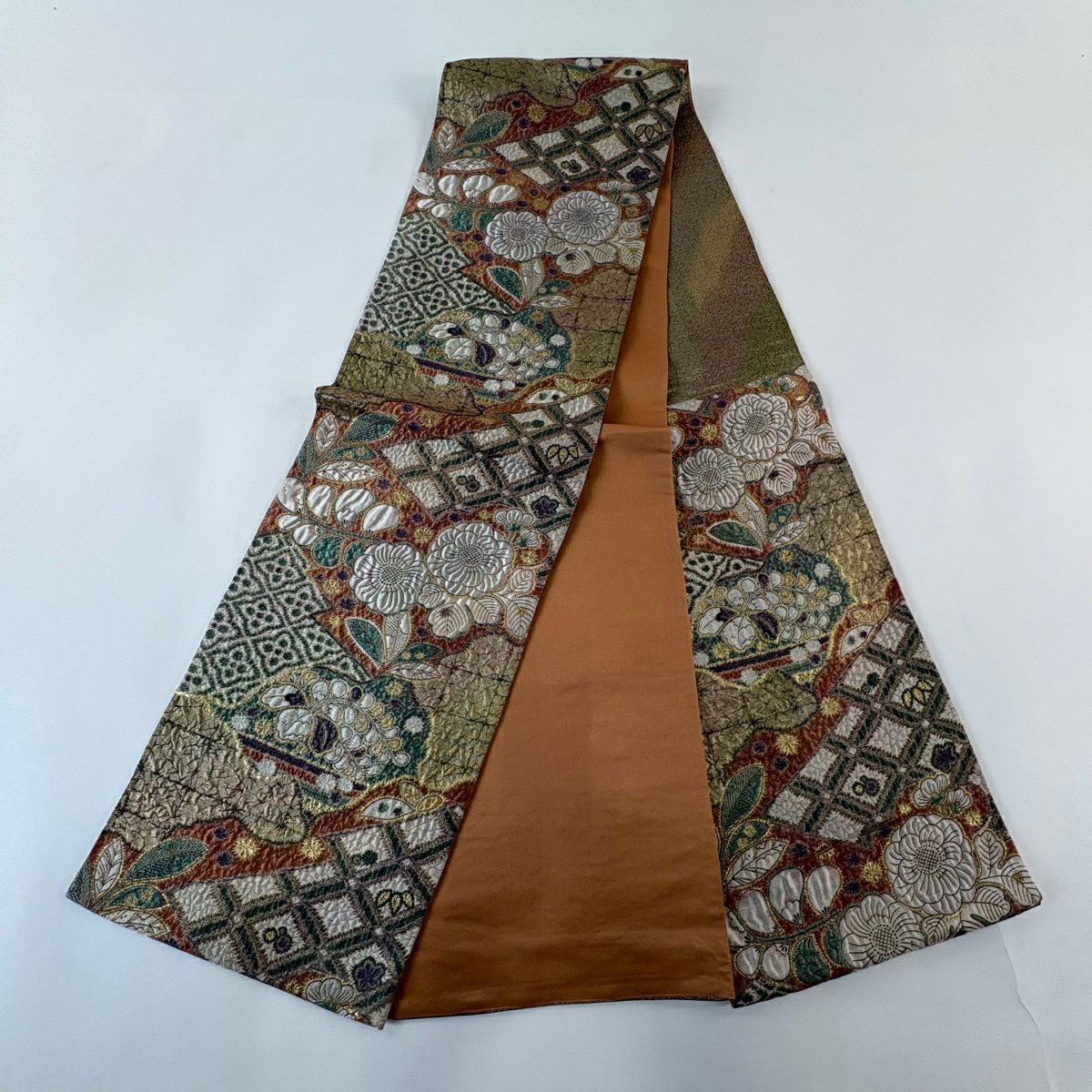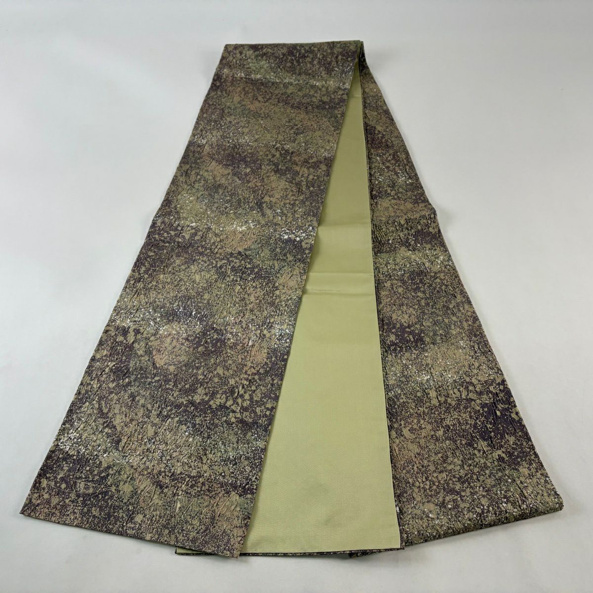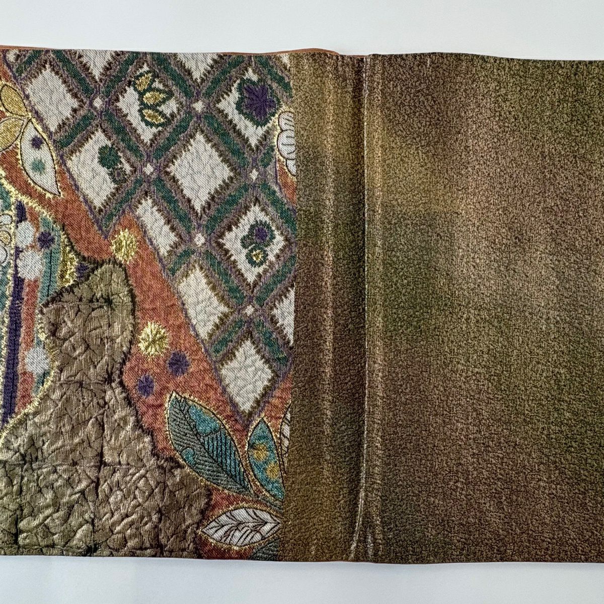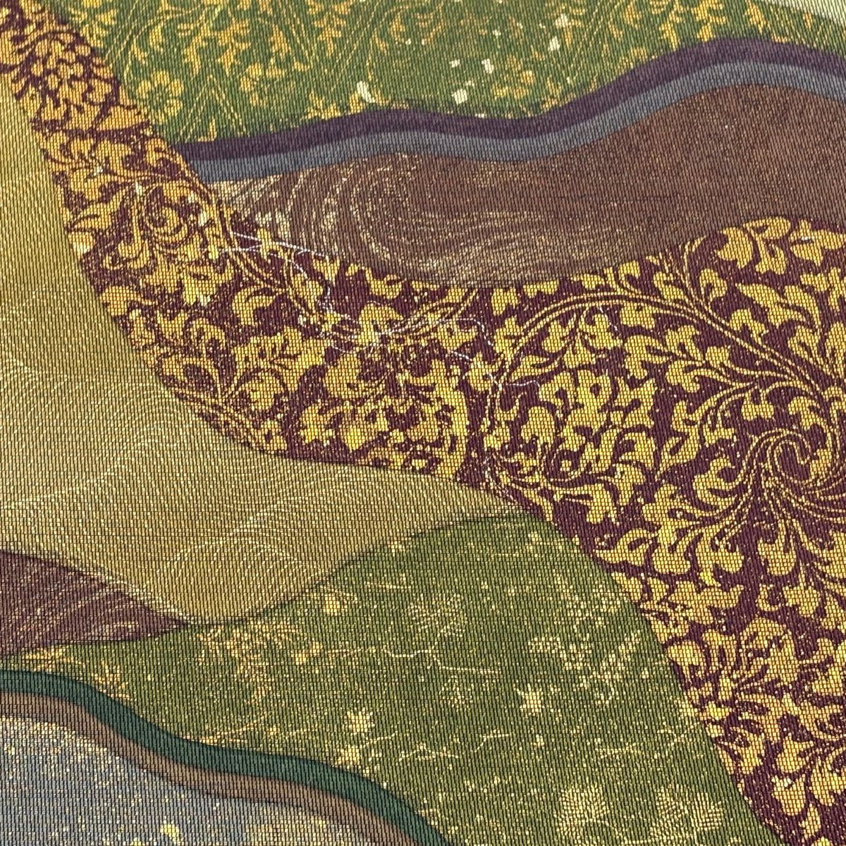 【美品】 袋帯 秀品 花唐草 菱 金銀彩 茶緑色 六通 正絹