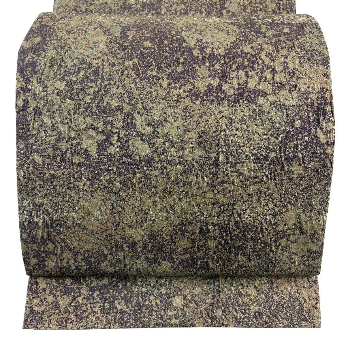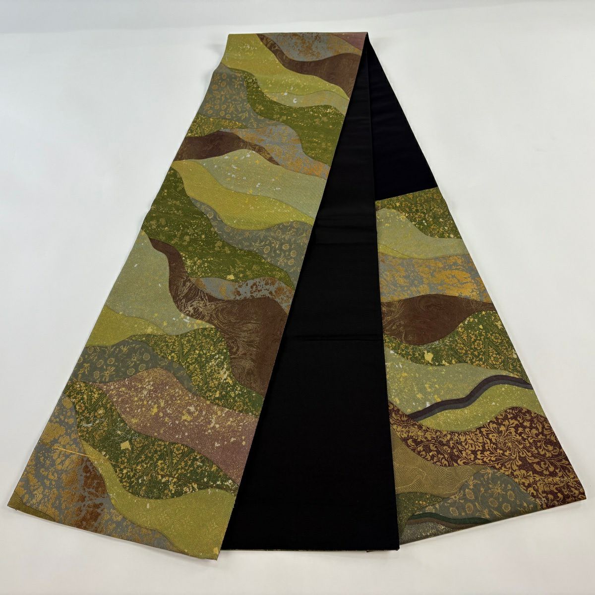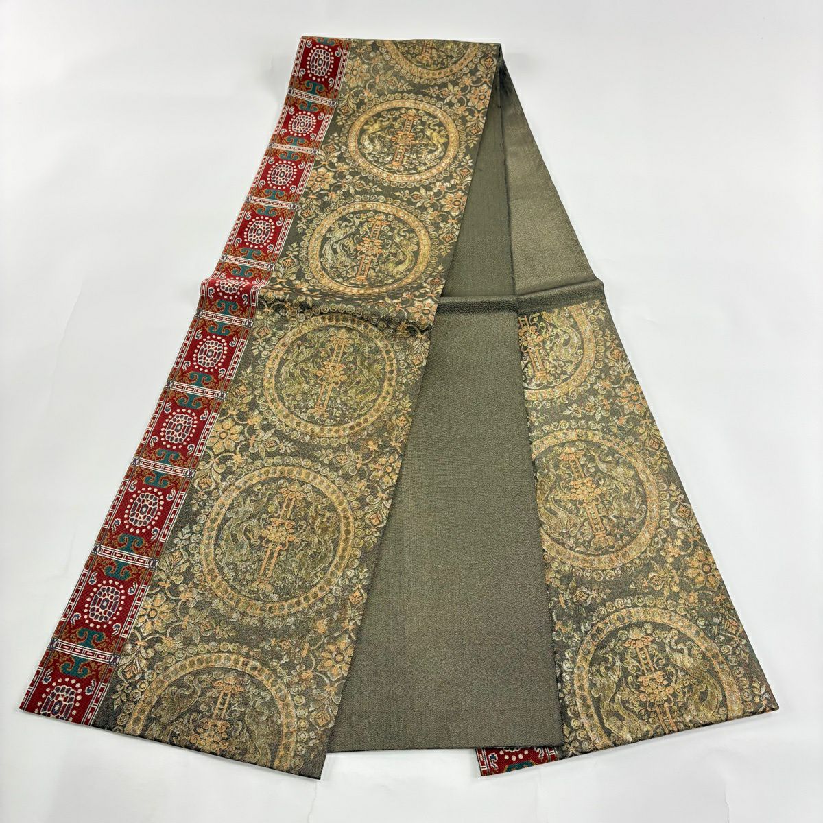 【美品】 袋帯 秀品 草花 龍 箔 金糸 茶緑色 六通 正絹