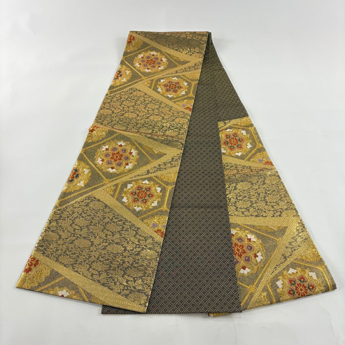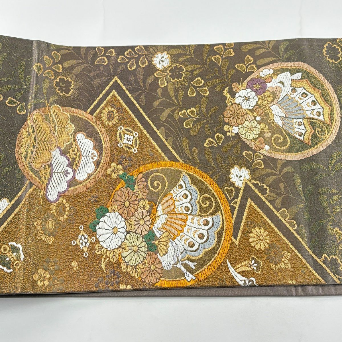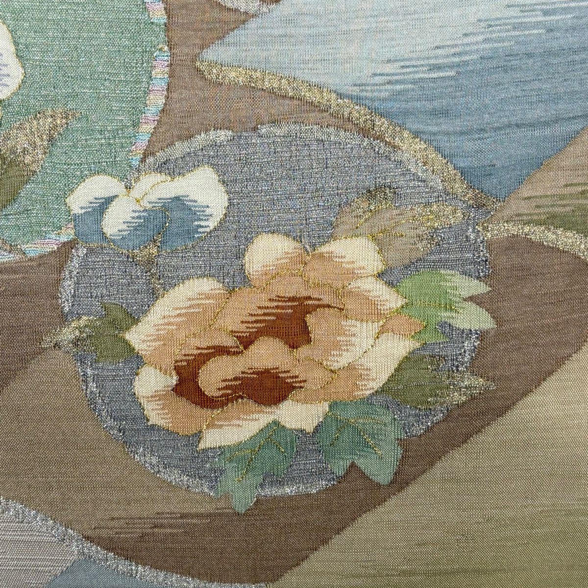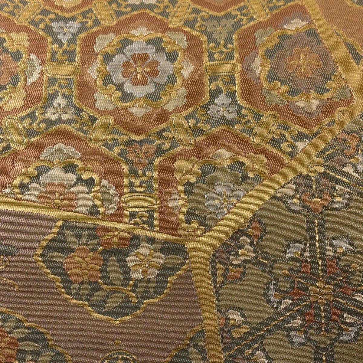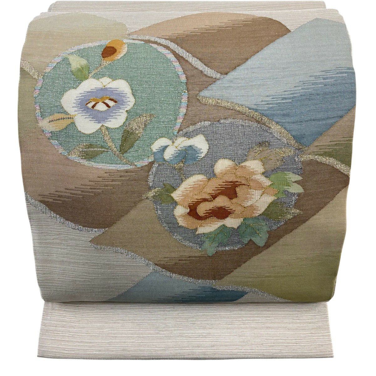 【美品】 袋帯 秀品 草花 瓦 金銀糸 灰茶 お太鼓柄 正絹