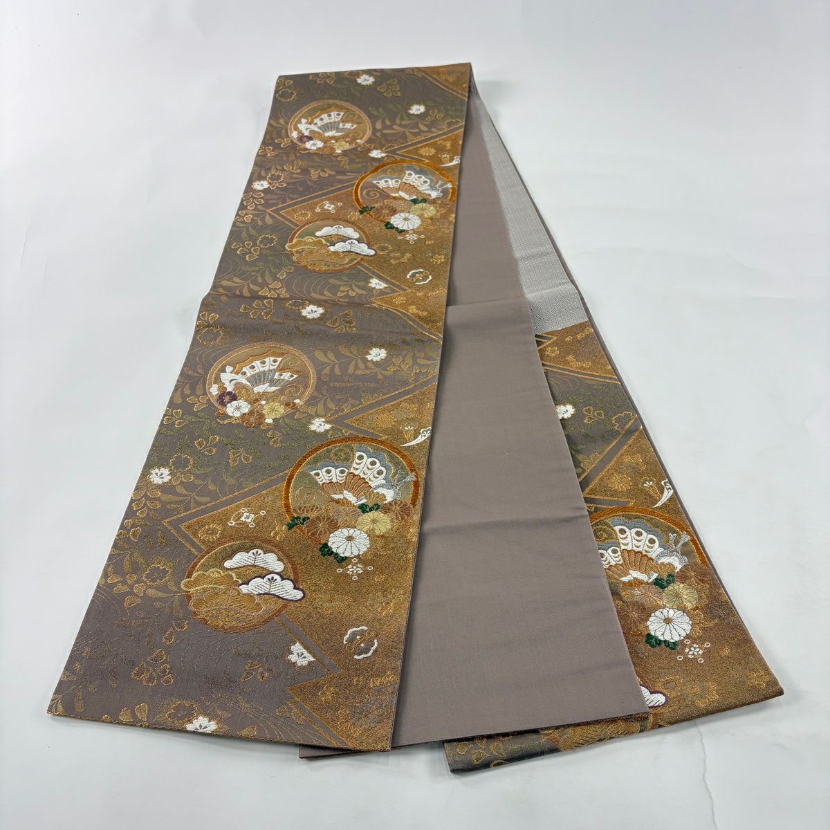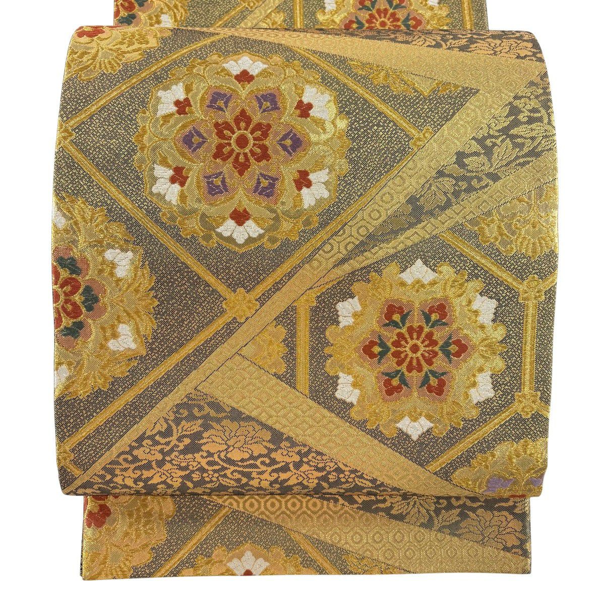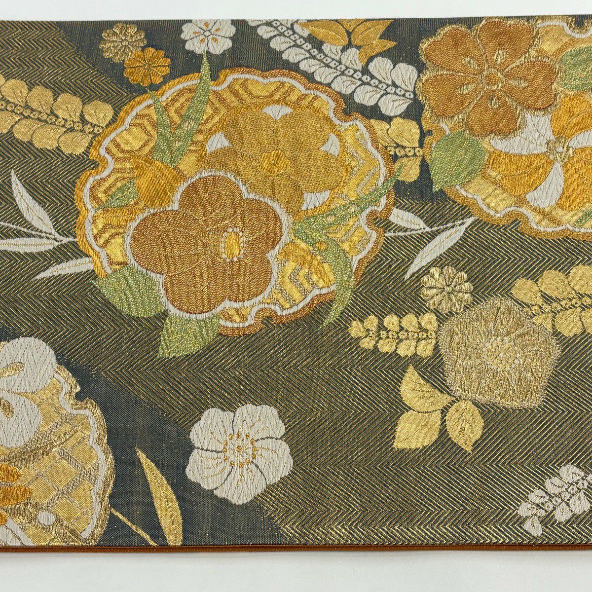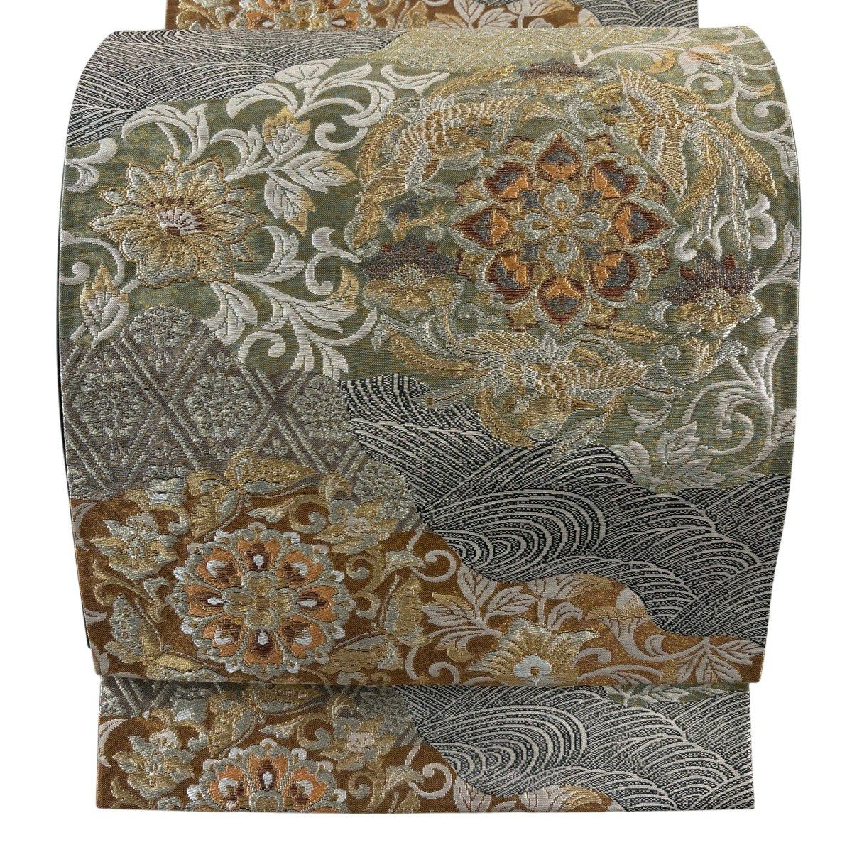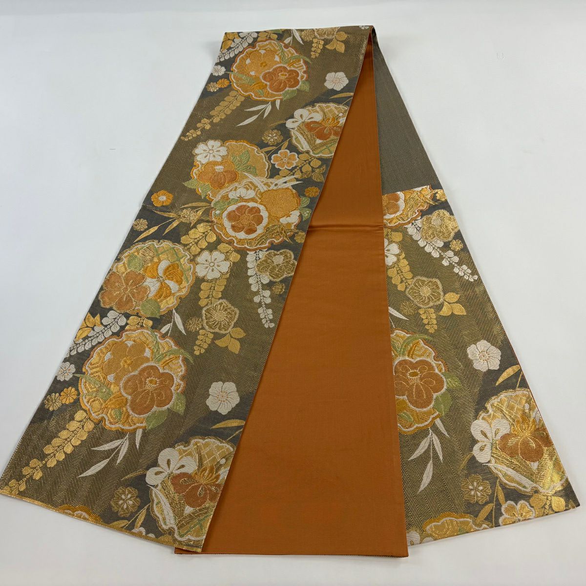 【美品】 袋帯 秀品 草花 瓦 金銀糸 灰茶 お太鼓柄 正絹