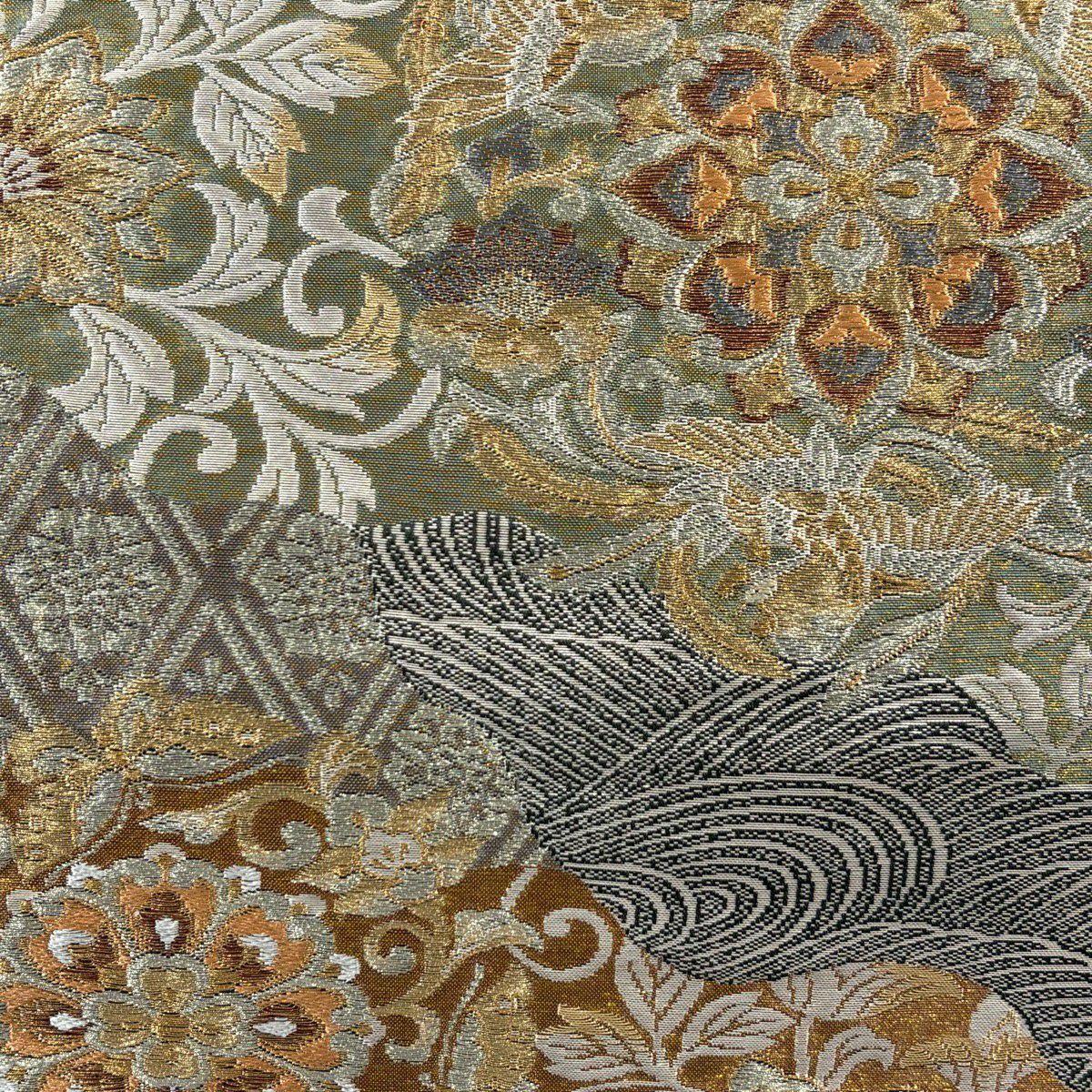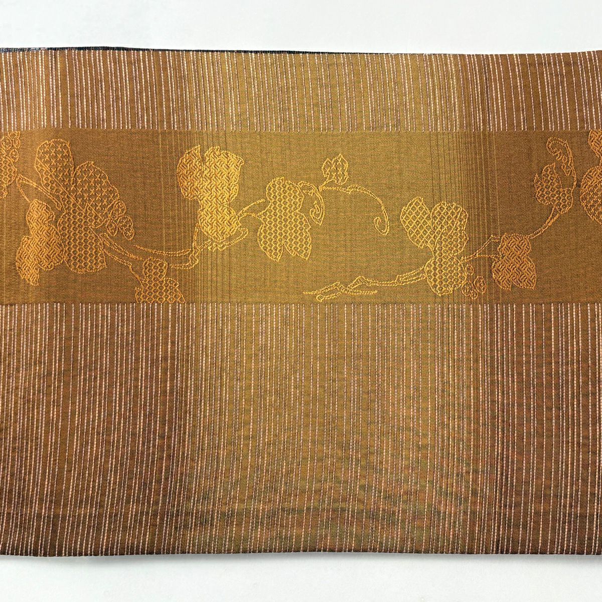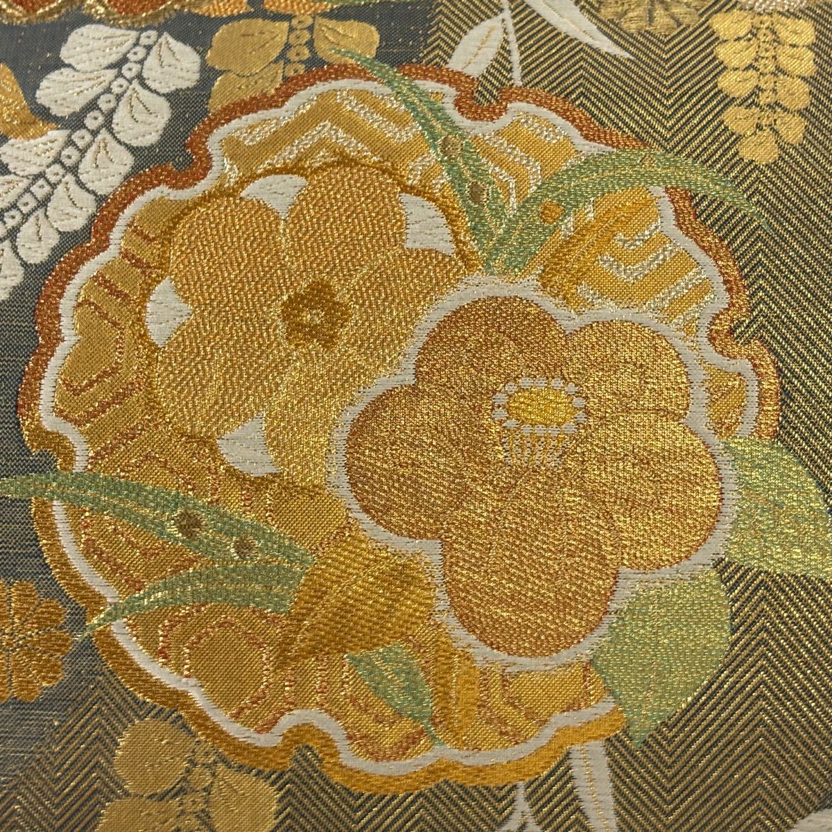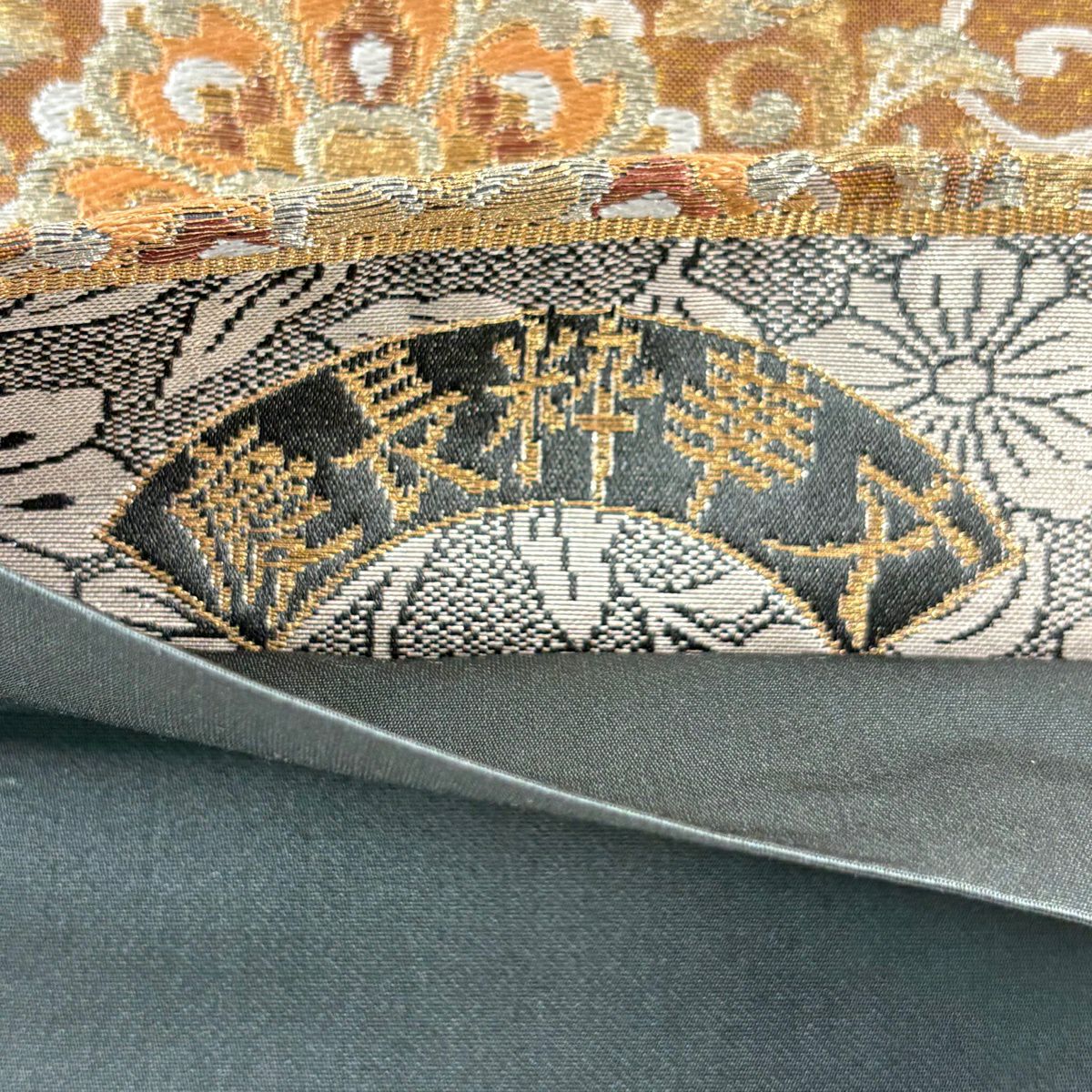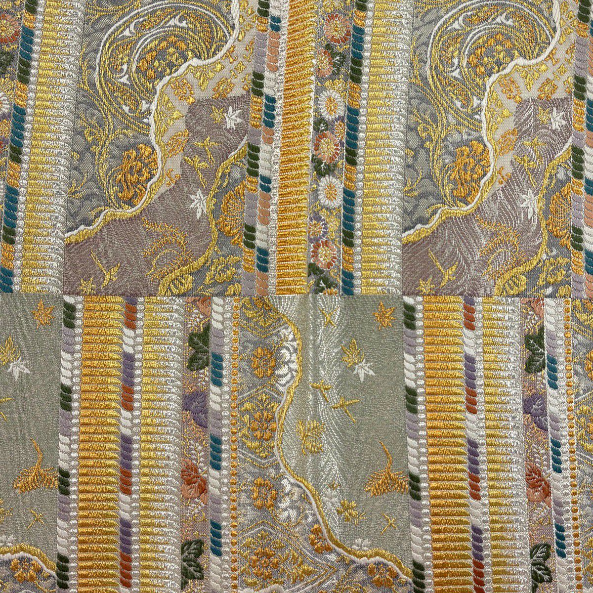 【美品】 袋帯 秀品 草花 瓦 金銀糸 灰茶 お太鼓柄 正絹