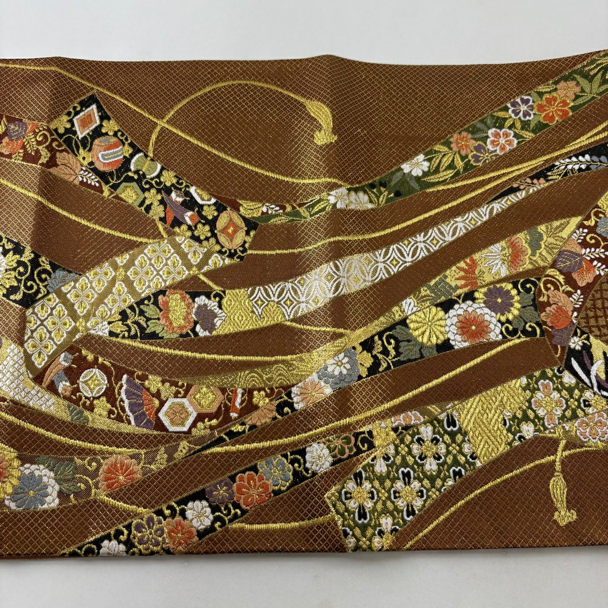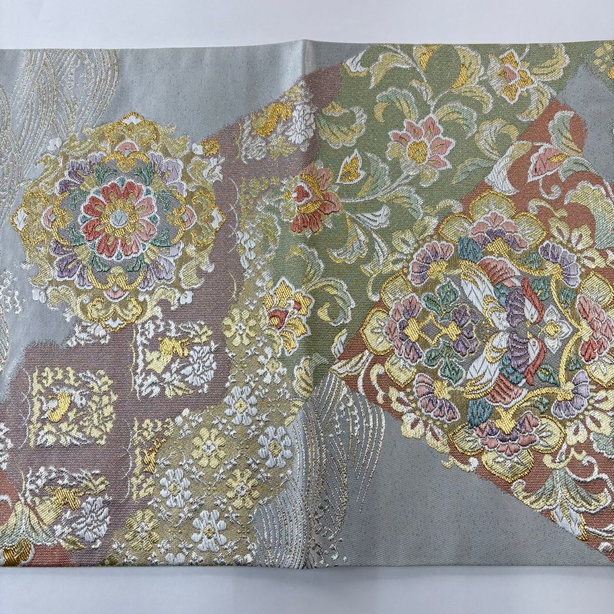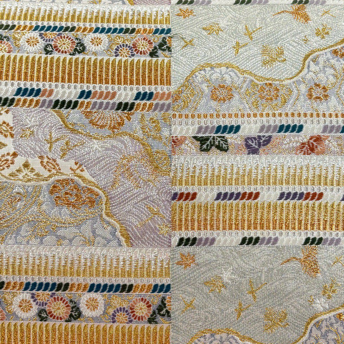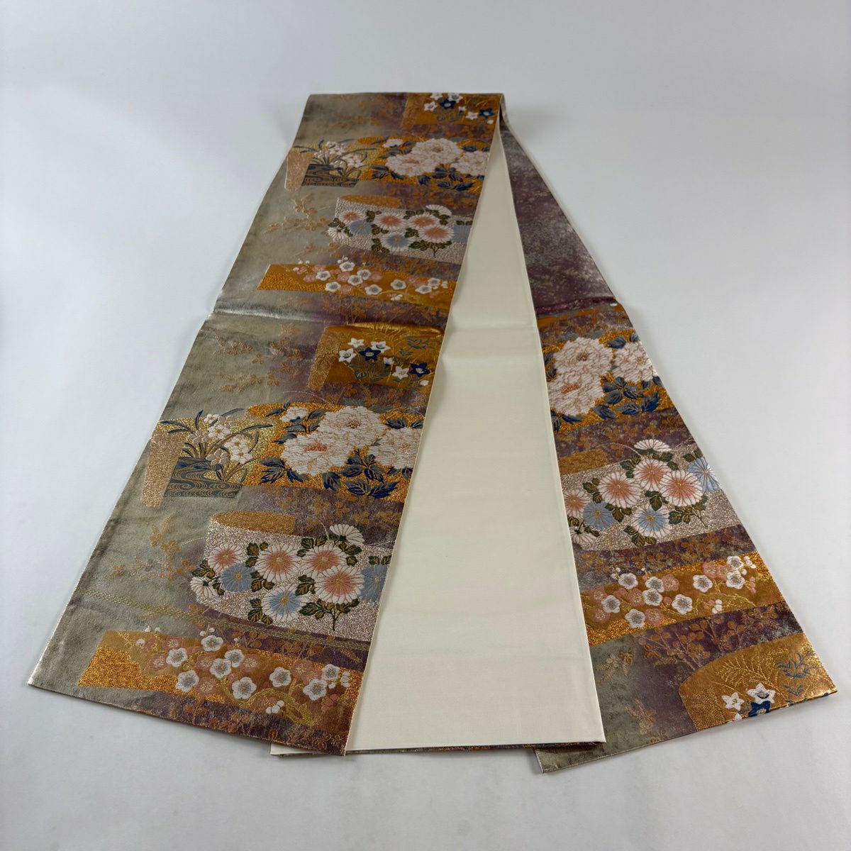【美品】 袋帯 秀品 草花 瓦 金銀糸 灰茶 お太鼓柄 正絹