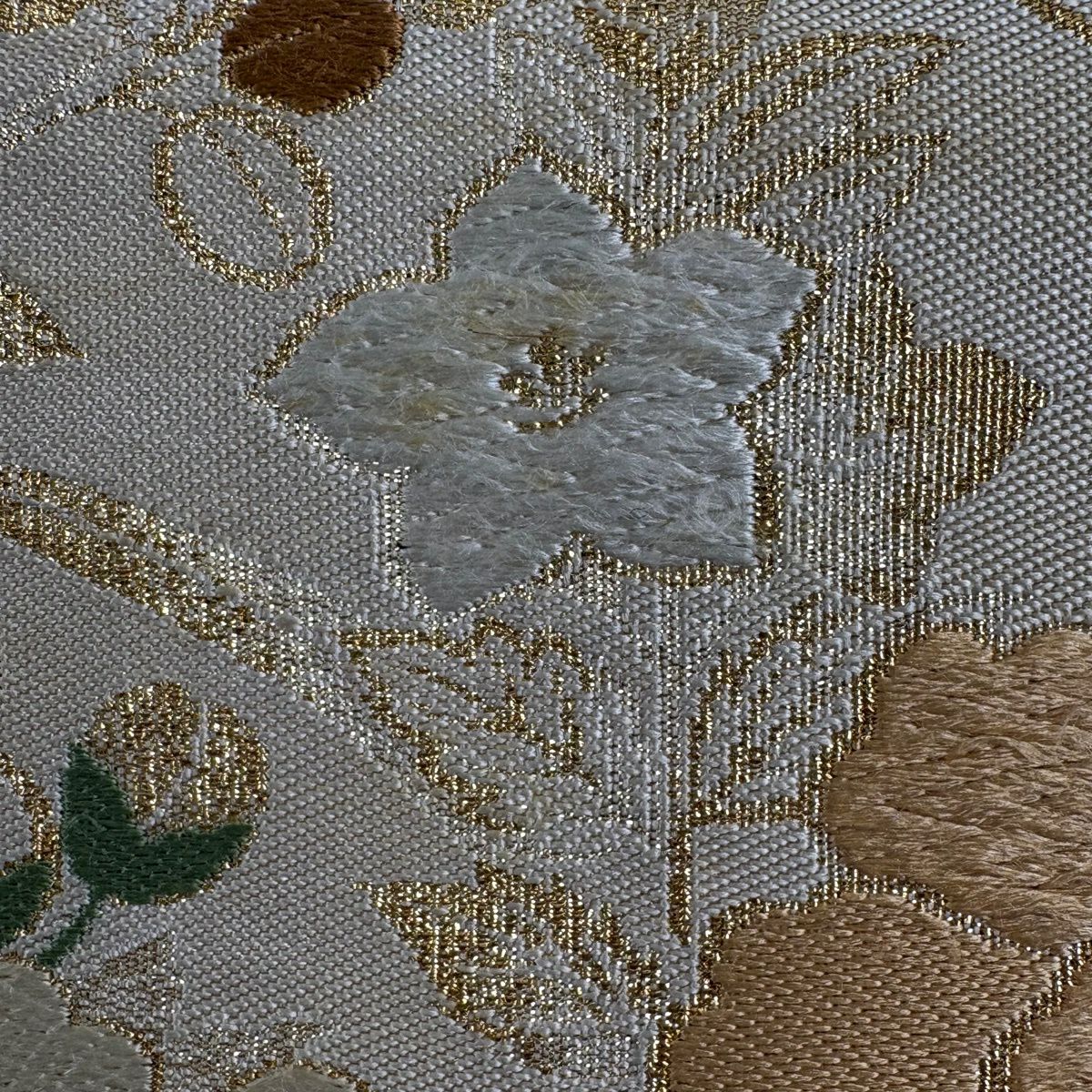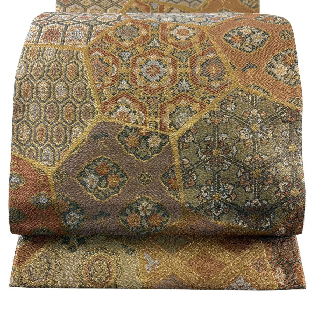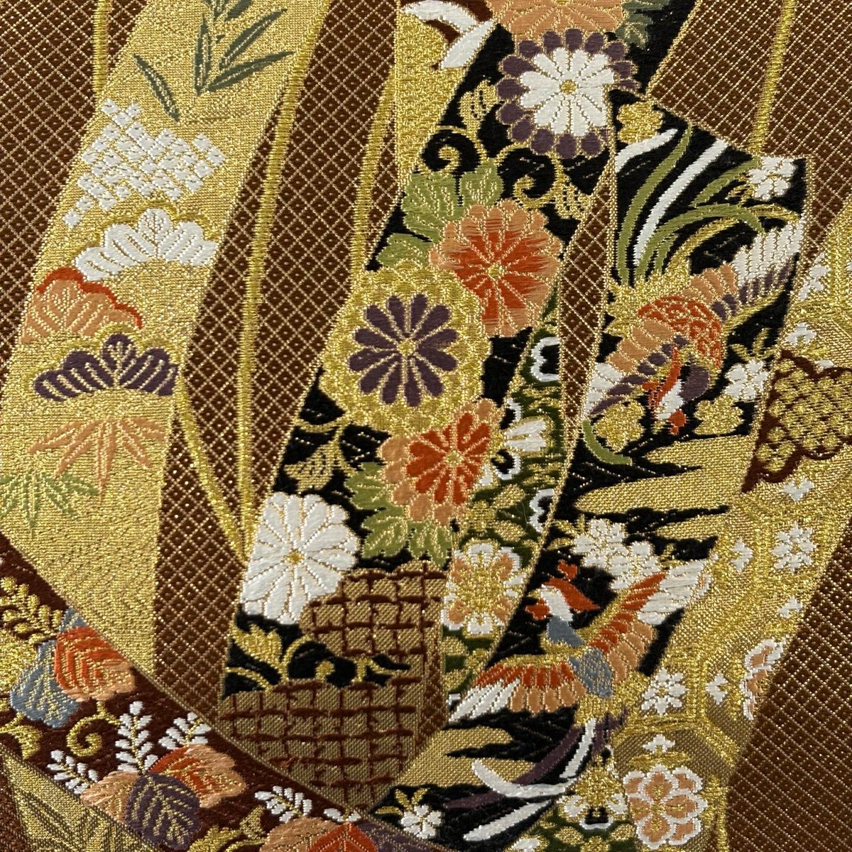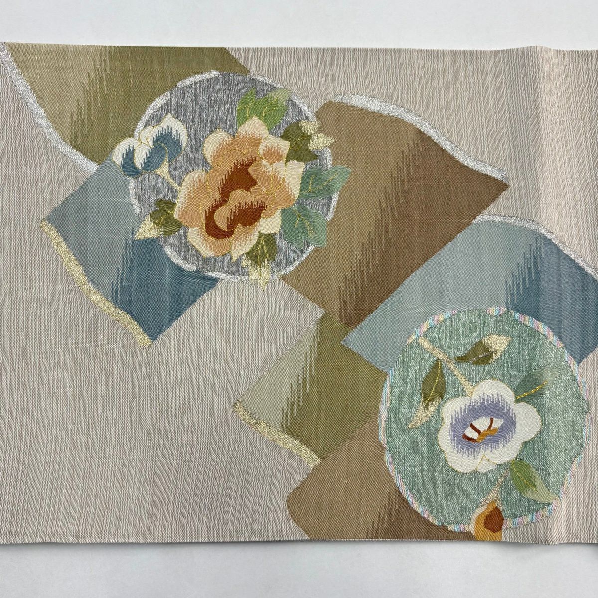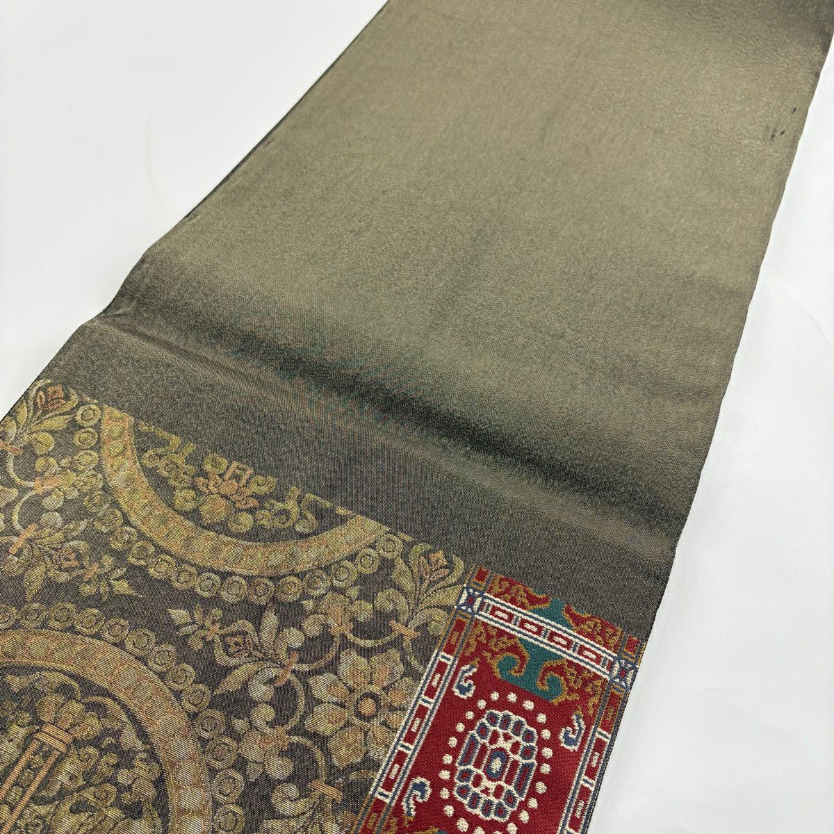 【美品】 袋帯 秀品 草花 瓦 金銀糸 灰茶 お太鼓柄 正絹