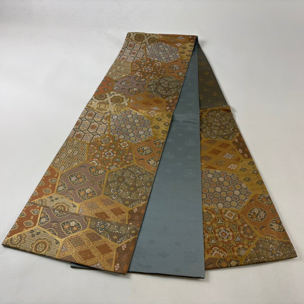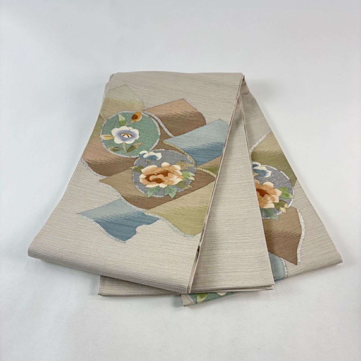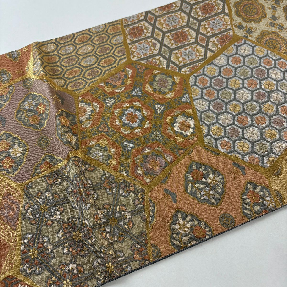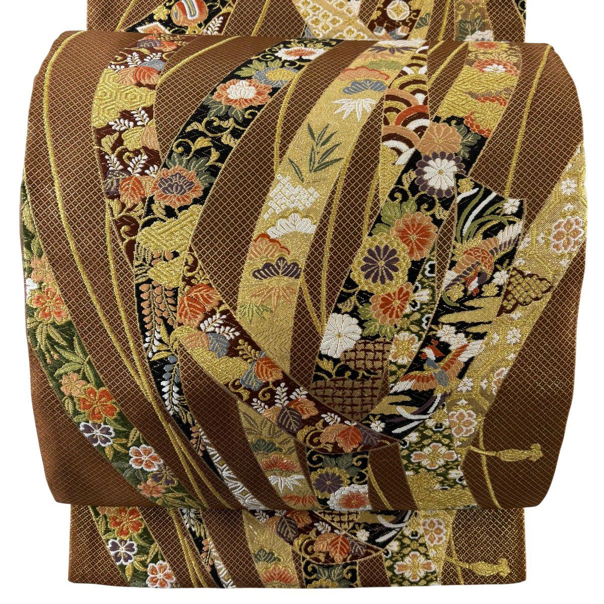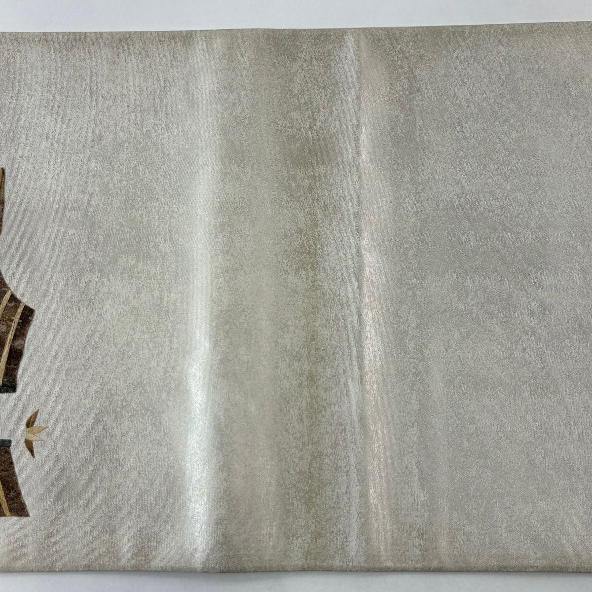 【美品】 袋帯 秀品 草花 瓦 金銀糸 灰茶 お太鼓柄 正絹