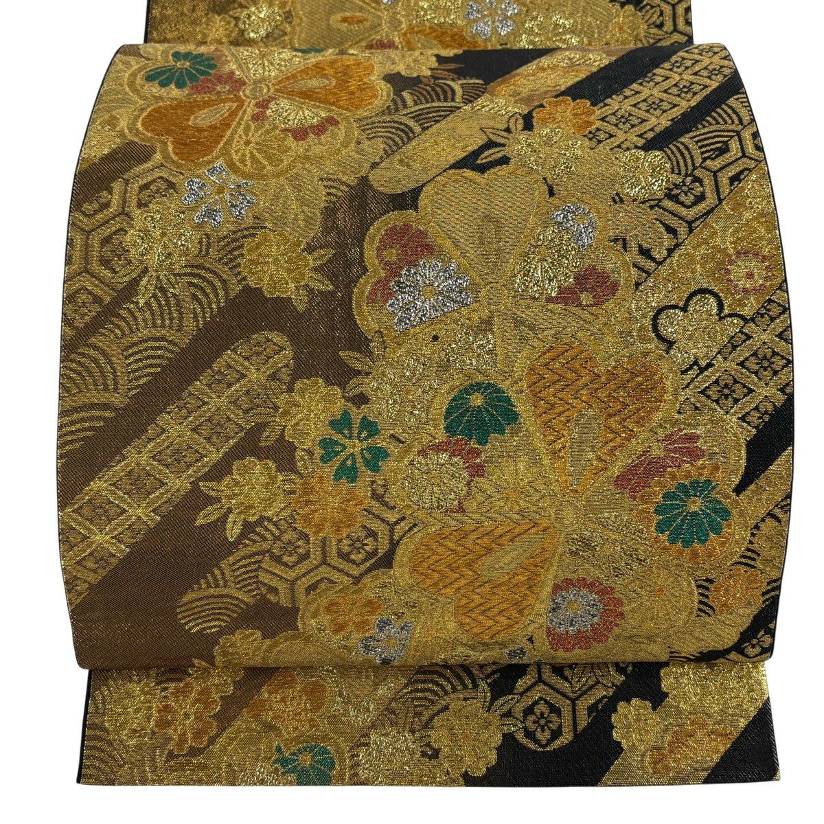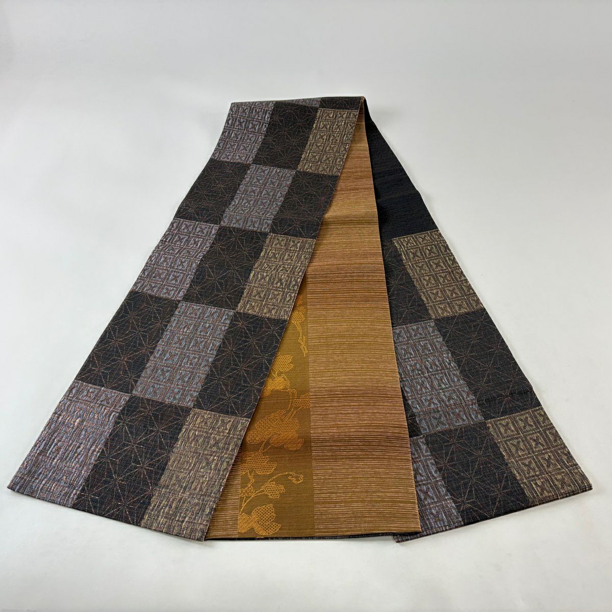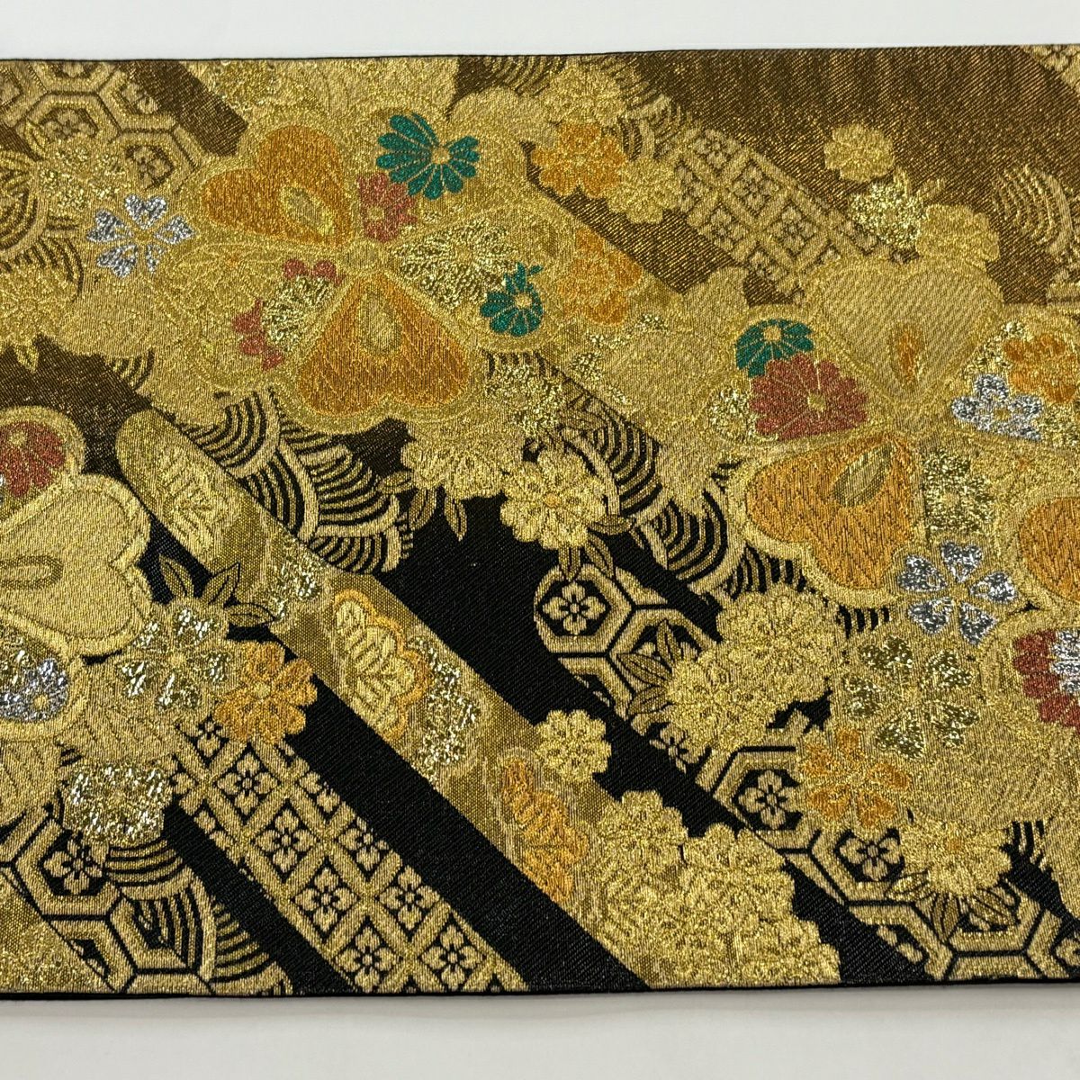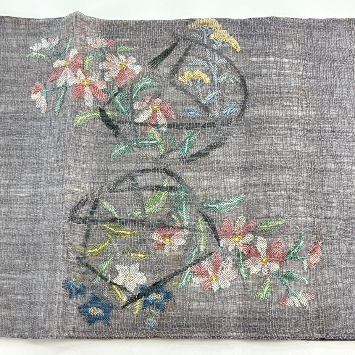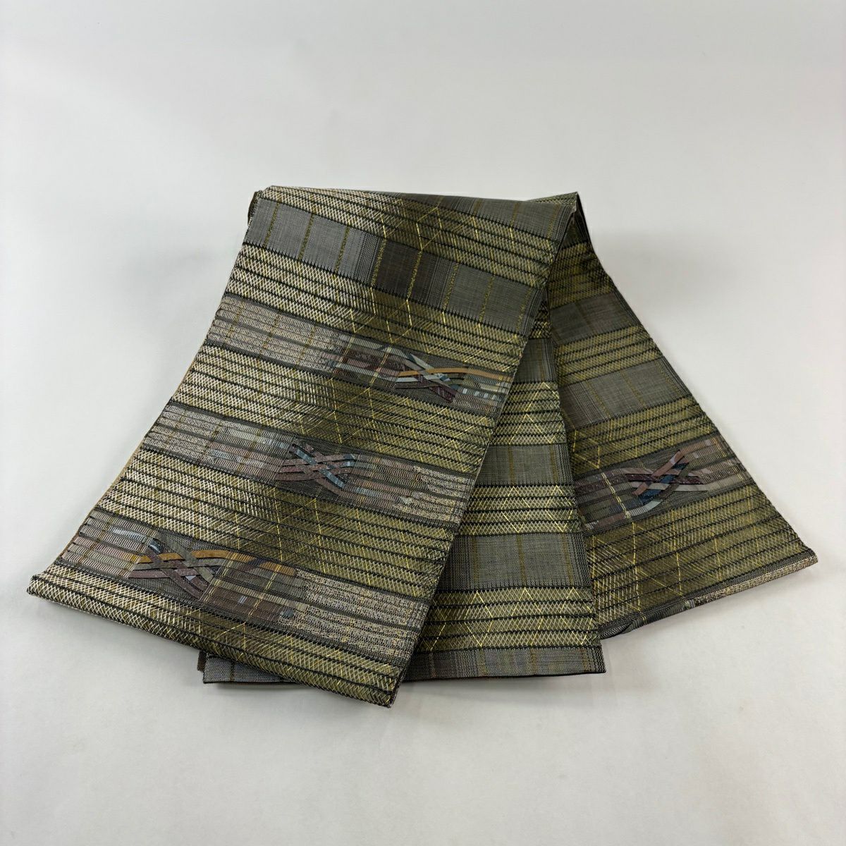 【美品】 袋帯 秀品 草花 瓦 金銀糸 灰茶 お太鼓柄 正絹
