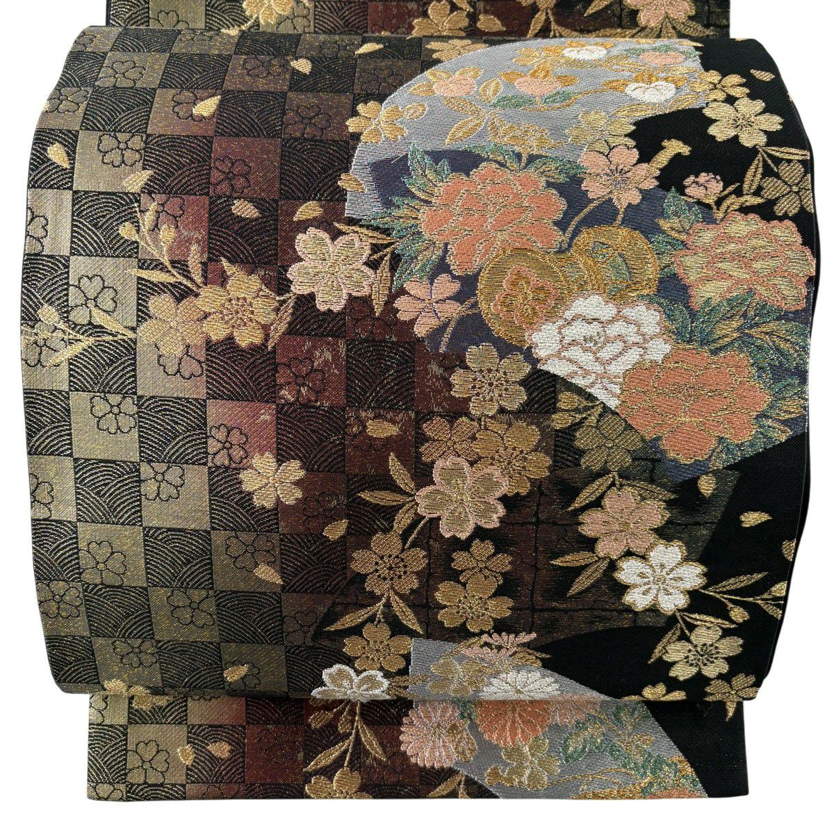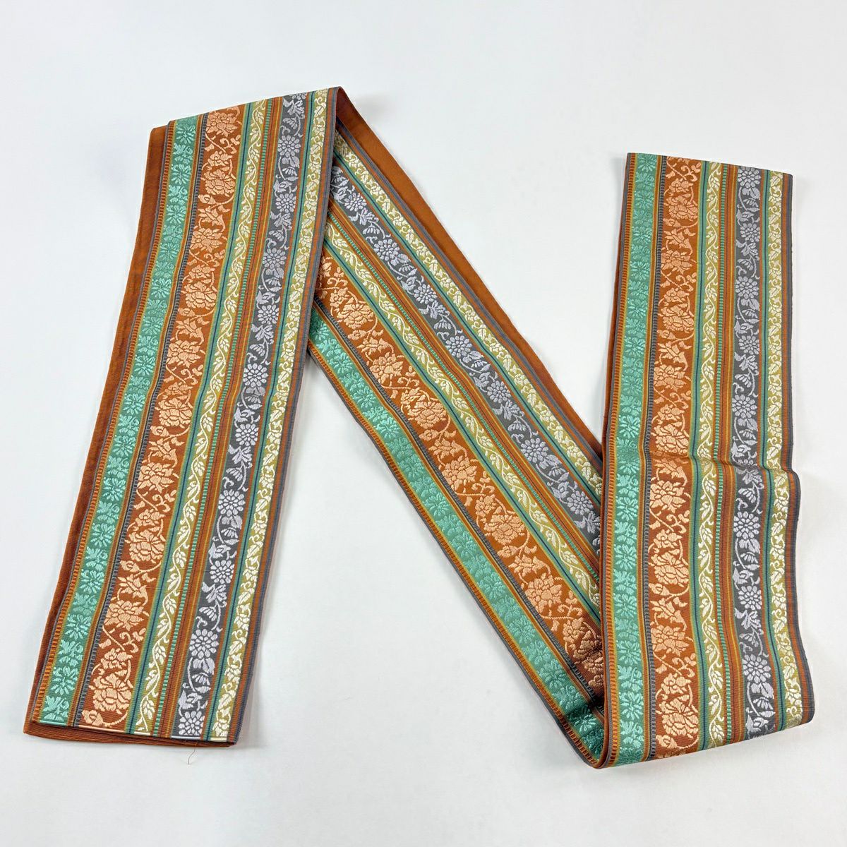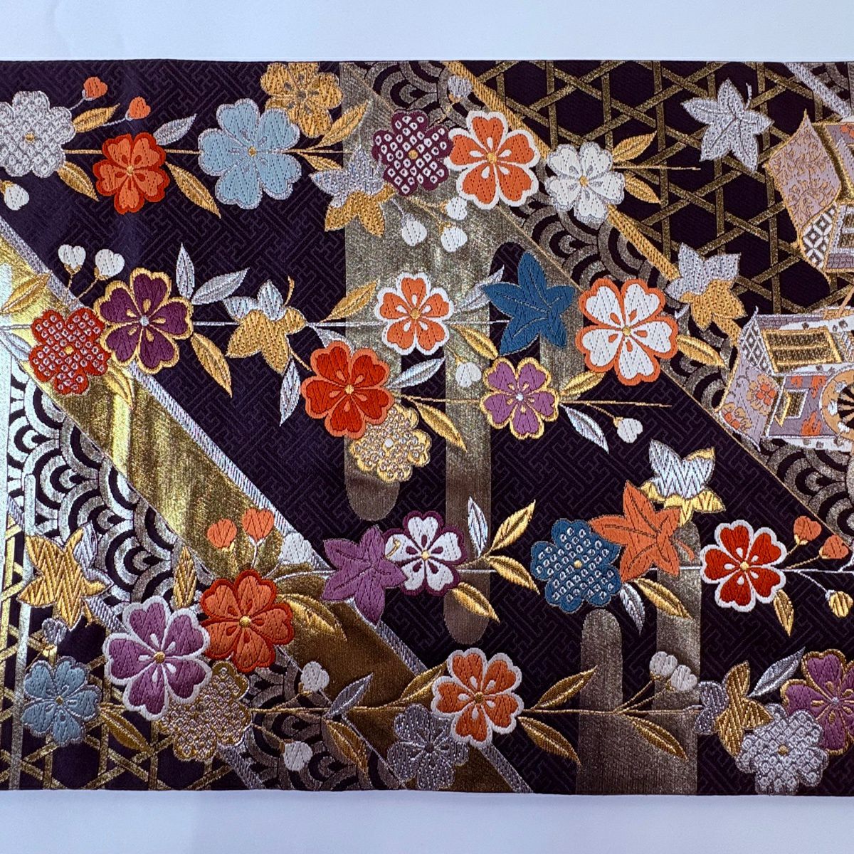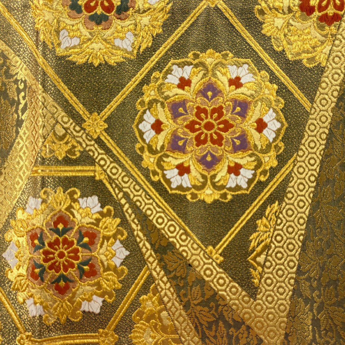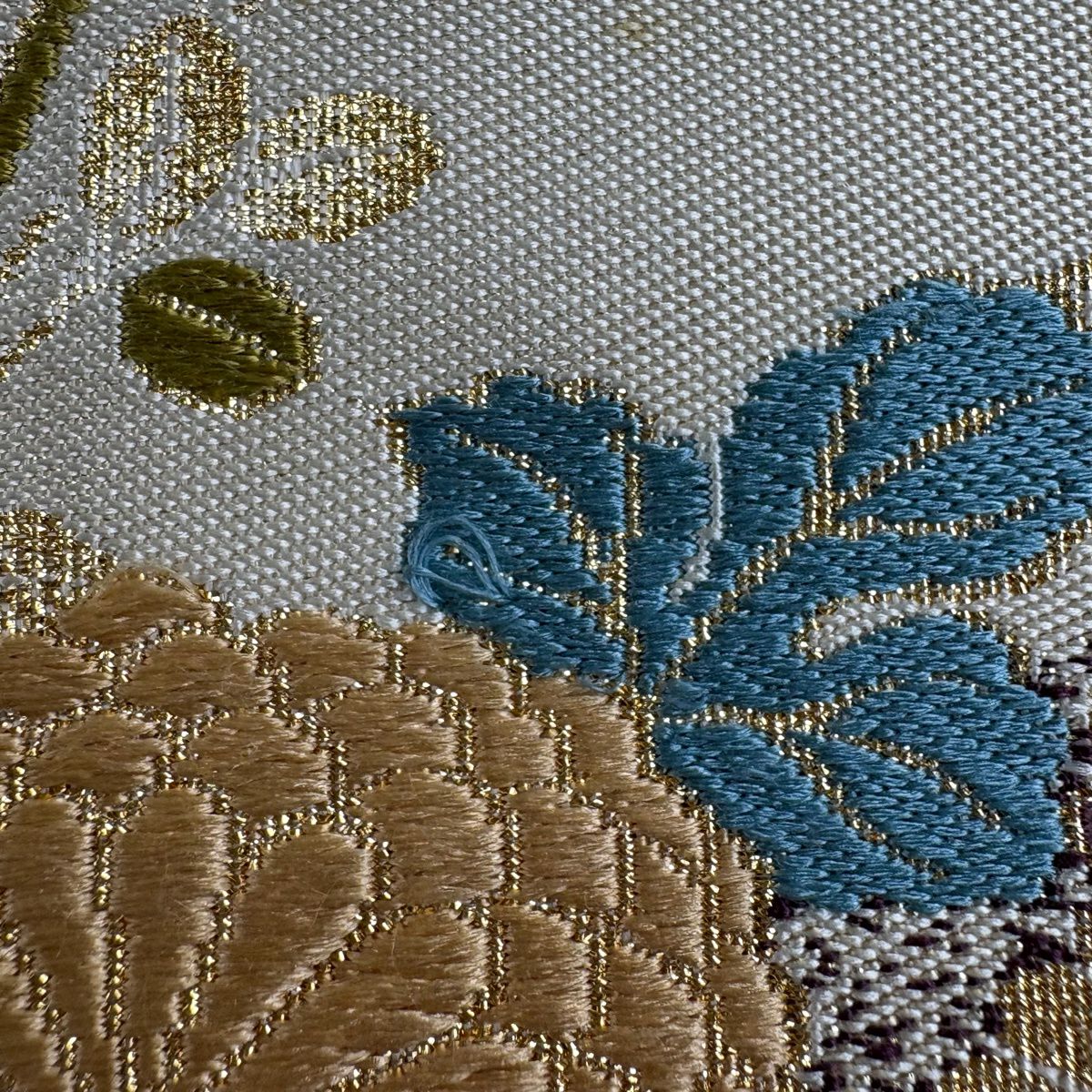 【美品】 袋帯 秀品 草花 瓦 金銀糸 灰茶 お太鼓柄 正絹
