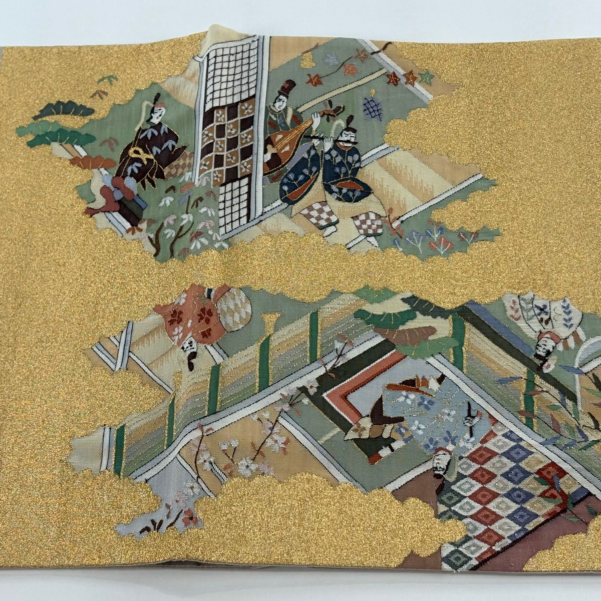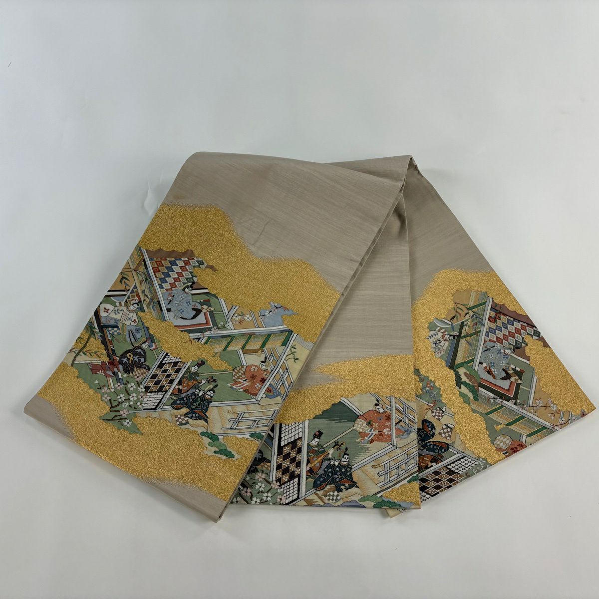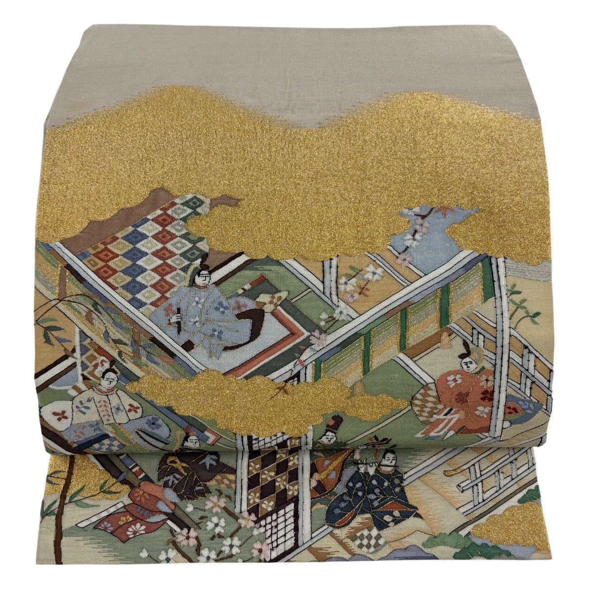 【美品】 袋帯 秀品 人物 雲文 金糸 灰茶 お太鼓柄 正絹