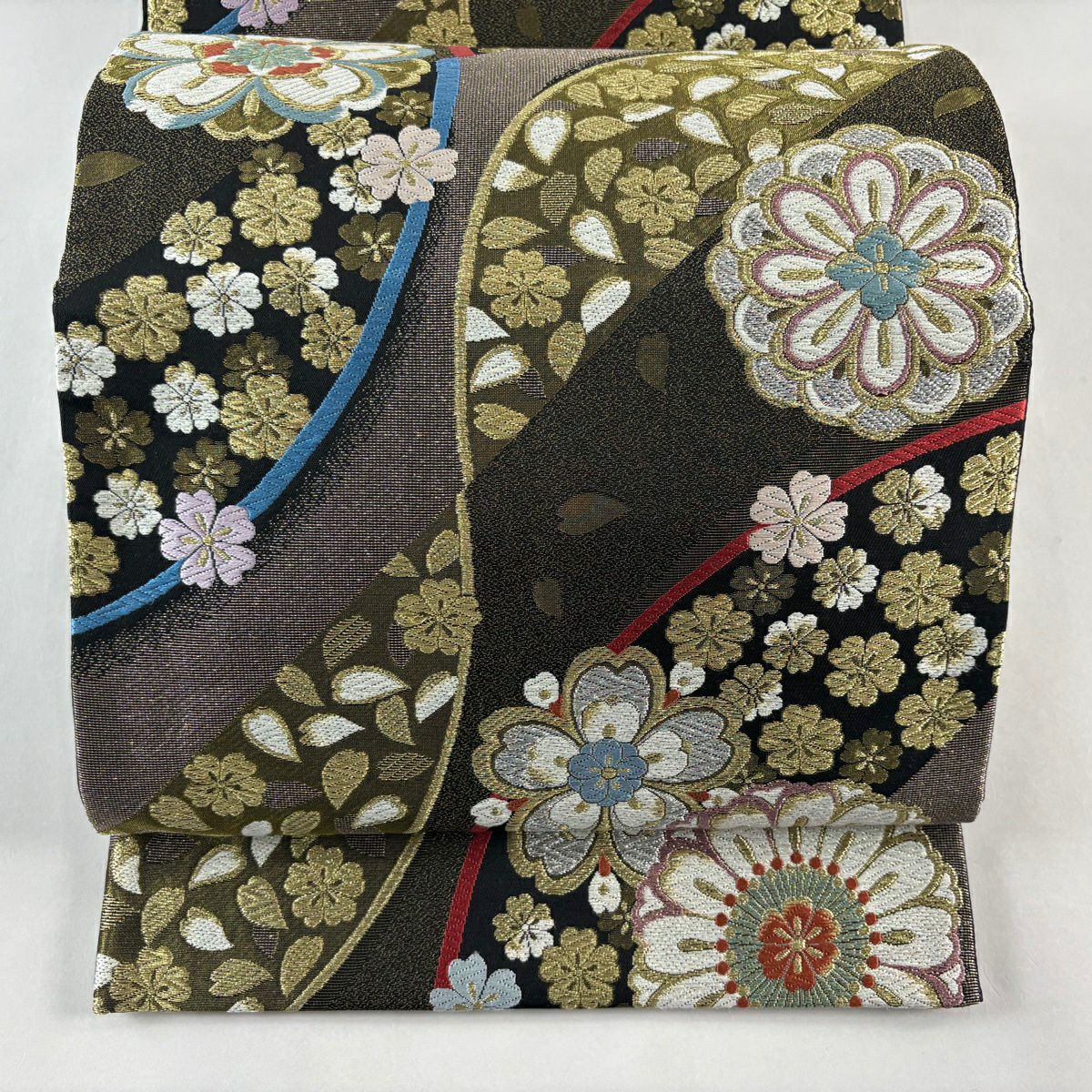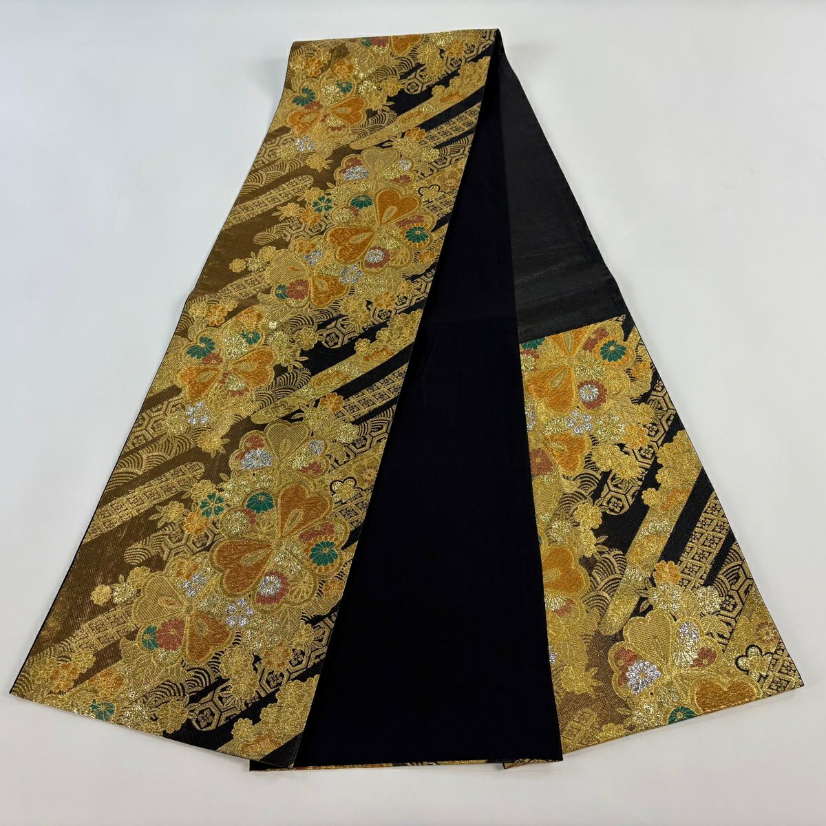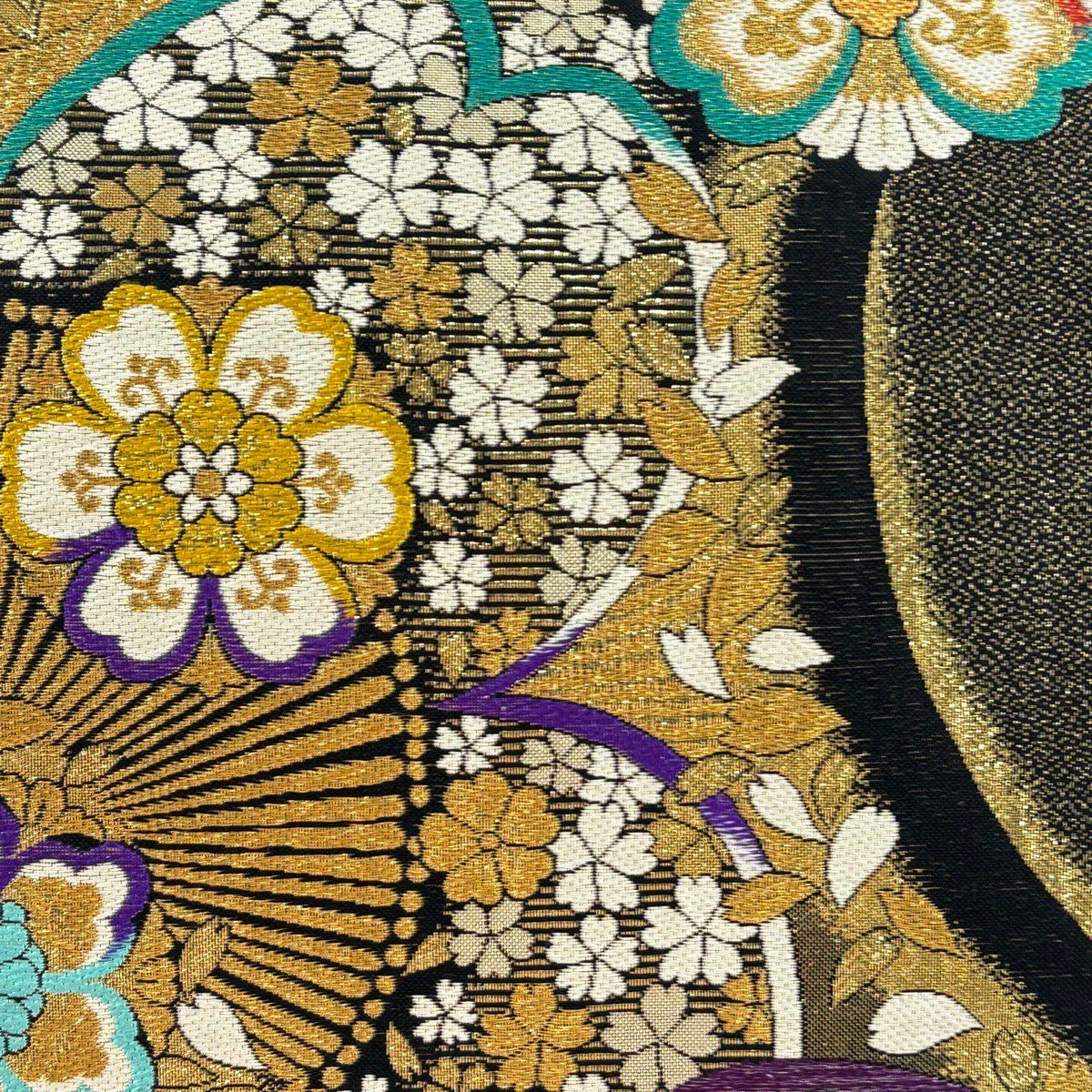 【美品】 袋帯 秀品 葉は 花びら 金糸 箔 黒 六通 正絹