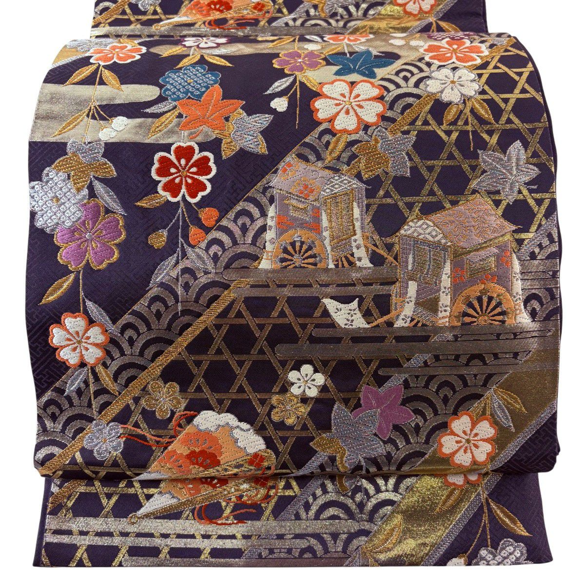 袋帯 秀品 枝垂れ桜 御所車 唐織 金銀糸 濃紫 六通 正絹