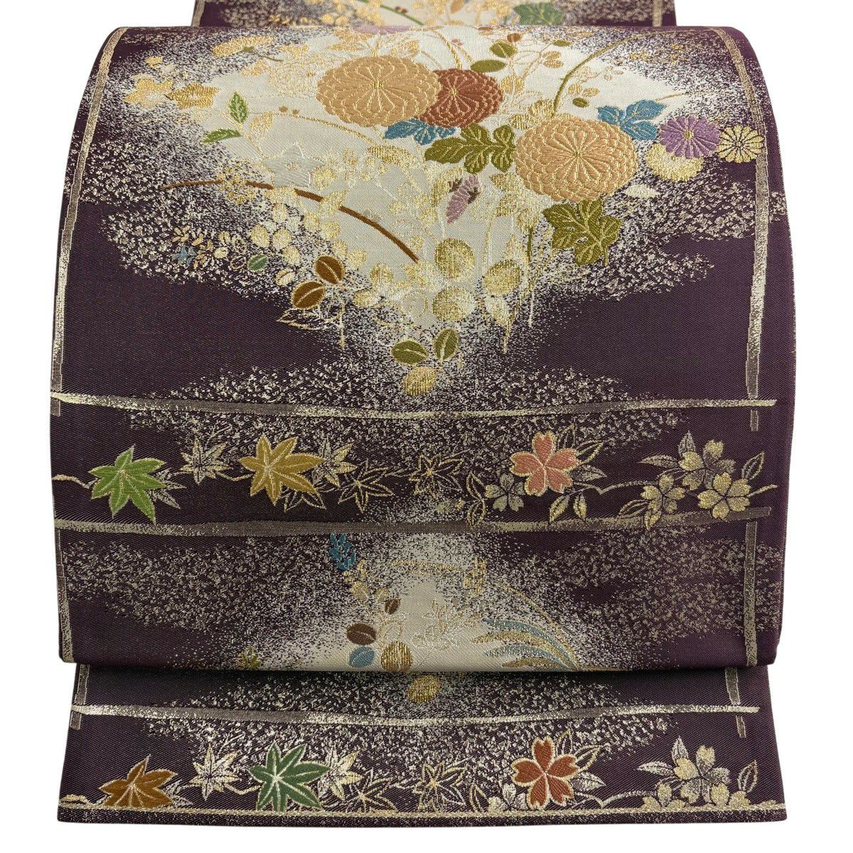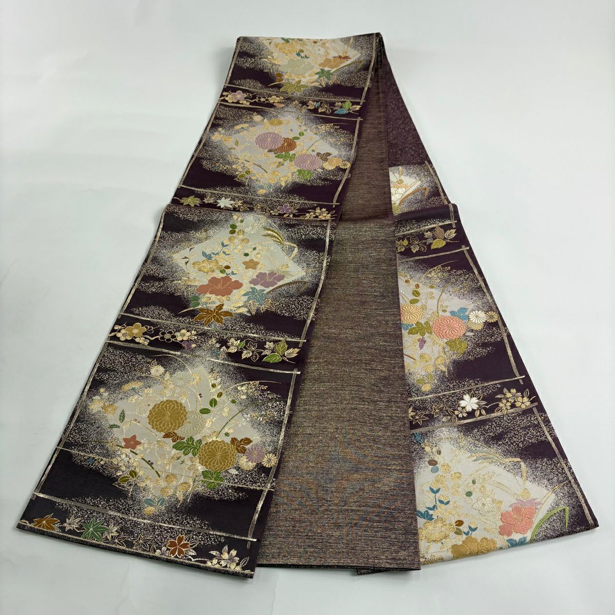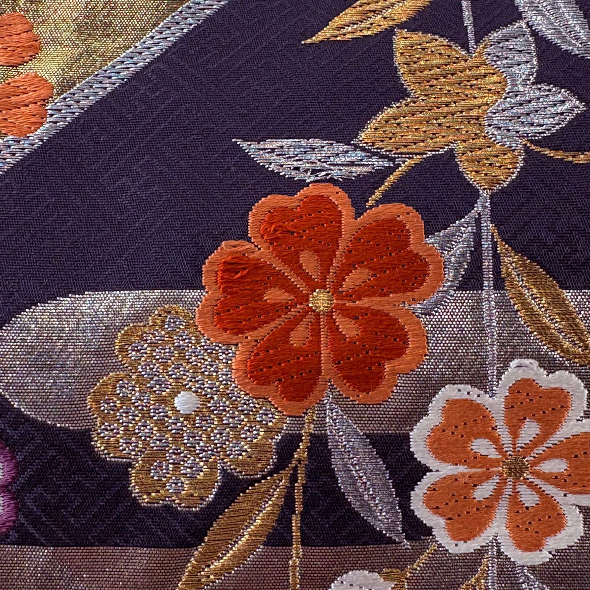 袋帯 秀品 関西仕立て 秋草 枝梅 刺繍 箔 紫 六通 正絹