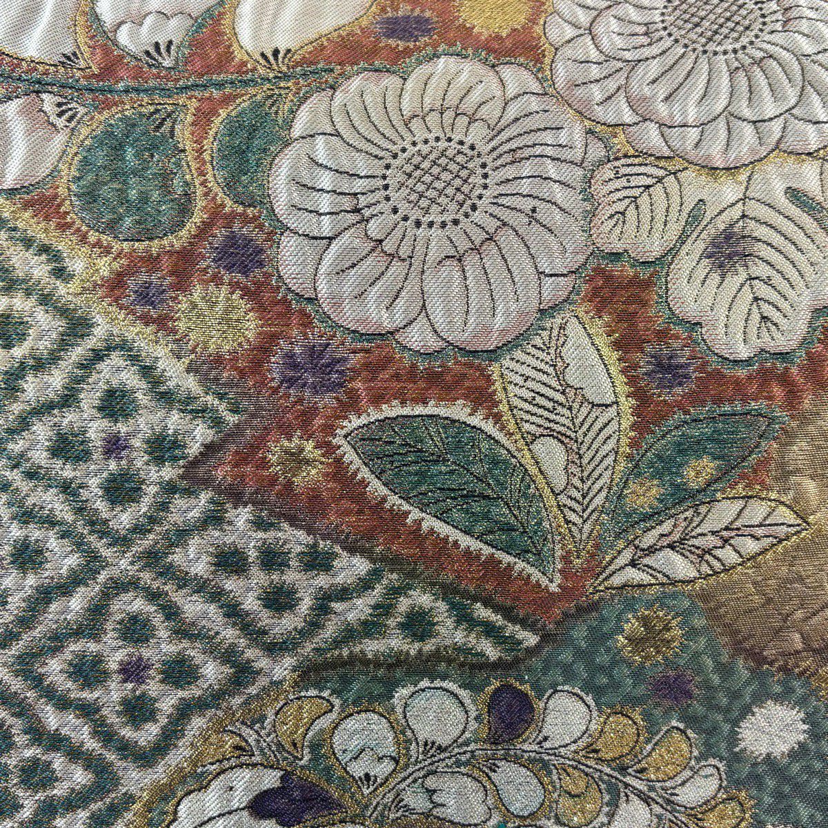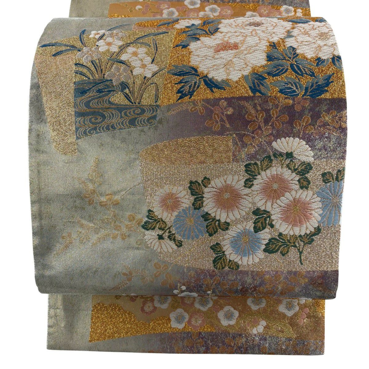 【美品】 袋帯 秀品 菊 枝梅 箔 金銀糸 銀色 全通 正絹
