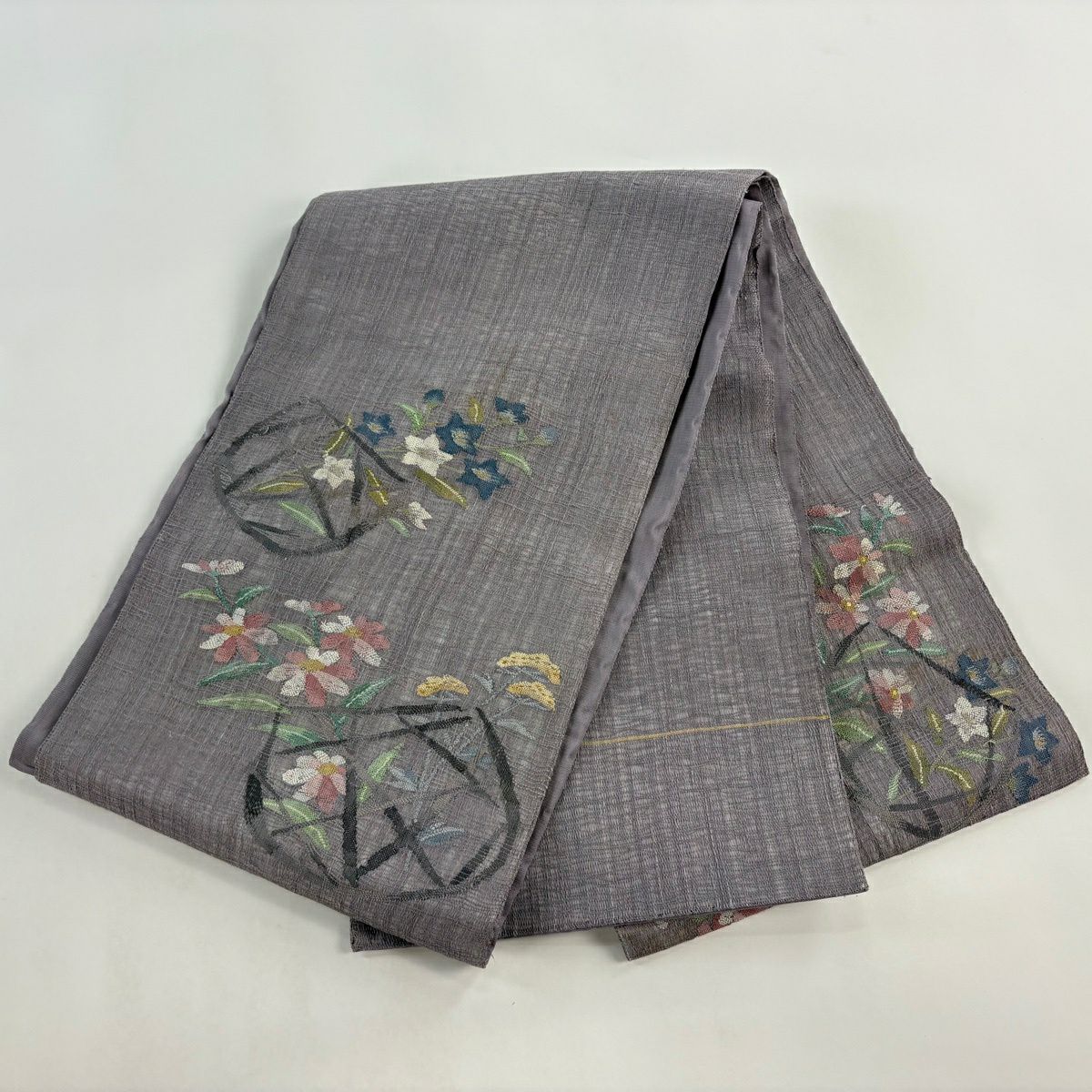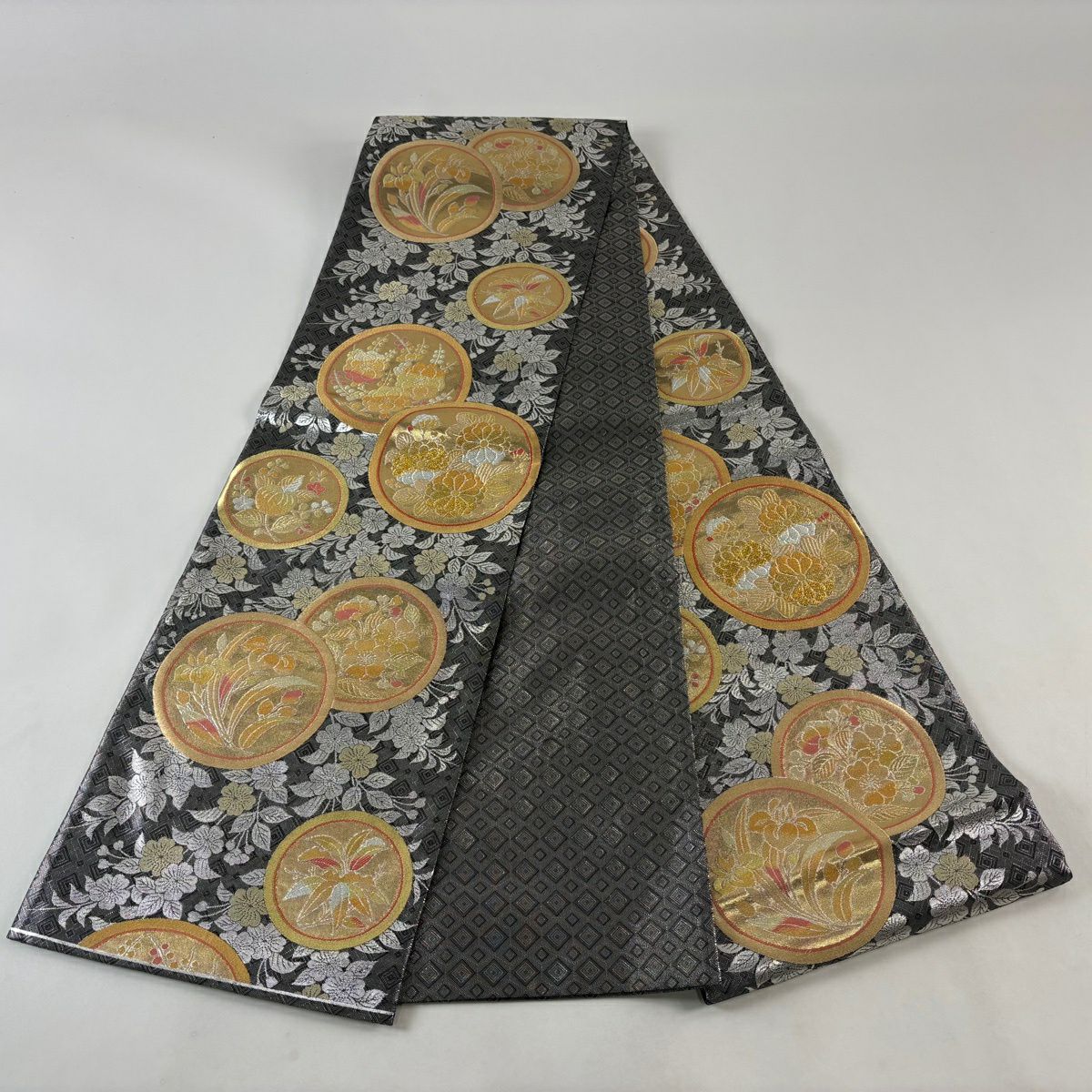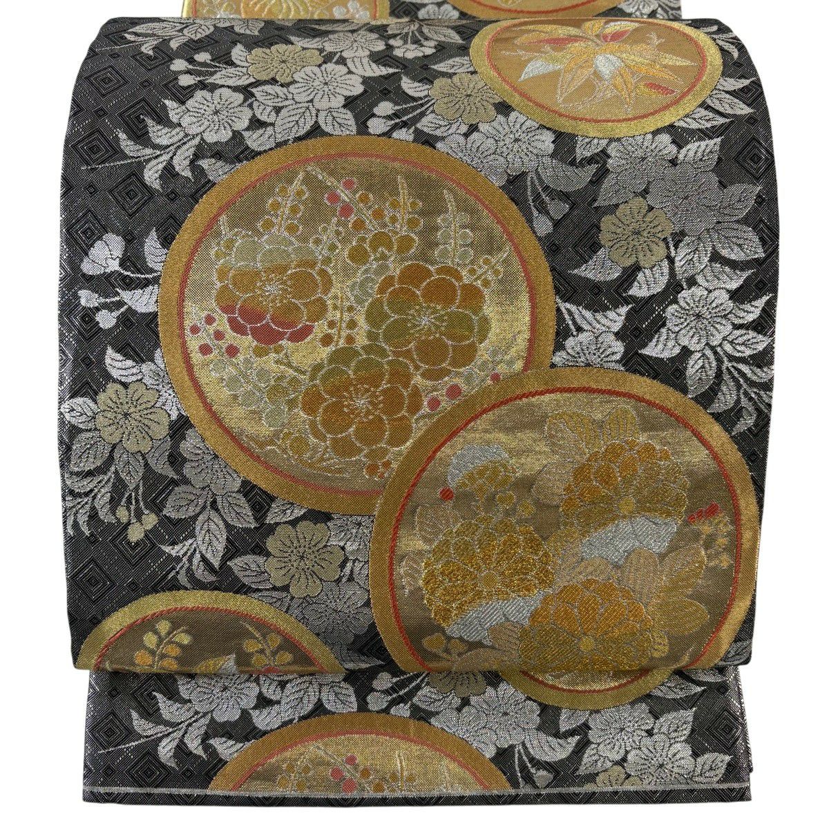 【美品】 袋帯 秀品 雪輪 草花 金糸 箔 灰色 六通 正絹