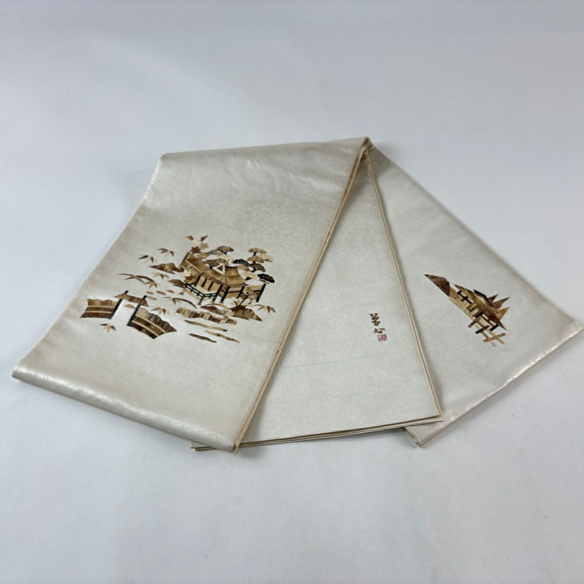 袋帯 秀品 落款あり 家屋 松 箔 クリーム お太鼓柄 正絹
