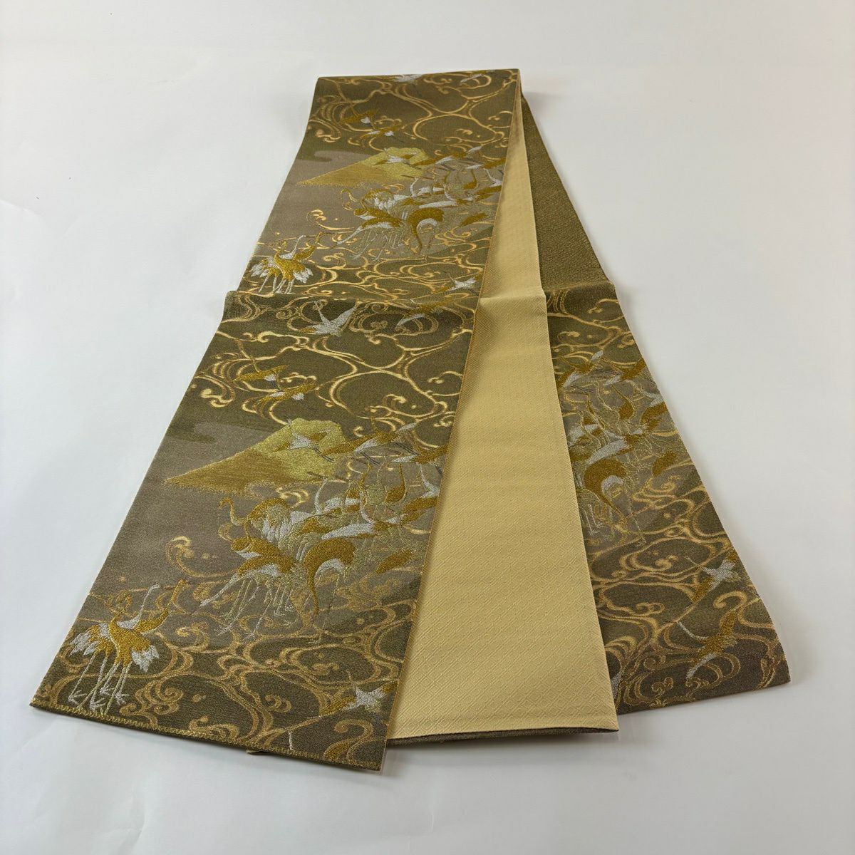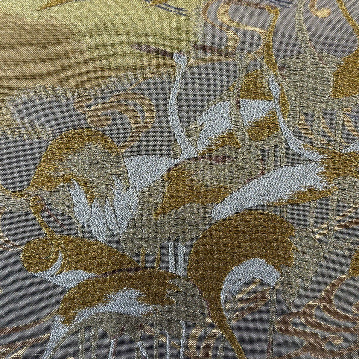 【美品】 袋帯 秀品 群鶴図 流水 金糸 箔 金色 六通 正絹