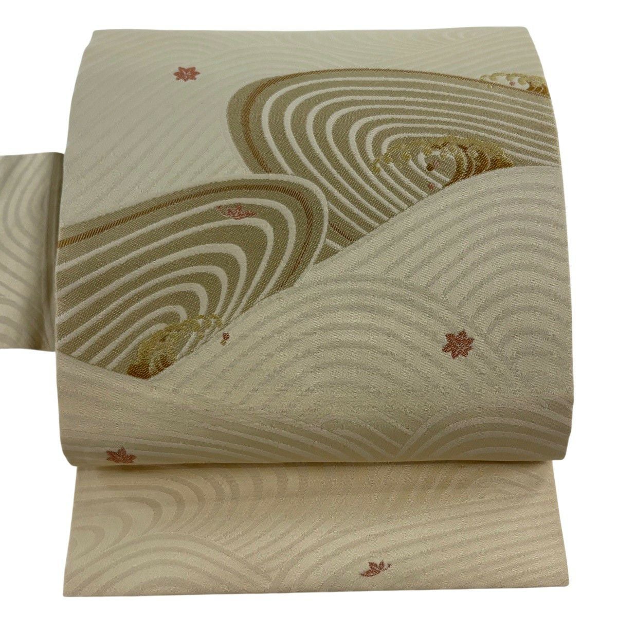 【美品】 名古屋帯 秀品 波頭 もみじ 金糸 クリーム 正絹