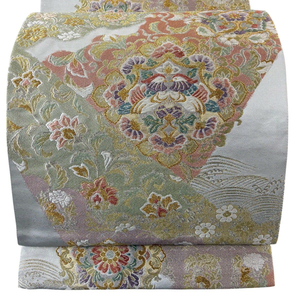 【美品】 袋帯 秀品 花鳥 波 金銀糸 箔 灰色 六通 正絹
