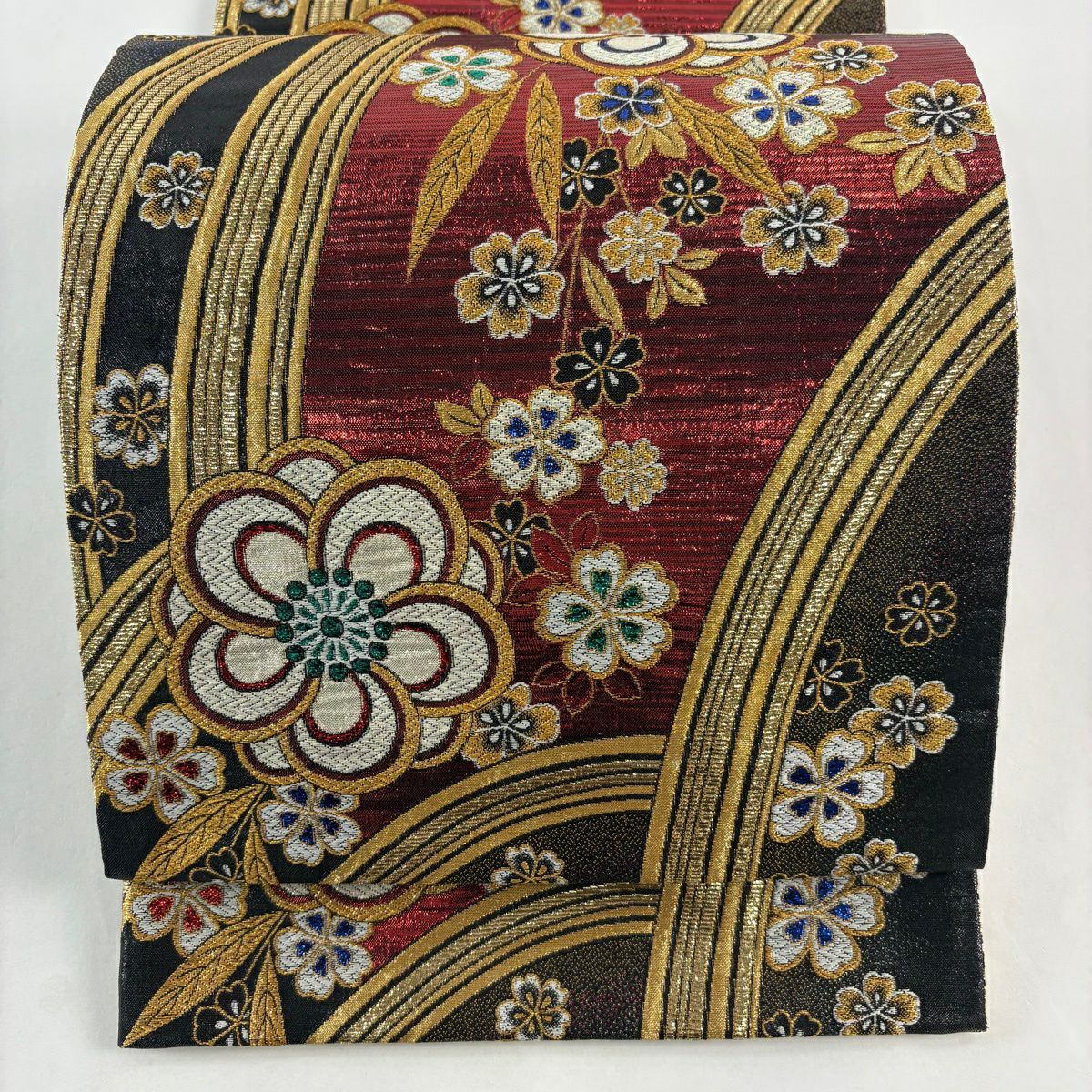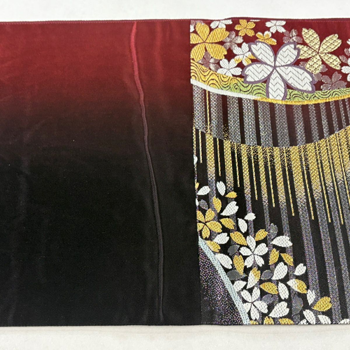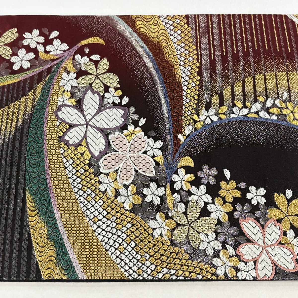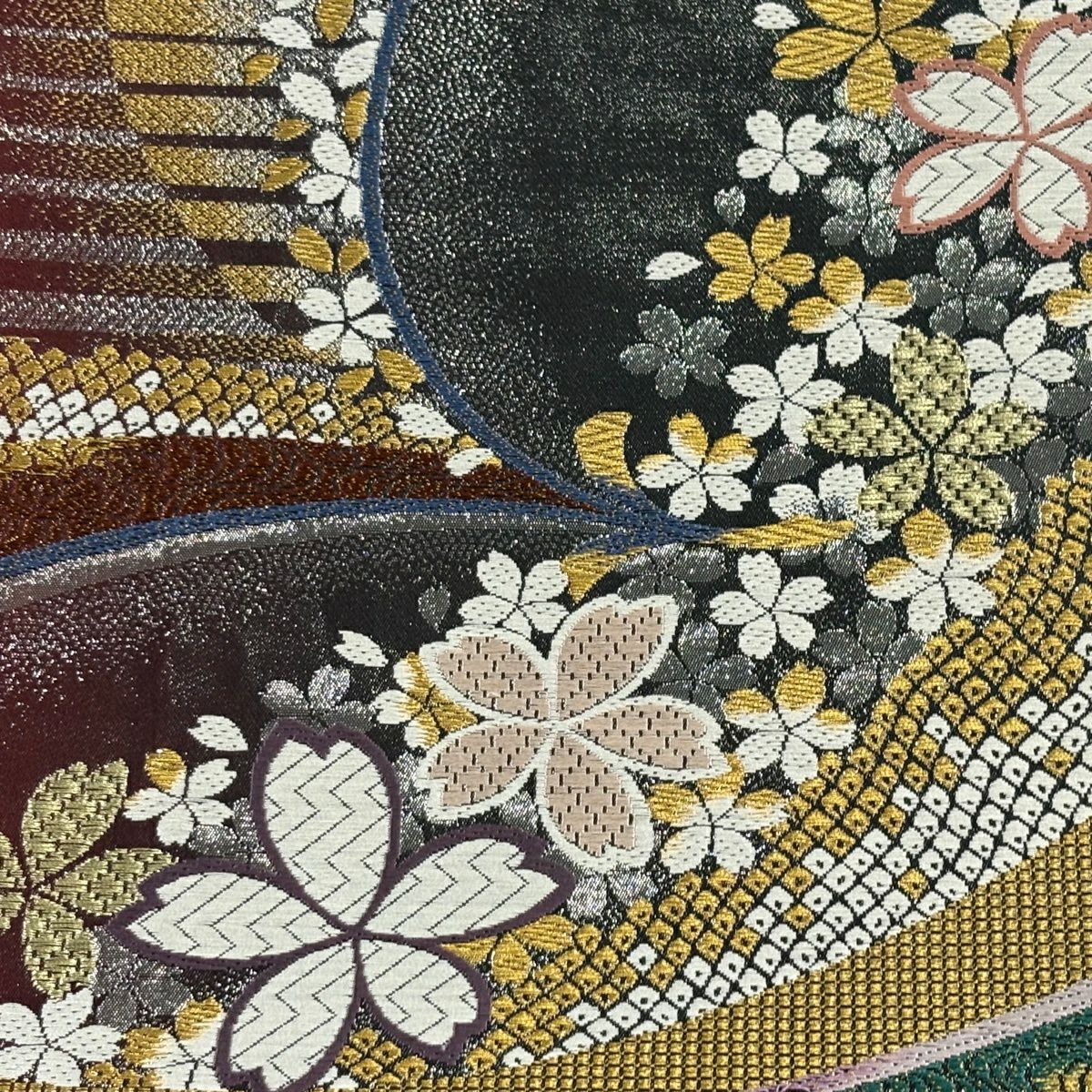 【美品】 袋帯 秀品 桜 縞 唐織 箔 えんじ色 六通 正絹