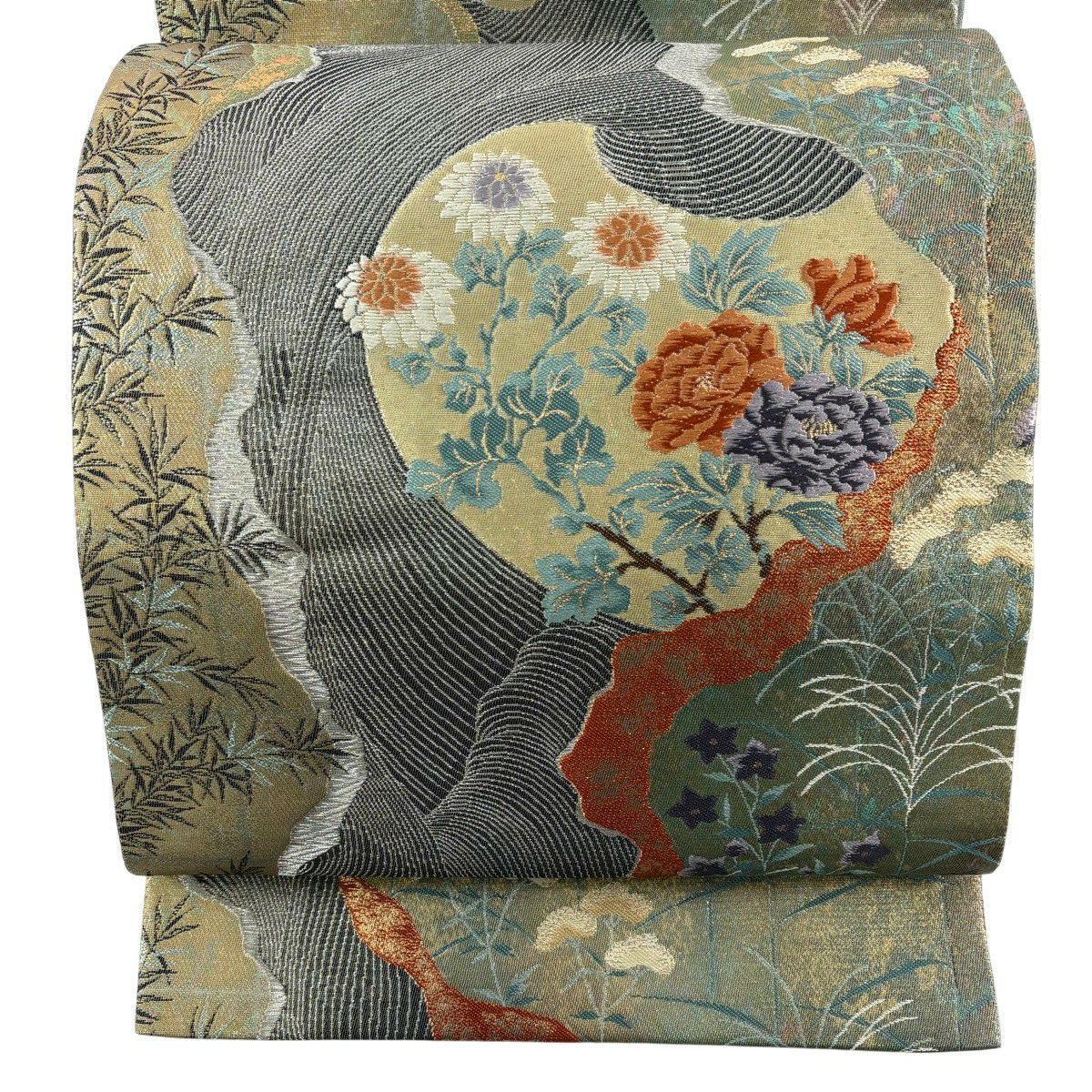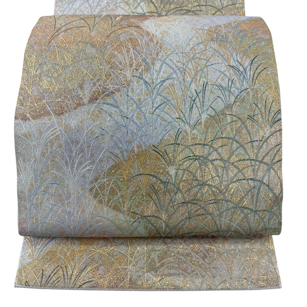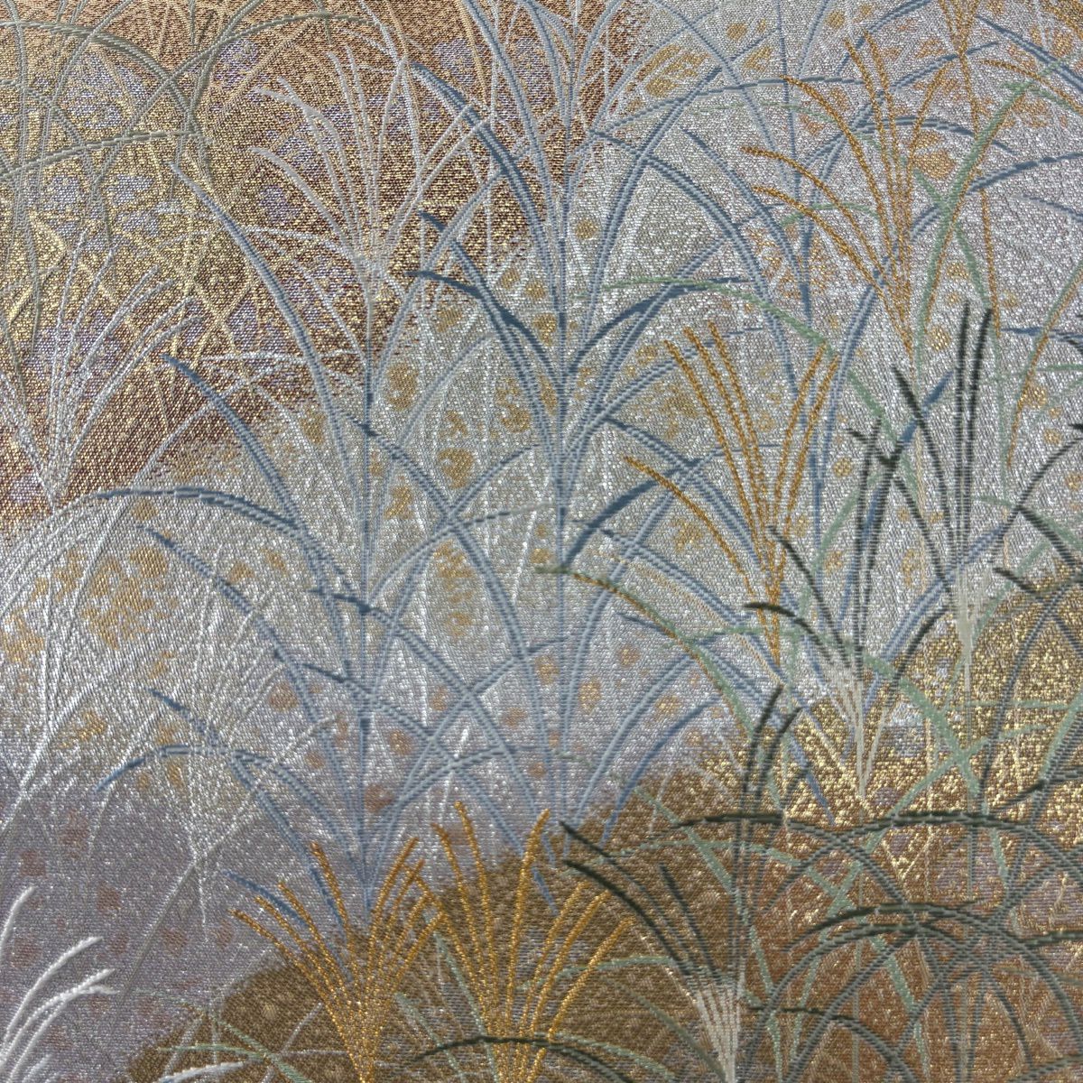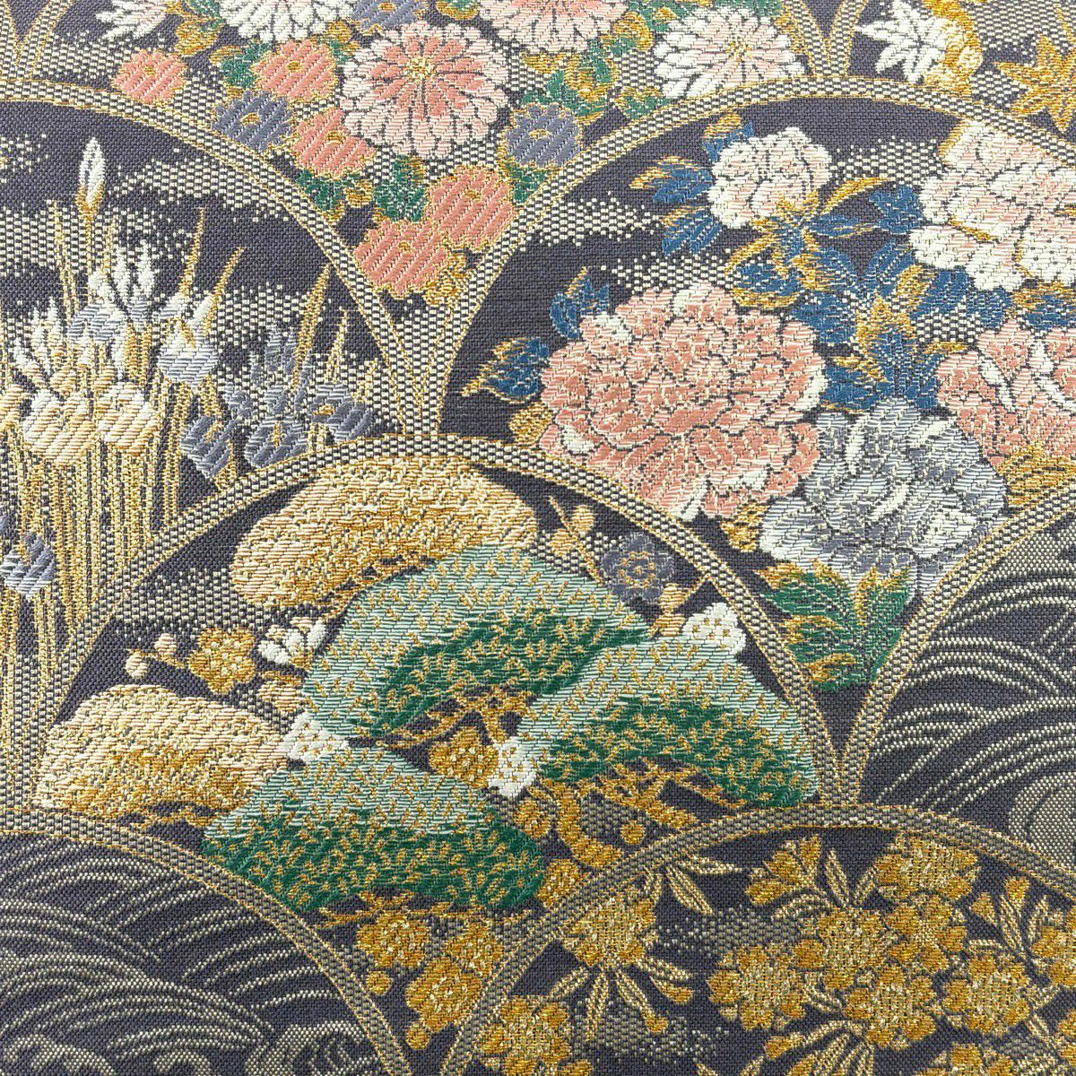 【美品】 袋帯 秀品 草花 芝 金糸 青灰色 お太鼓柄 正絹