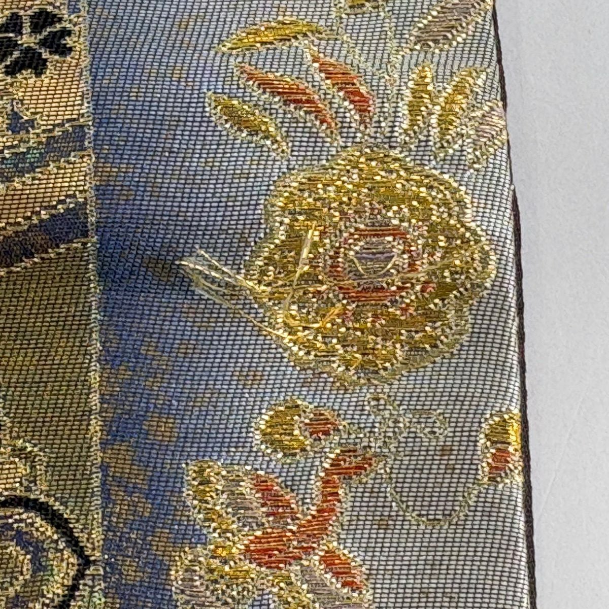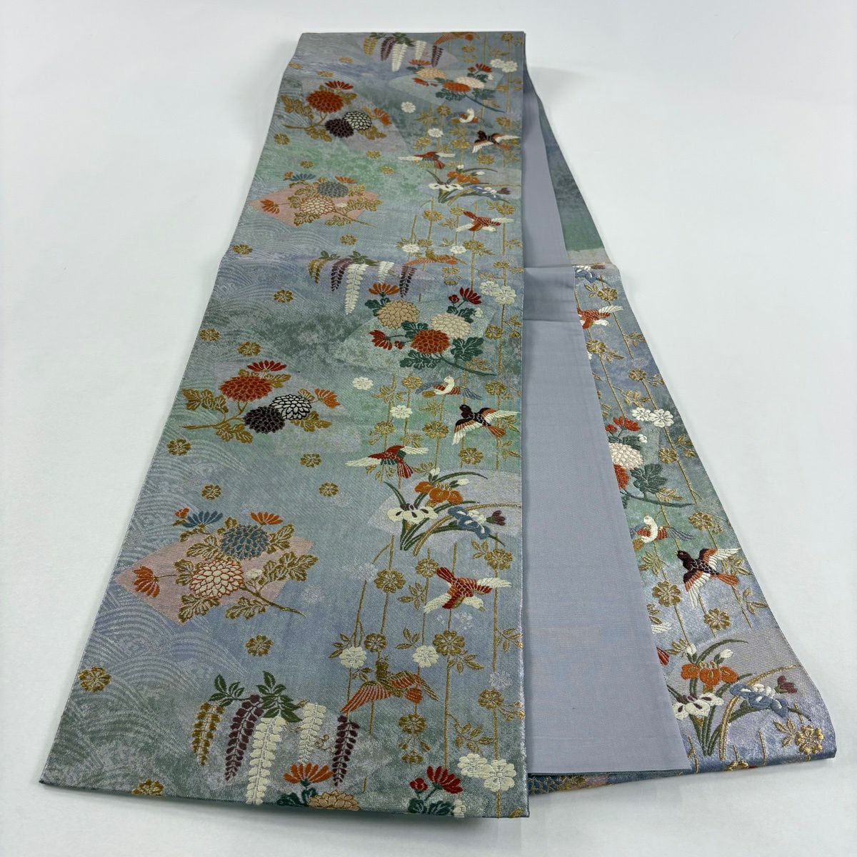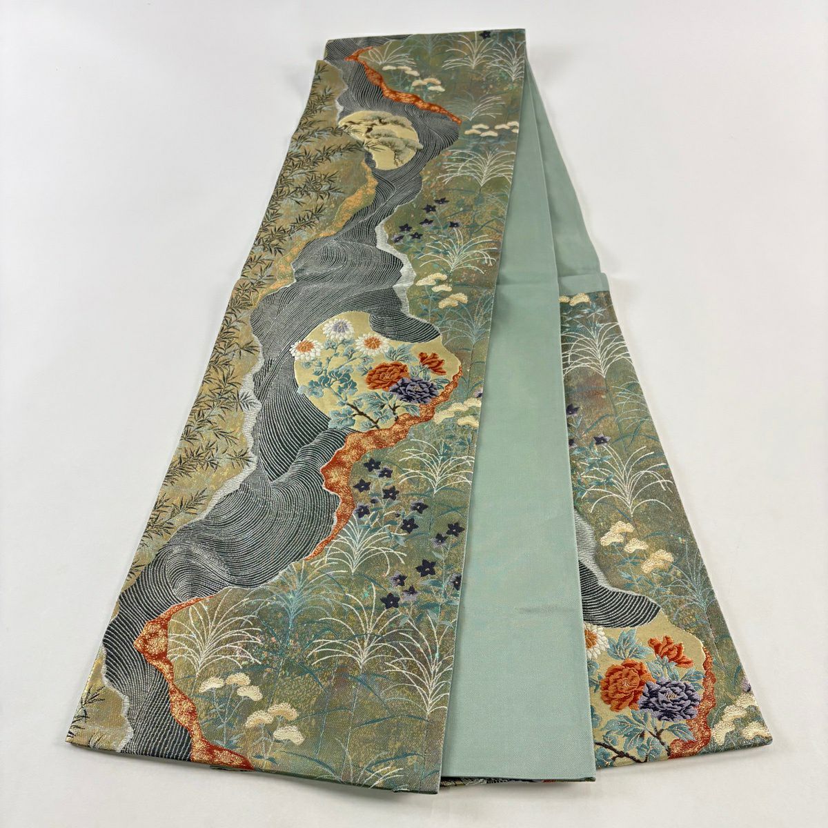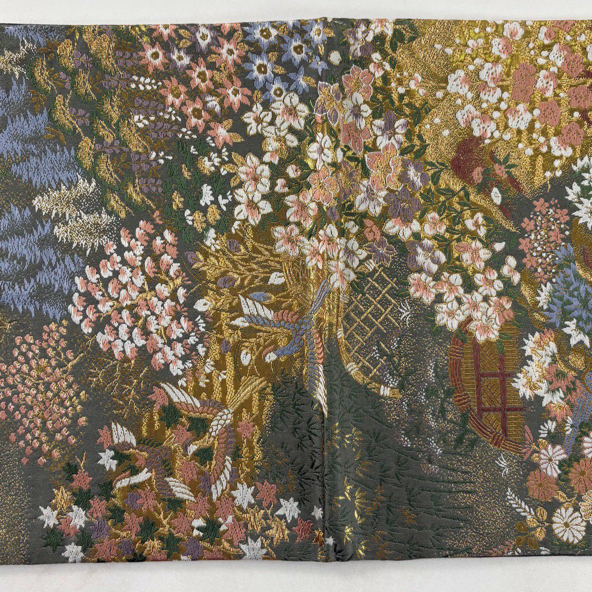 【美品】 袋帯 秀品 草花 芝 金糸 青灰色 お太鼓柄 正絹