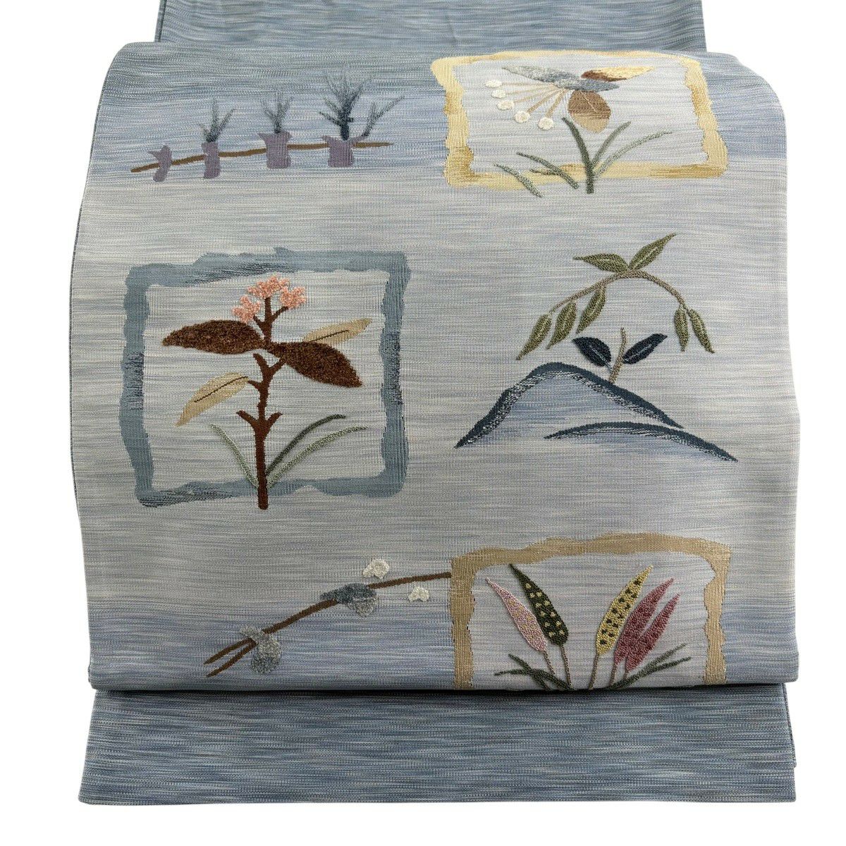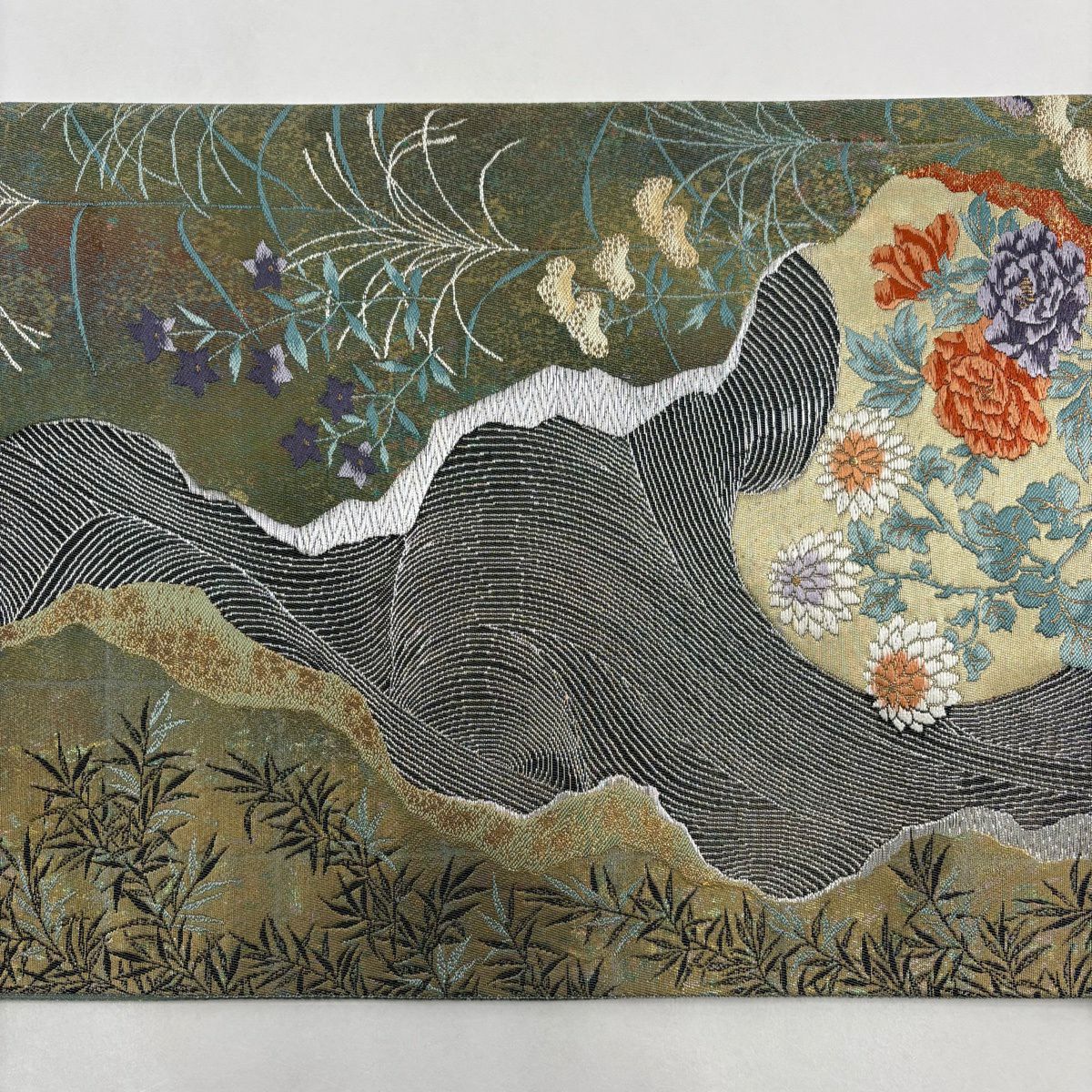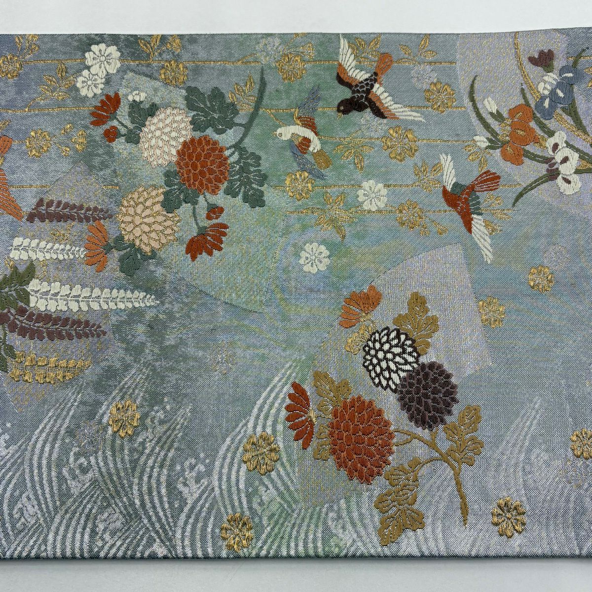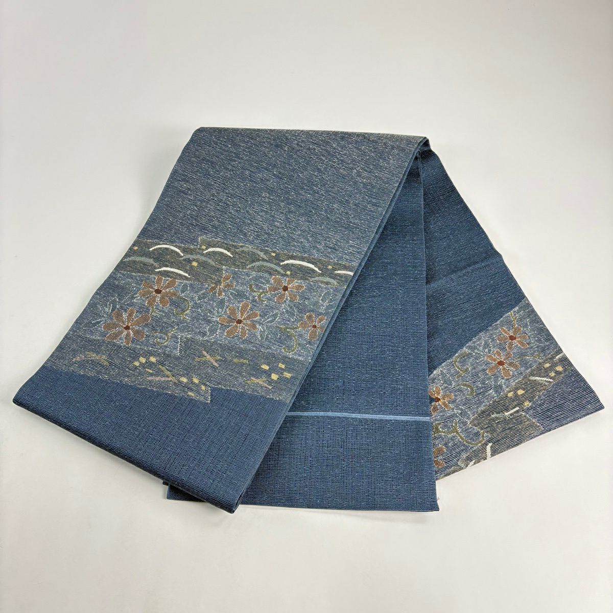 【美品】 袋帯 秀品 草花 芝 金糸 青灰色 お太鼓柄 正絹