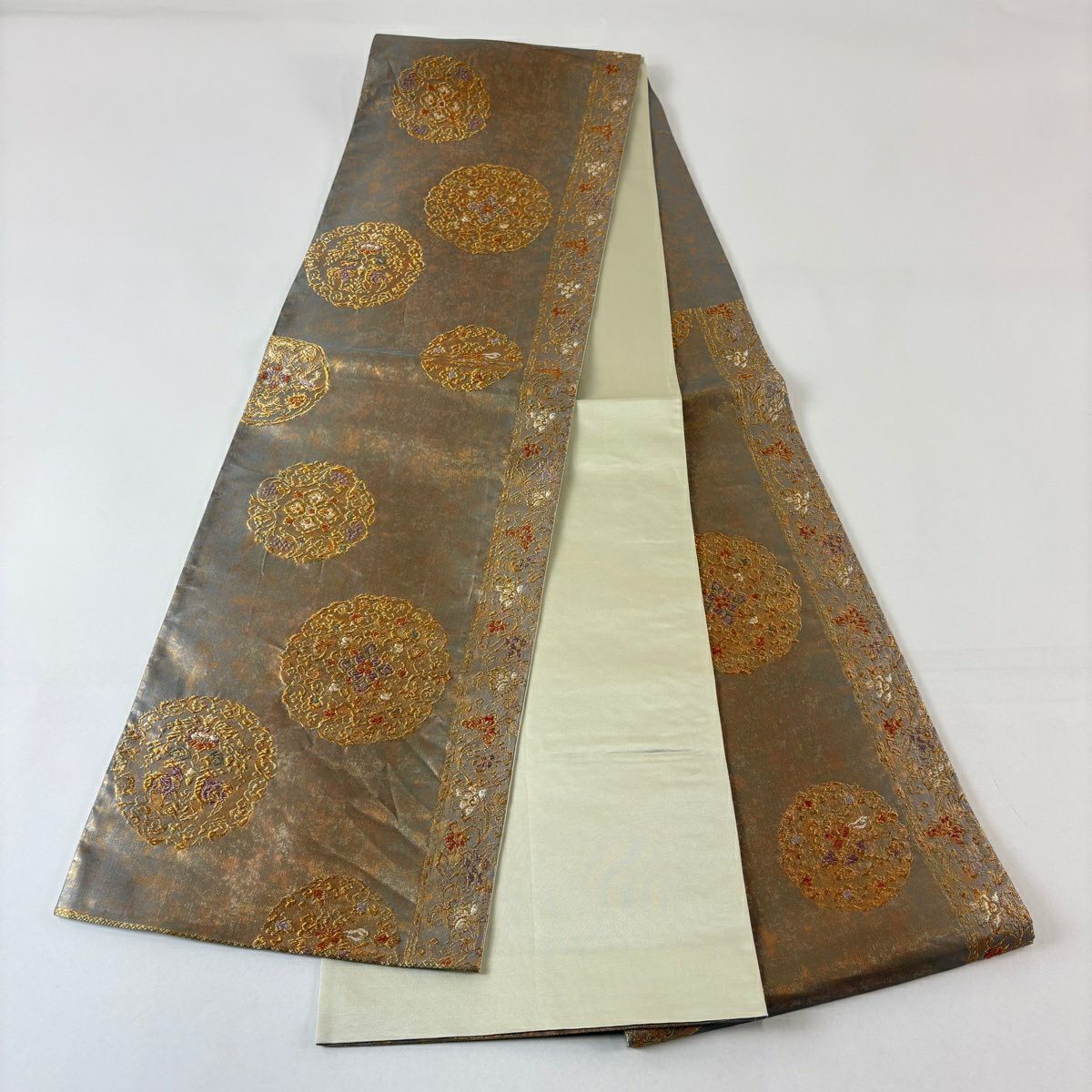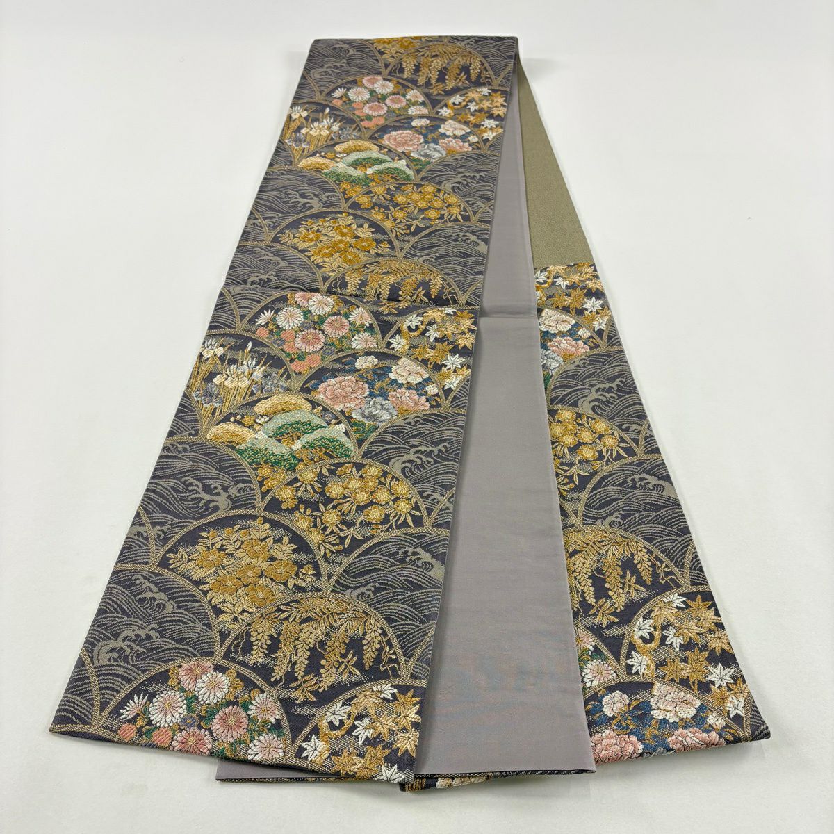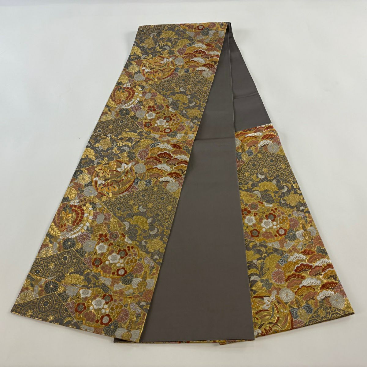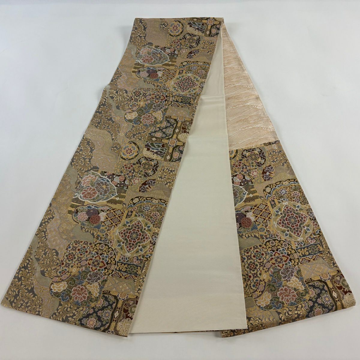 【美品】 袋帯 秀品 華文 草花 金糸 箔 灰茶 六通 正絹