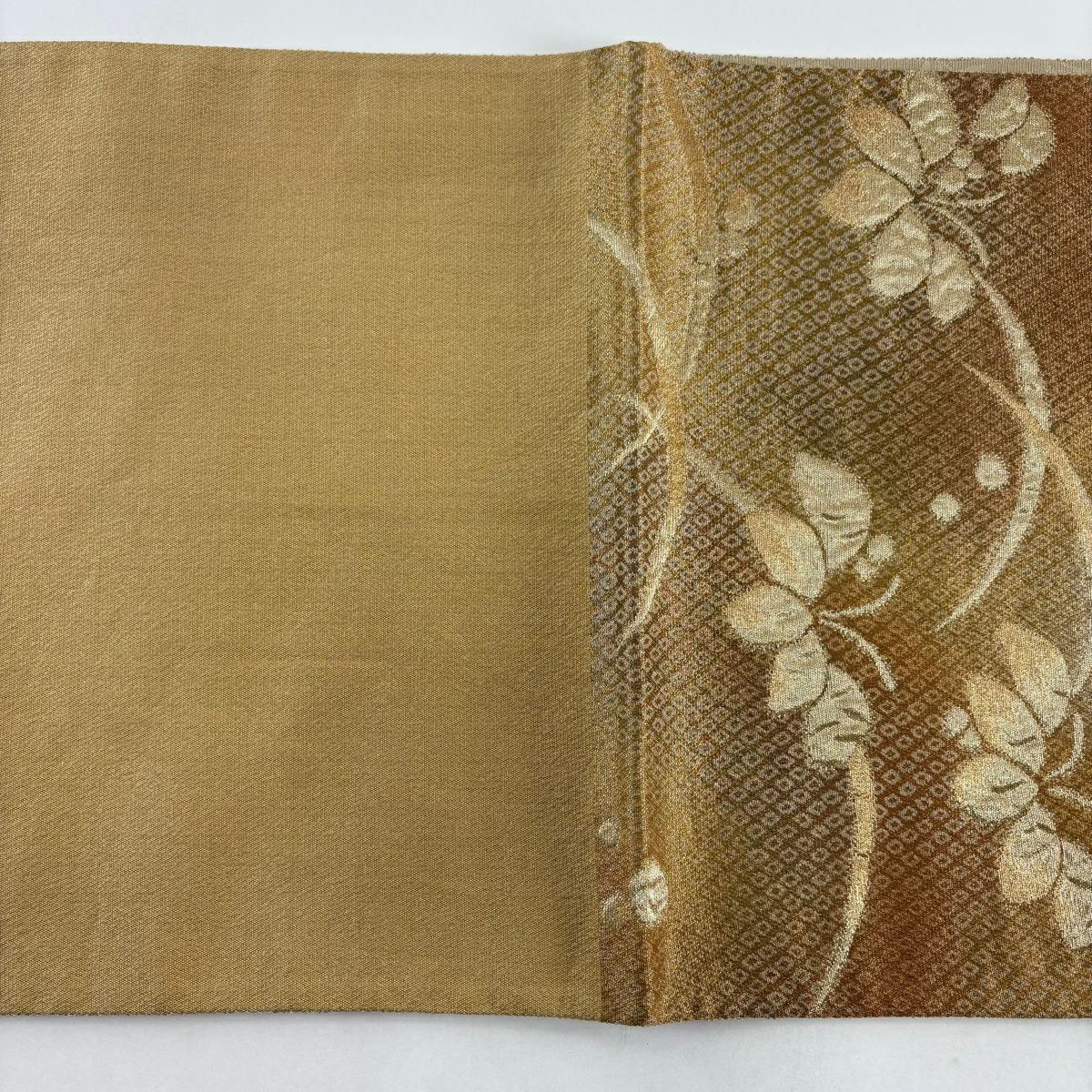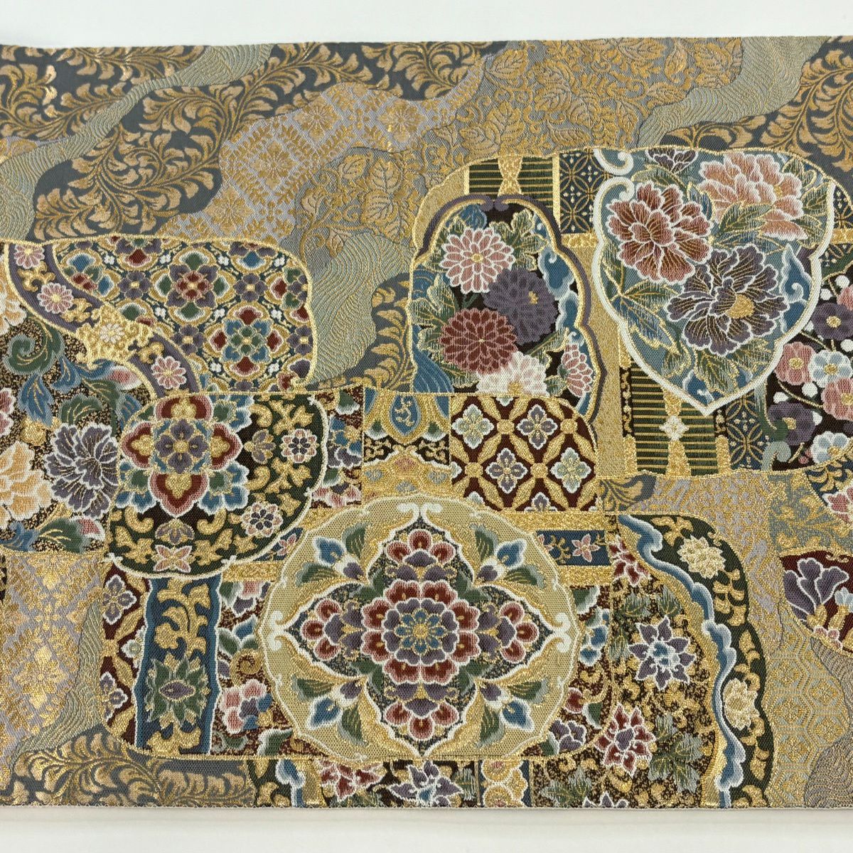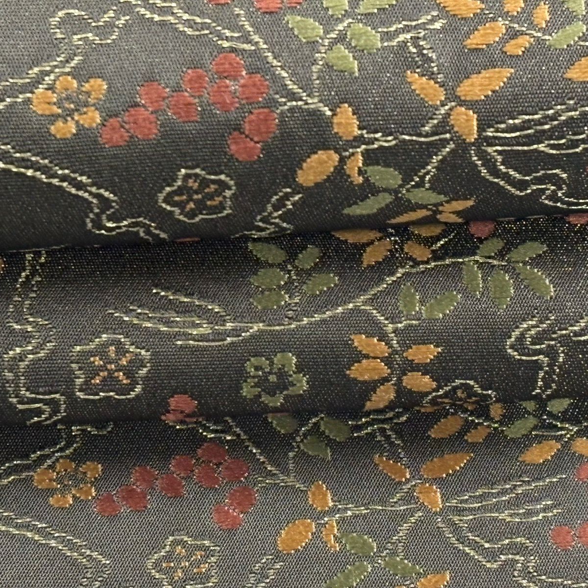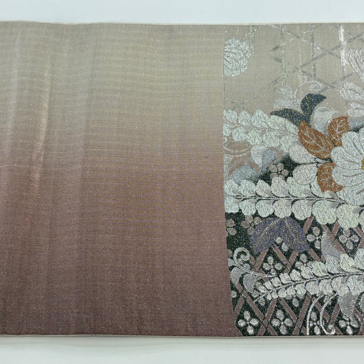 【美品】 袋帯 秀品 華文 草花 金糸 箔 灰茶 六通 正絹