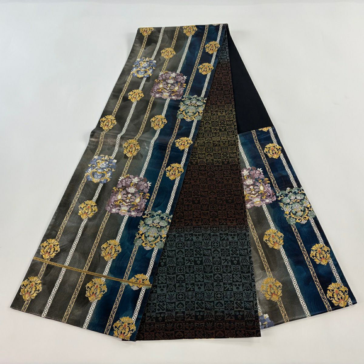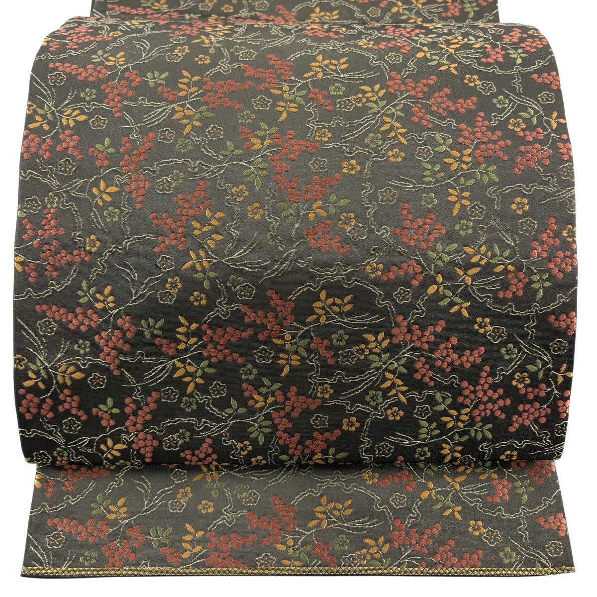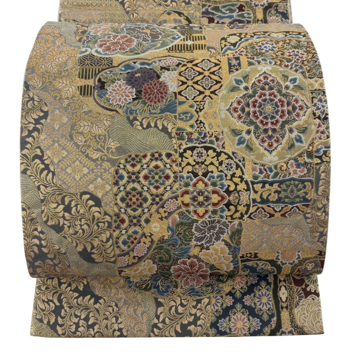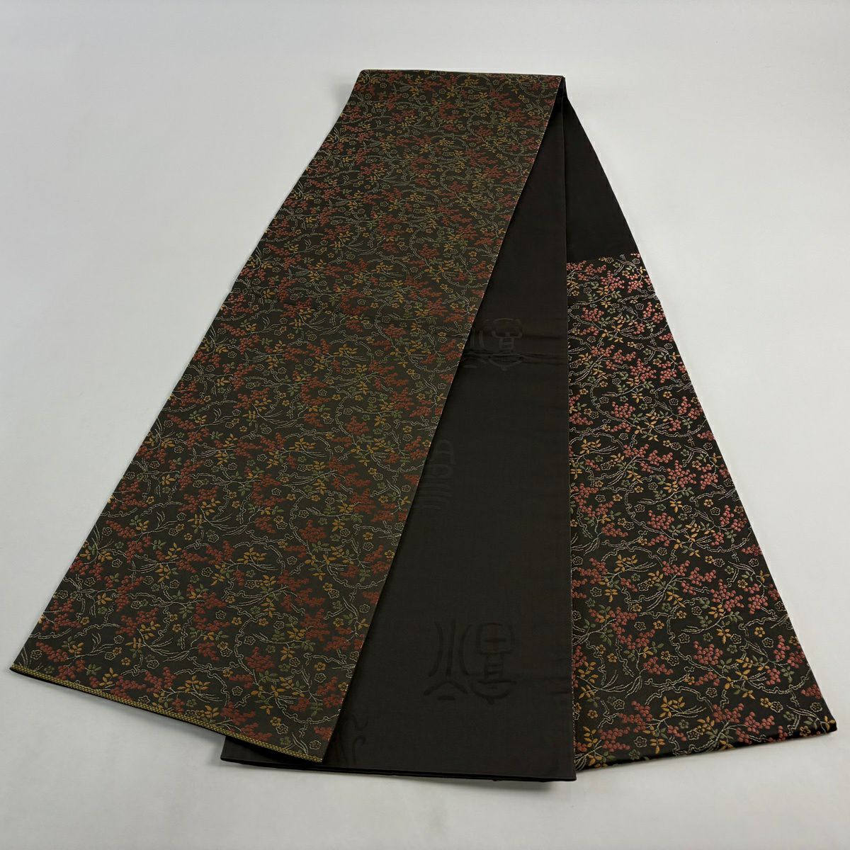 【美品】 袋帯 秀品 華文 草花 金糸 箔 灰茶 六通 正絹
