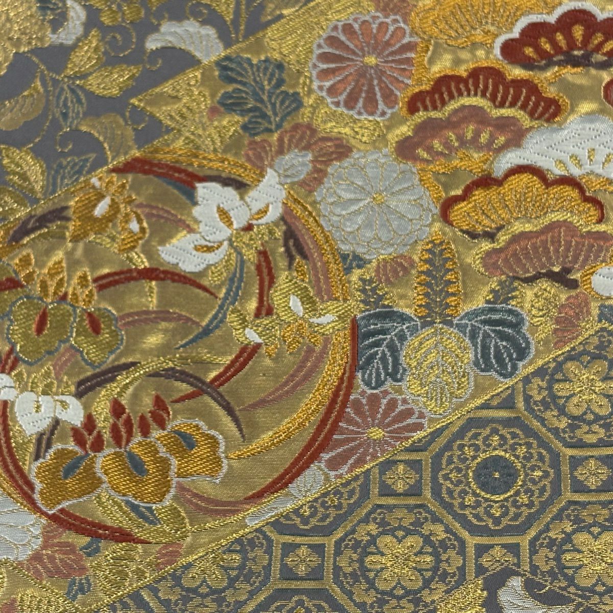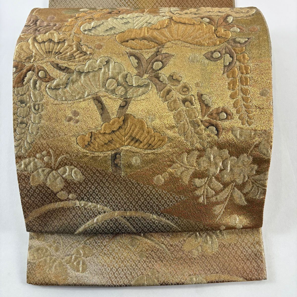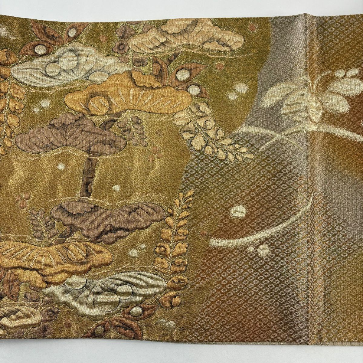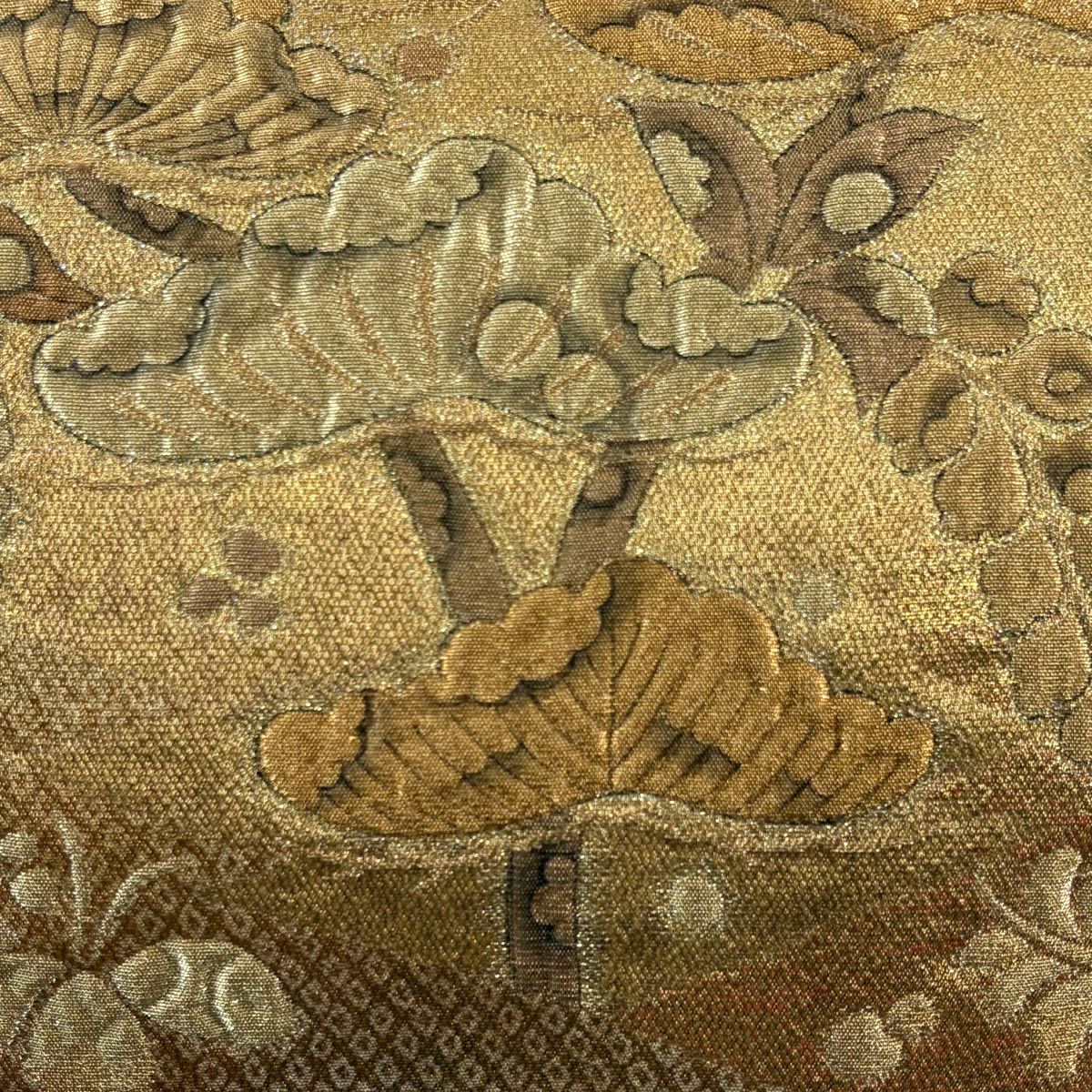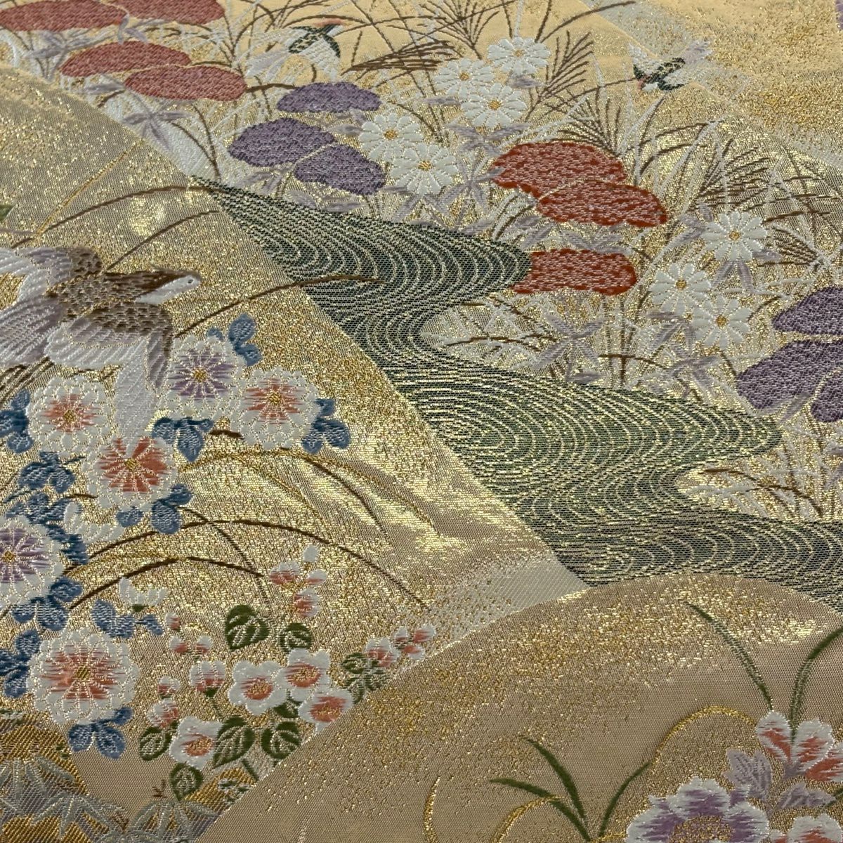 【美品】 袋帯 秀品 松皮菱 草花 金糸 箔 金色 六通 正絹