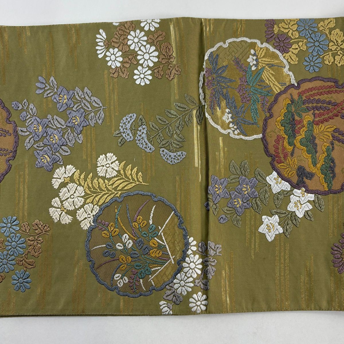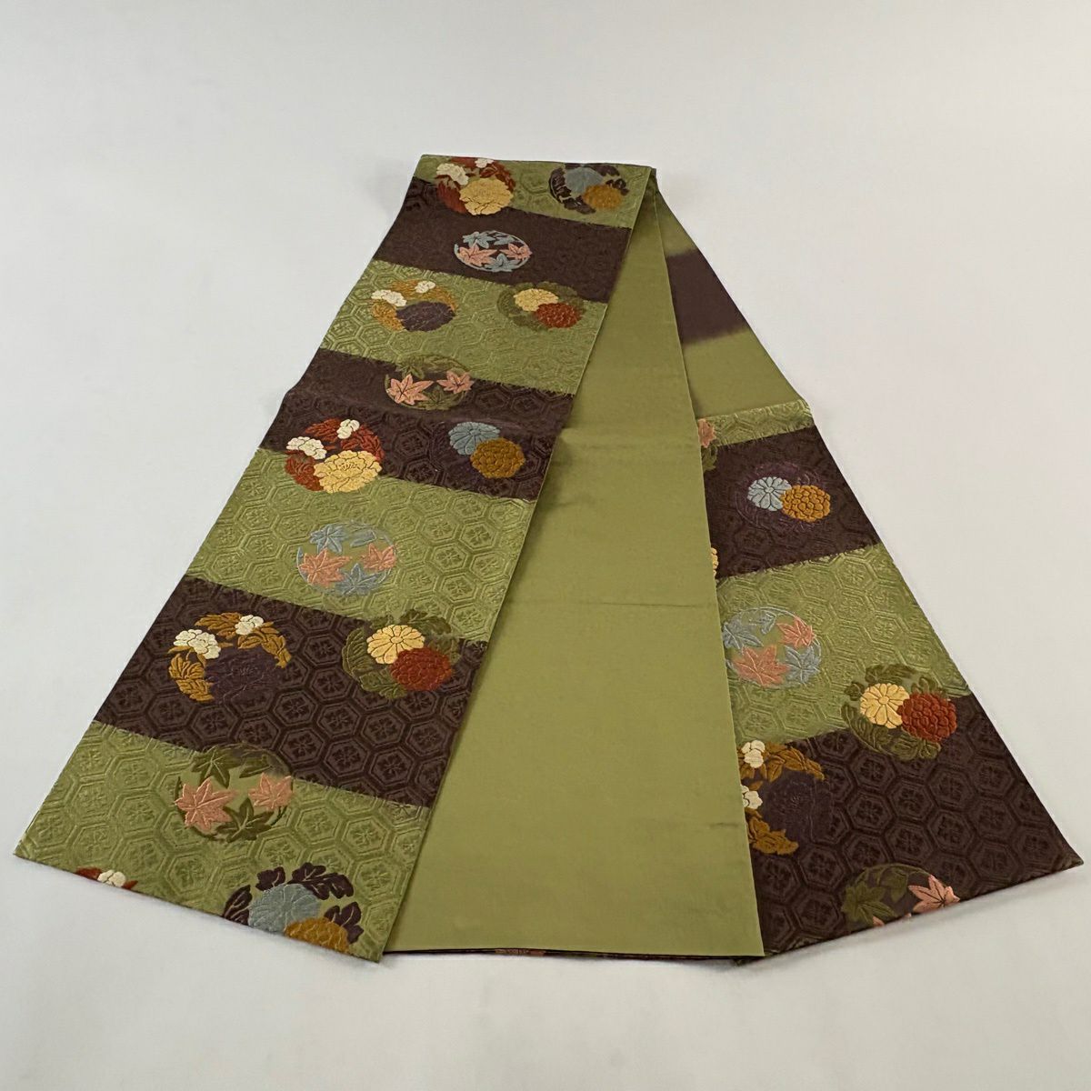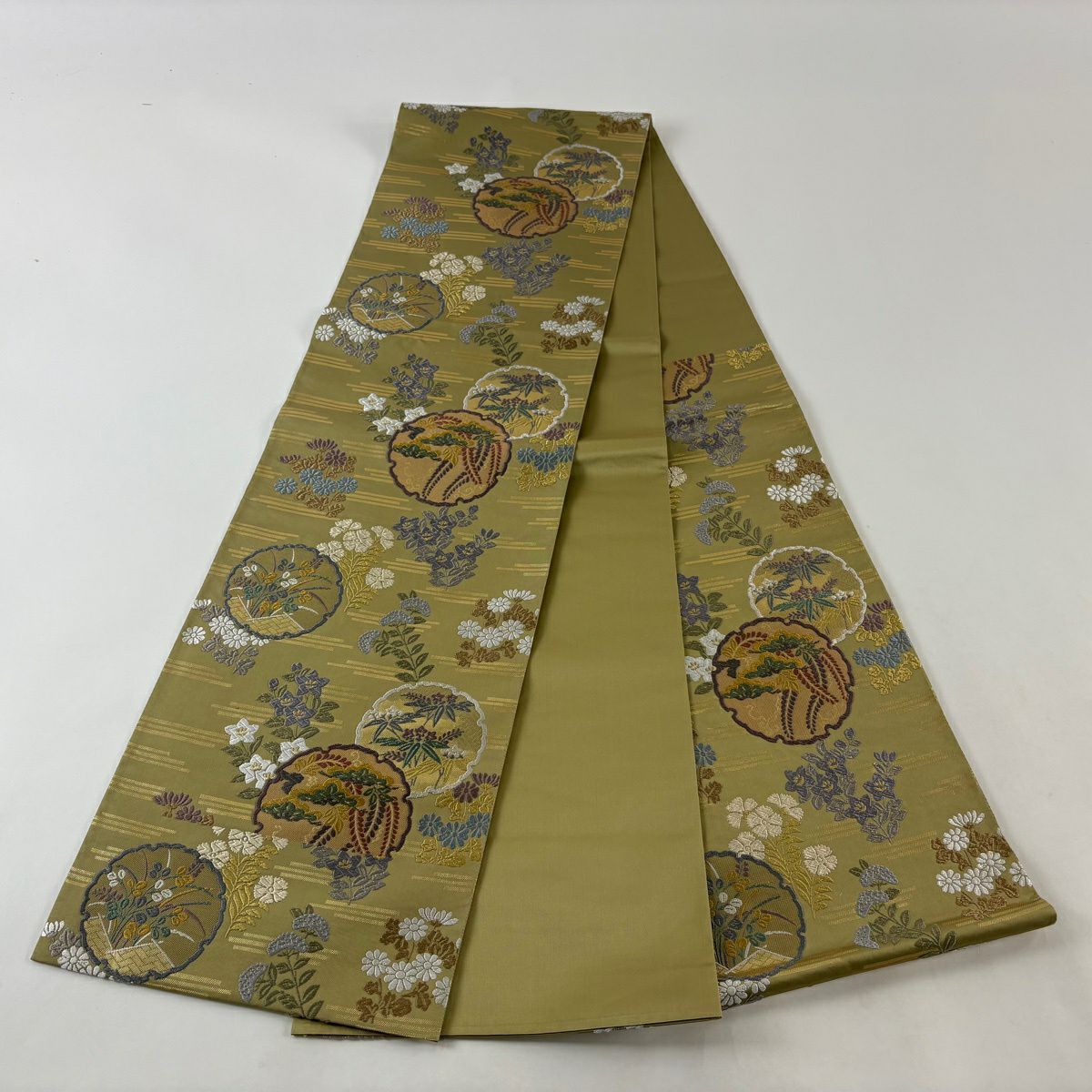 【美品】 袋帯 秀品 花丸文 段縞 唐織 抹茶色 六通 正絹