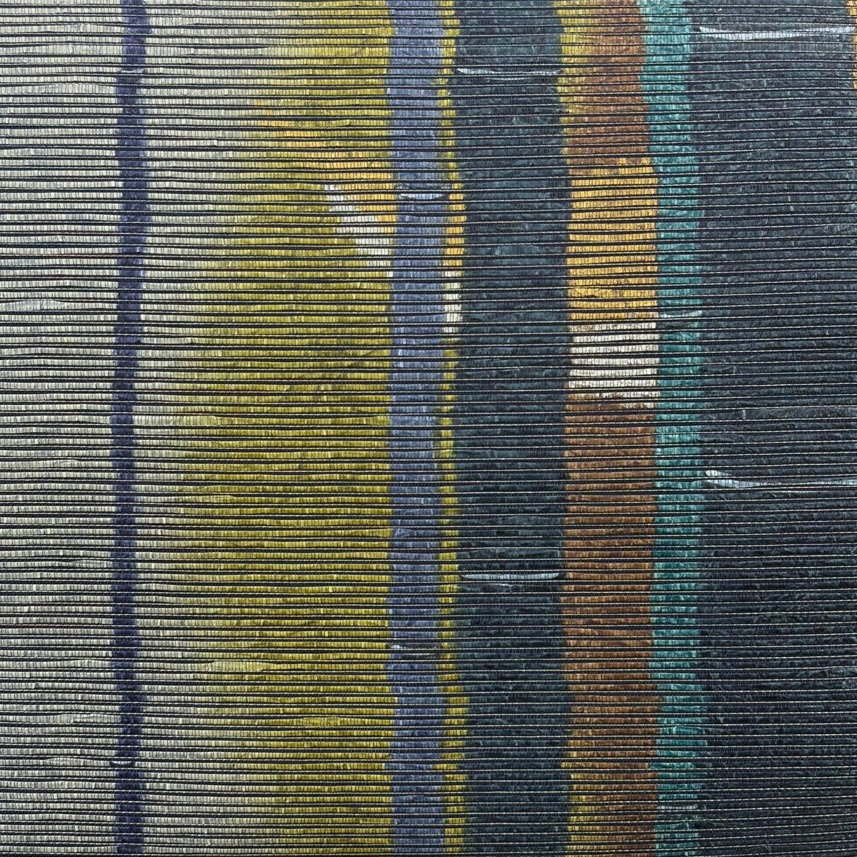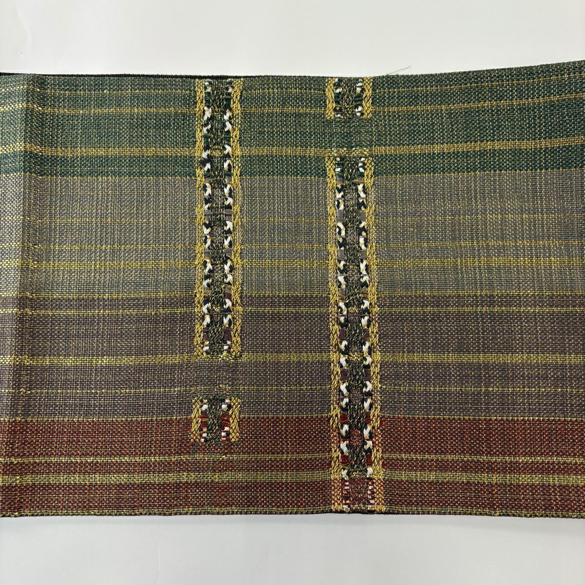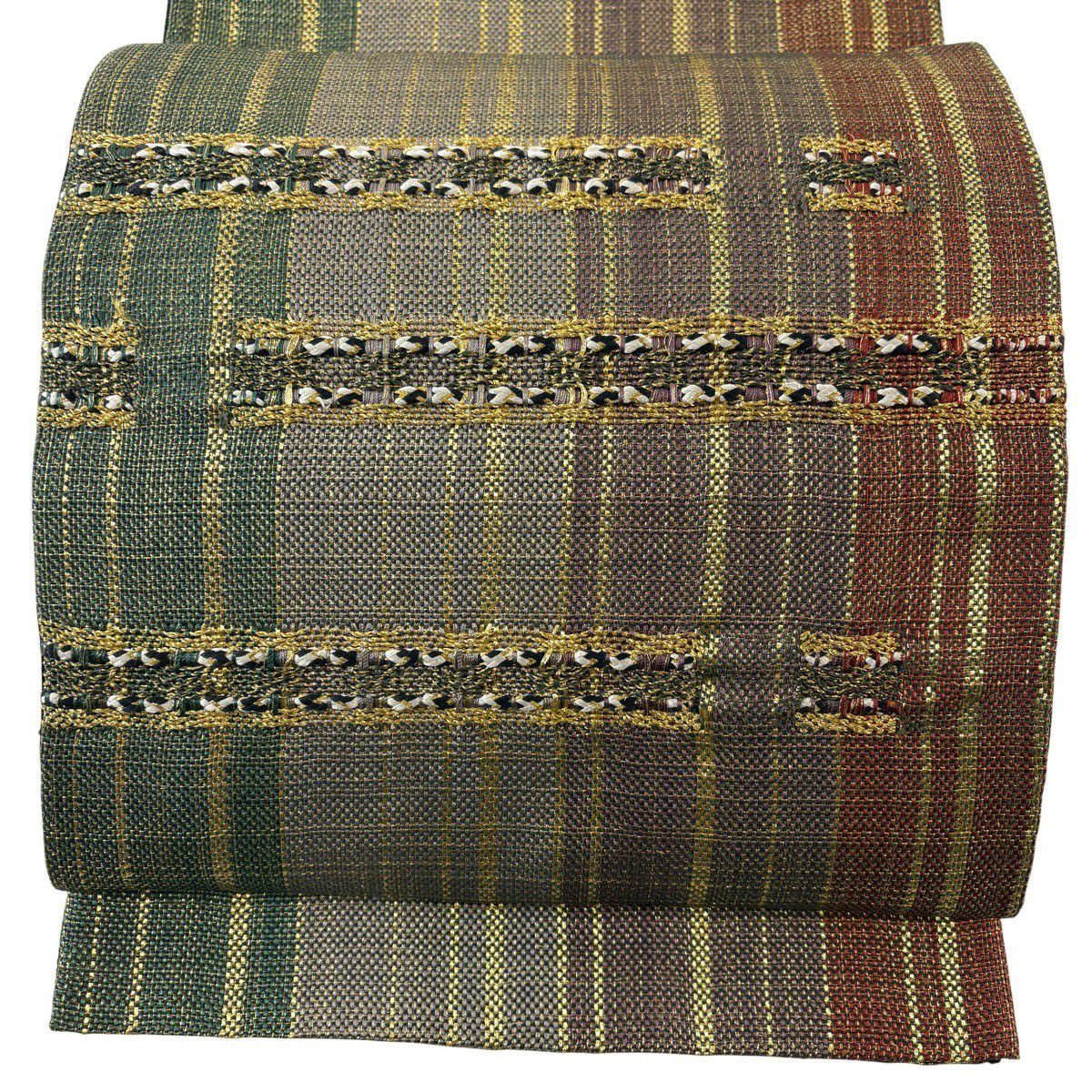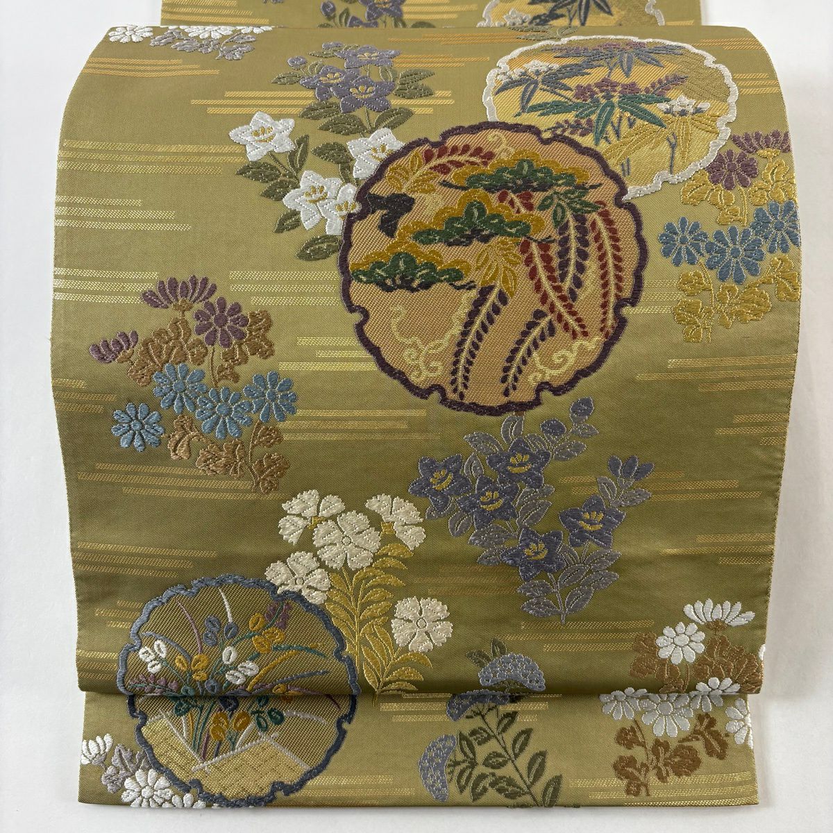 【美品】 袋帯 秀品 花丸文 段縞 唐織 抹茶色 六通 正絹