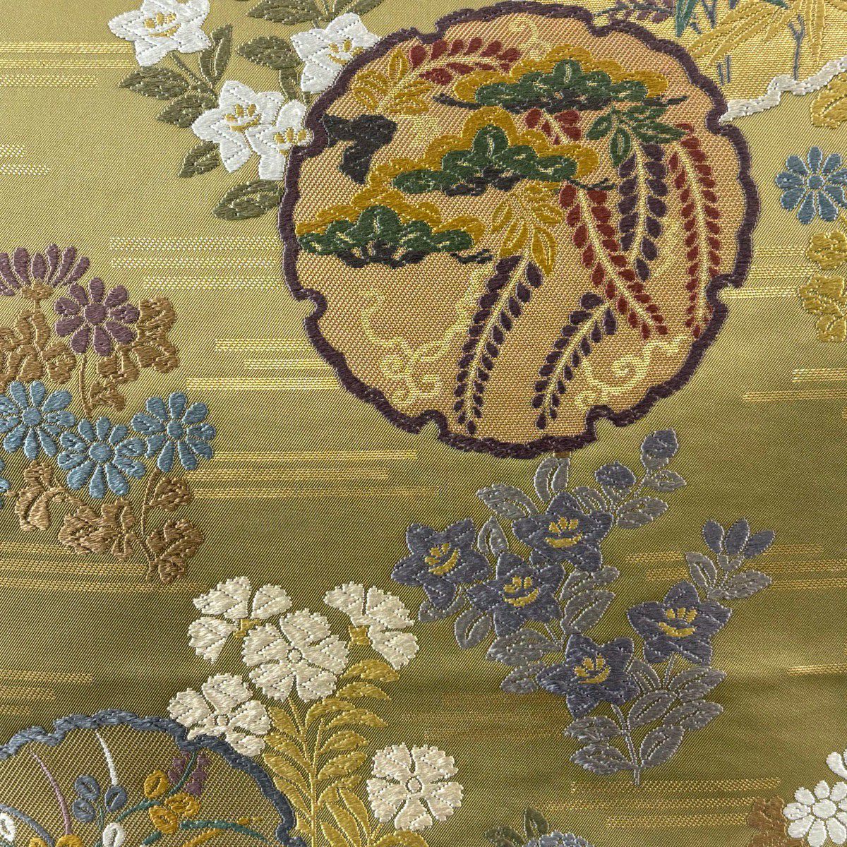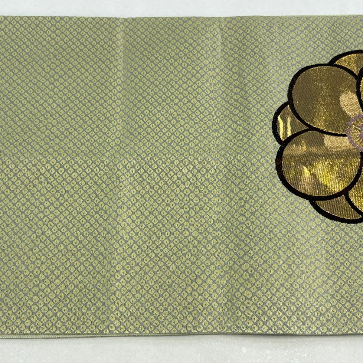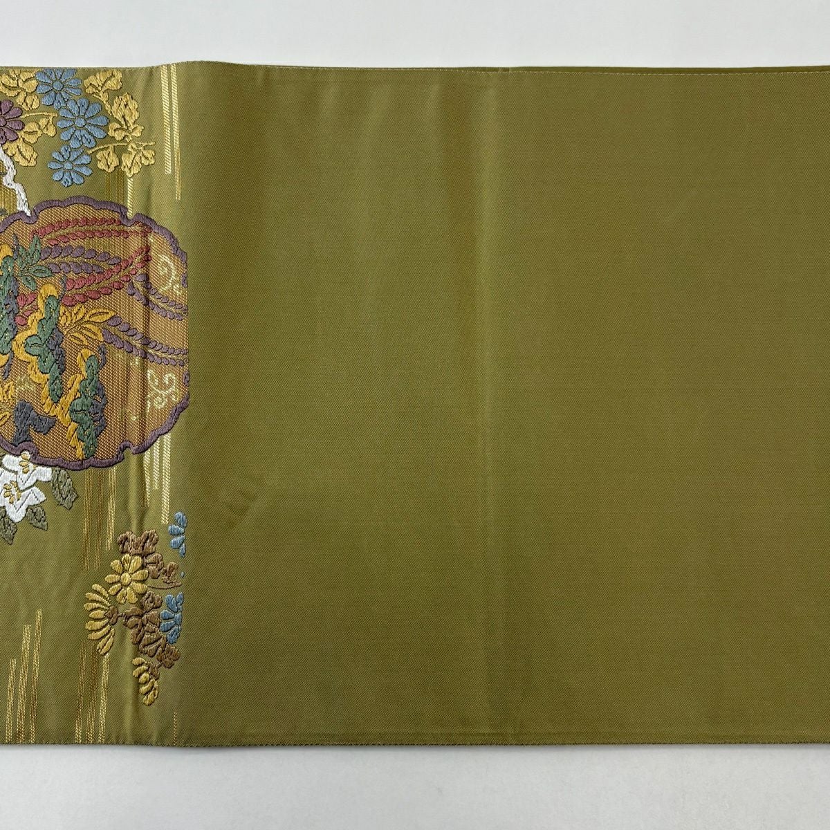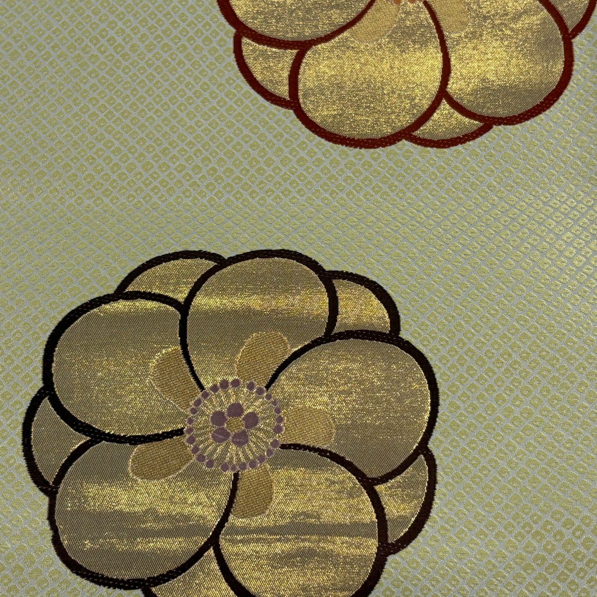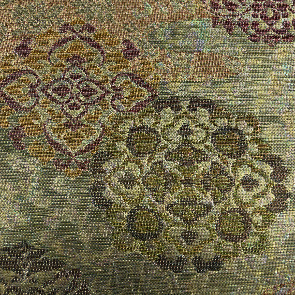 【美品】 袋帯 秀品 雪輪 草花 唐織 箔 鶯色 六通 正絹