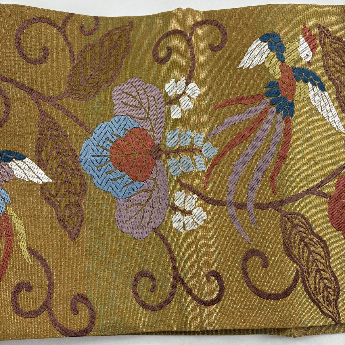 【美品】 袋帯 秀品 鳥 桐 金糸 箔 山吹茶色 六通 正絹